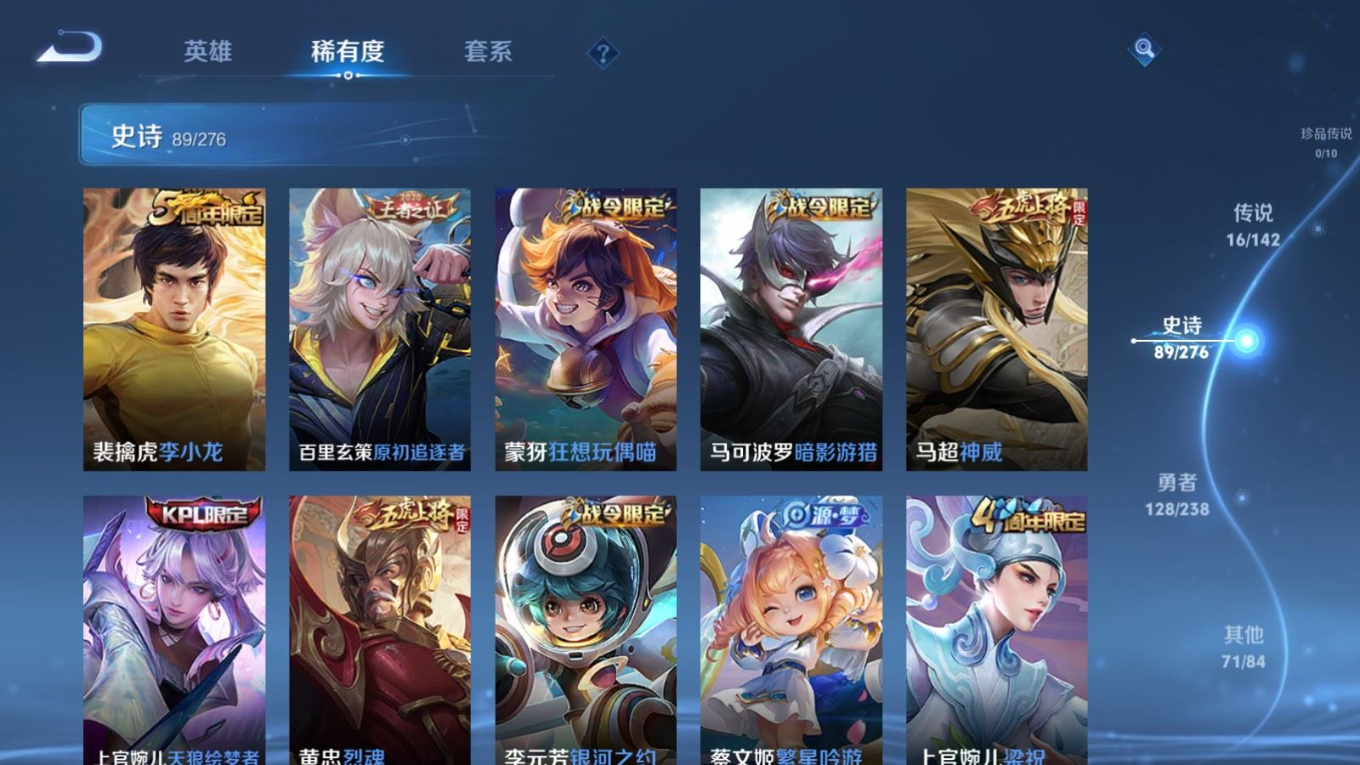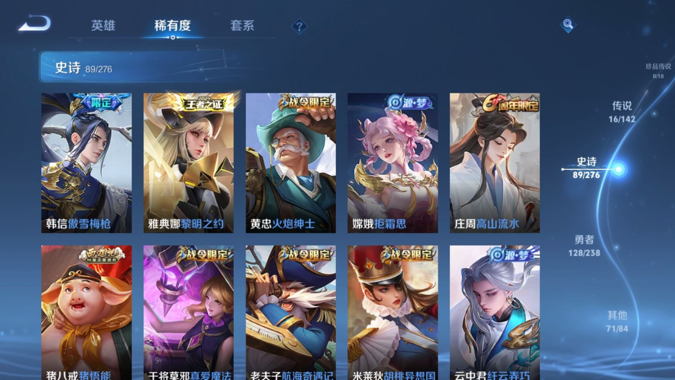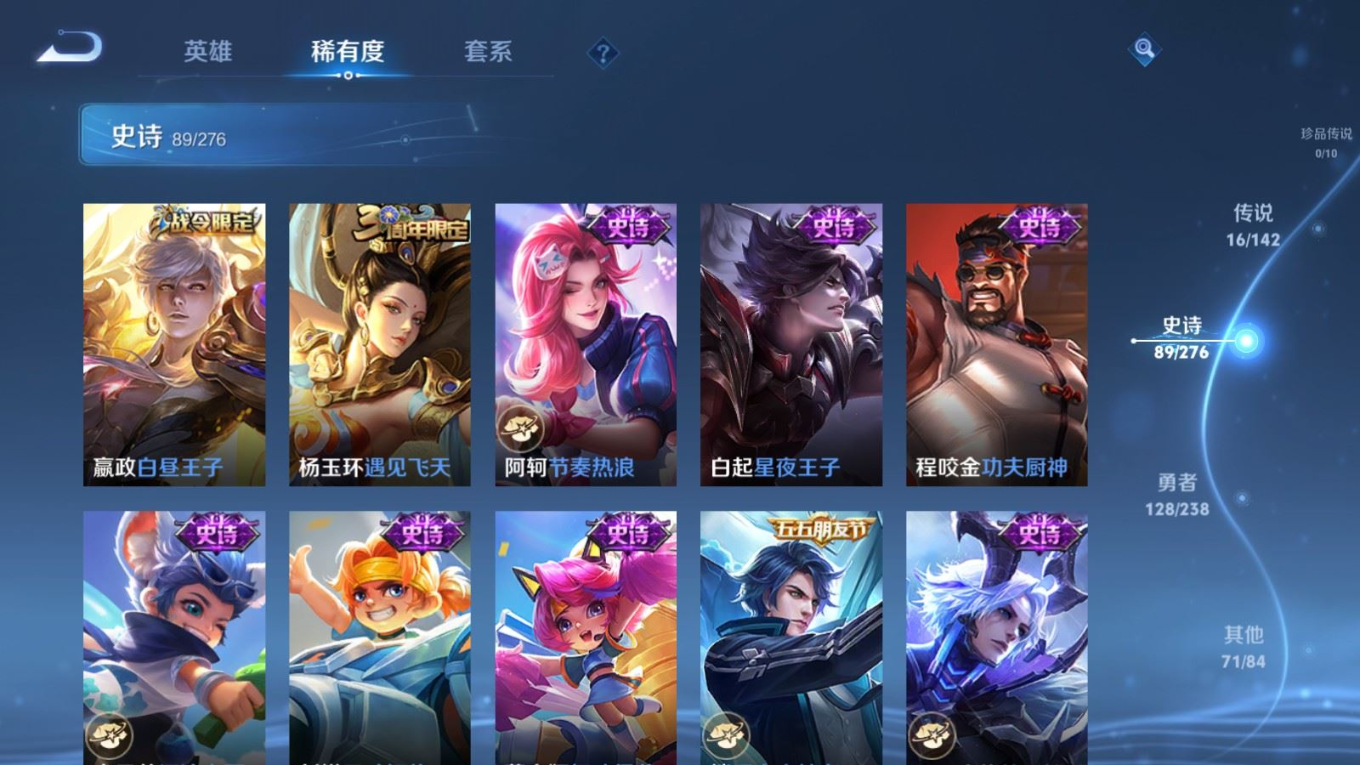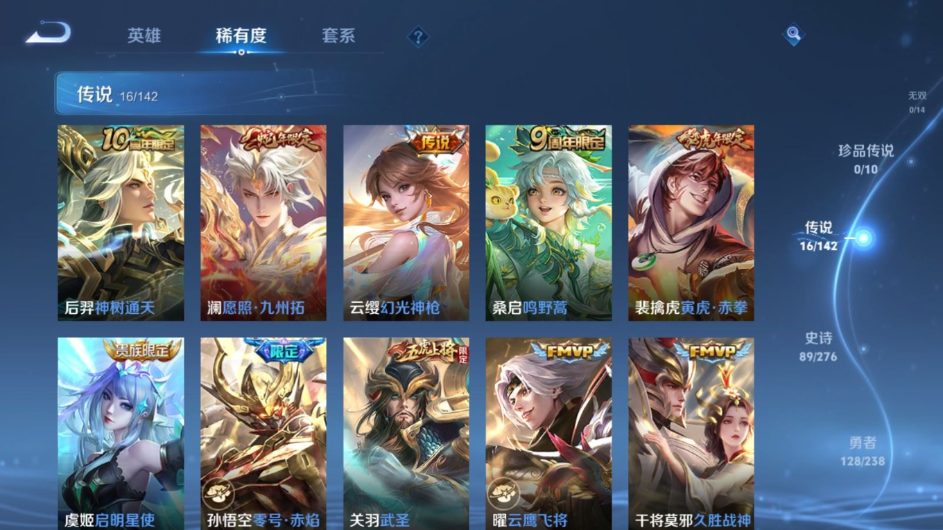 贵族等级:v8皮肤数:306传说品质16 生肖限定5 情人节限定3 荣耀典藏2 英雄数:127