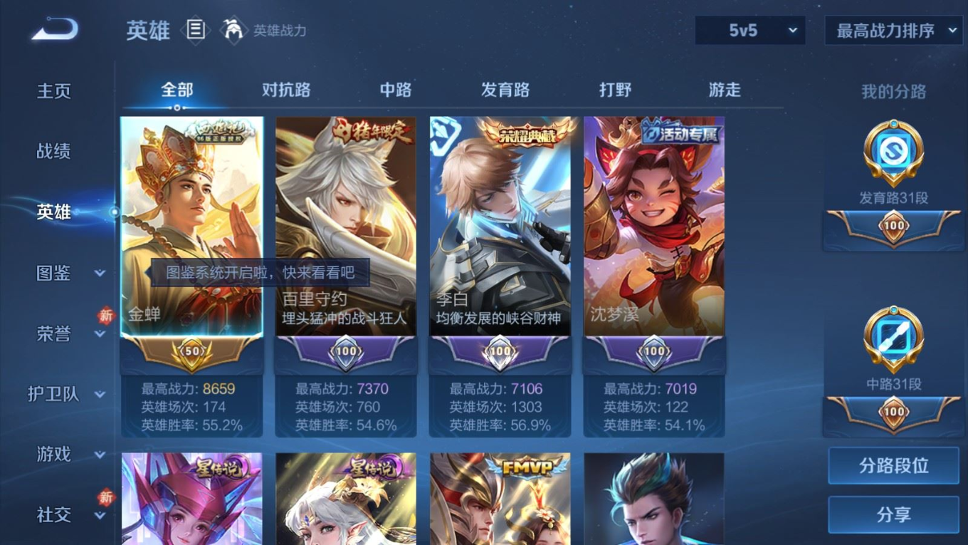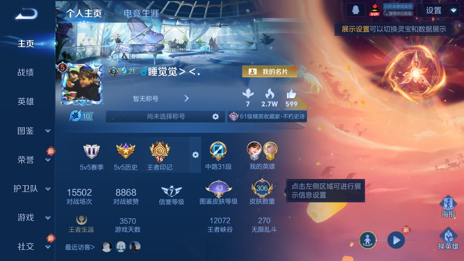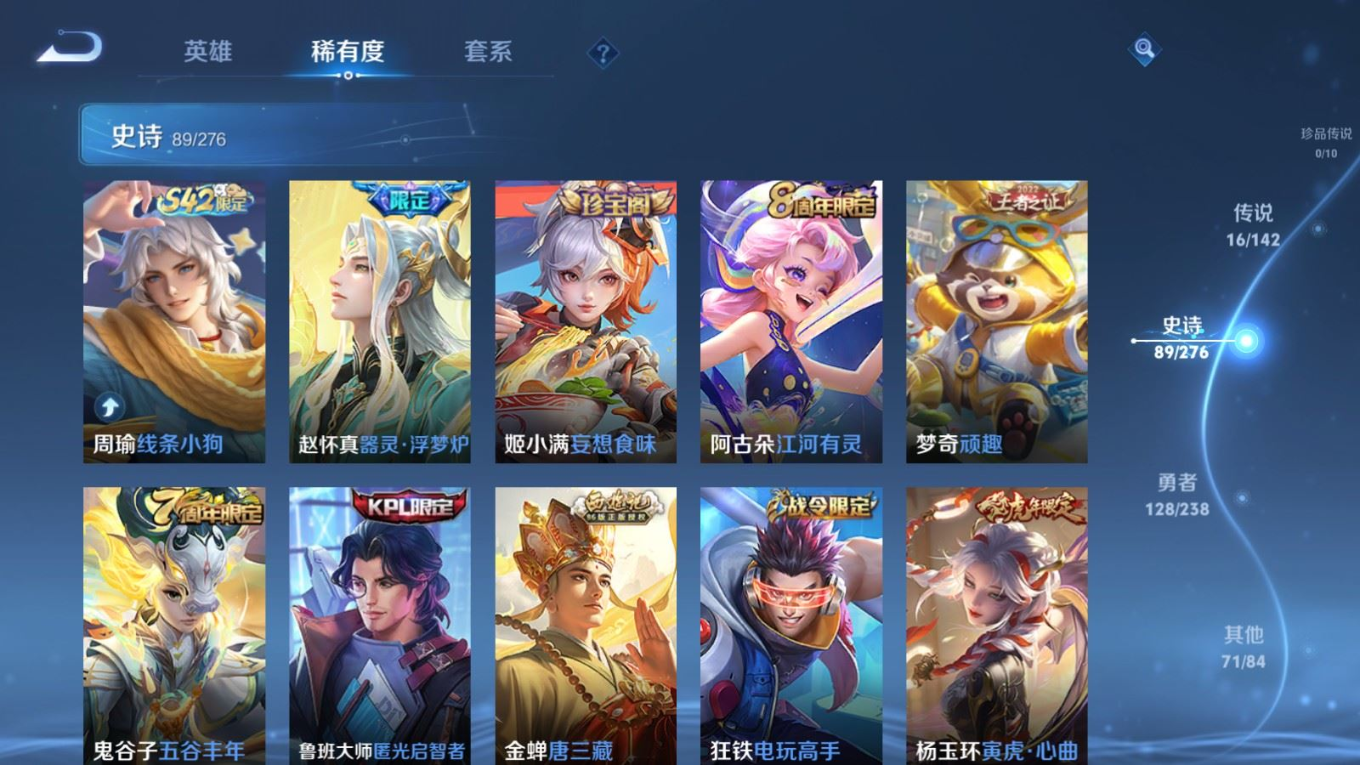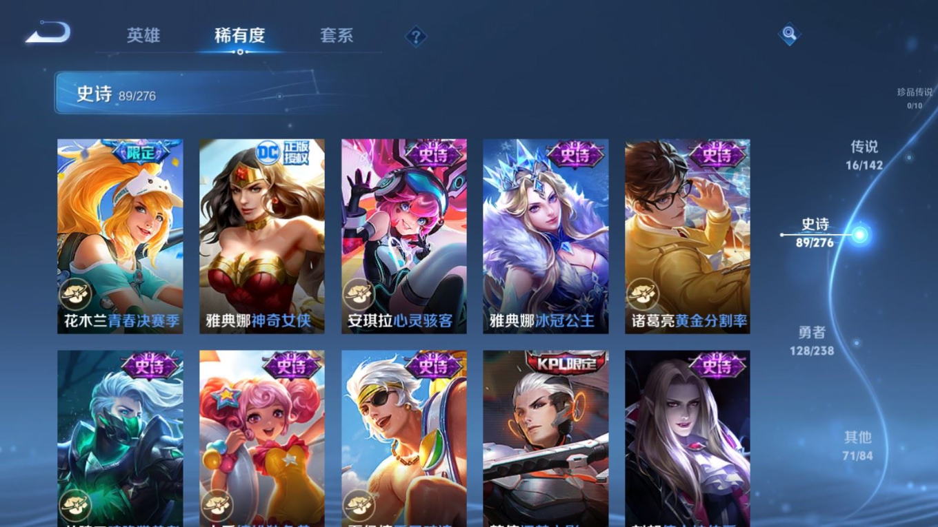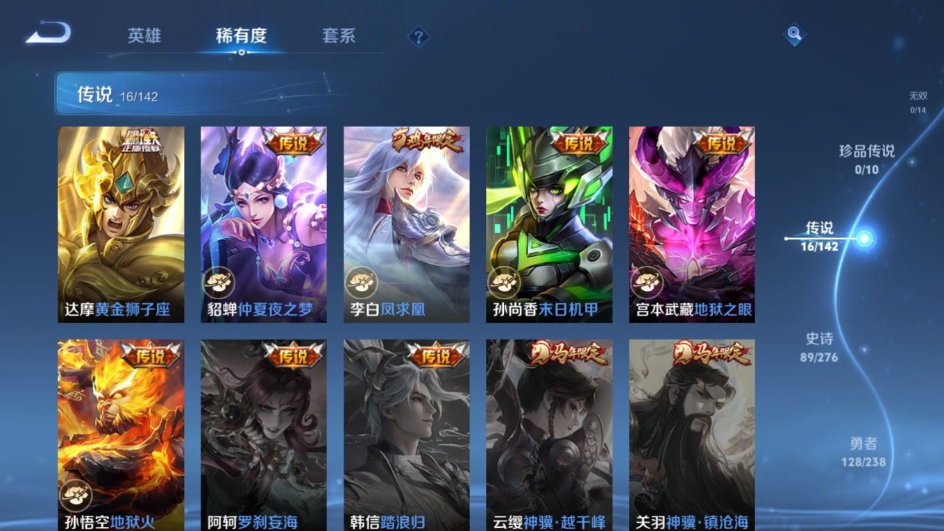 贵族等级:v8皮肤数:306传说品质16 生肖限定5 情人节限定3 荣耀典藏2 英雄数:127