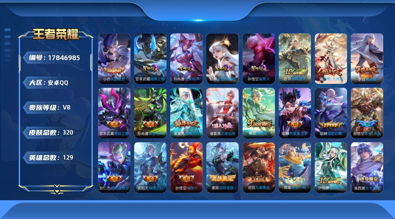 贵族等级:v8皮肤数:320生肖限定6 情人节限定4 传说品质15 荣耀典藏1 英雄数:129