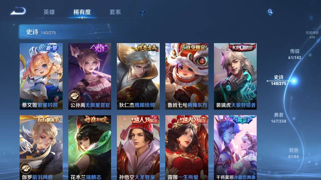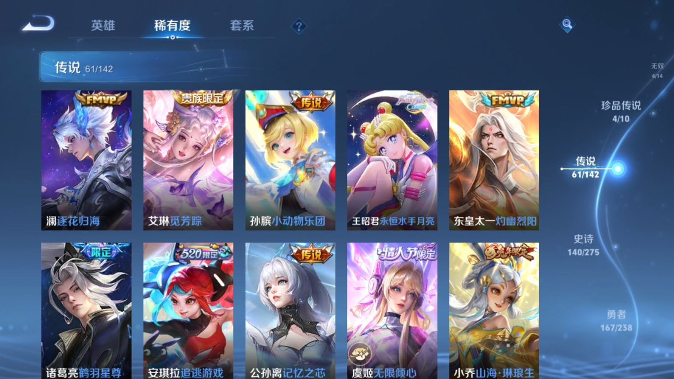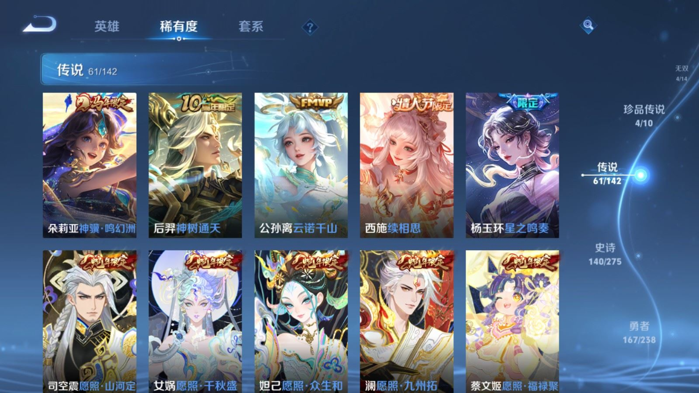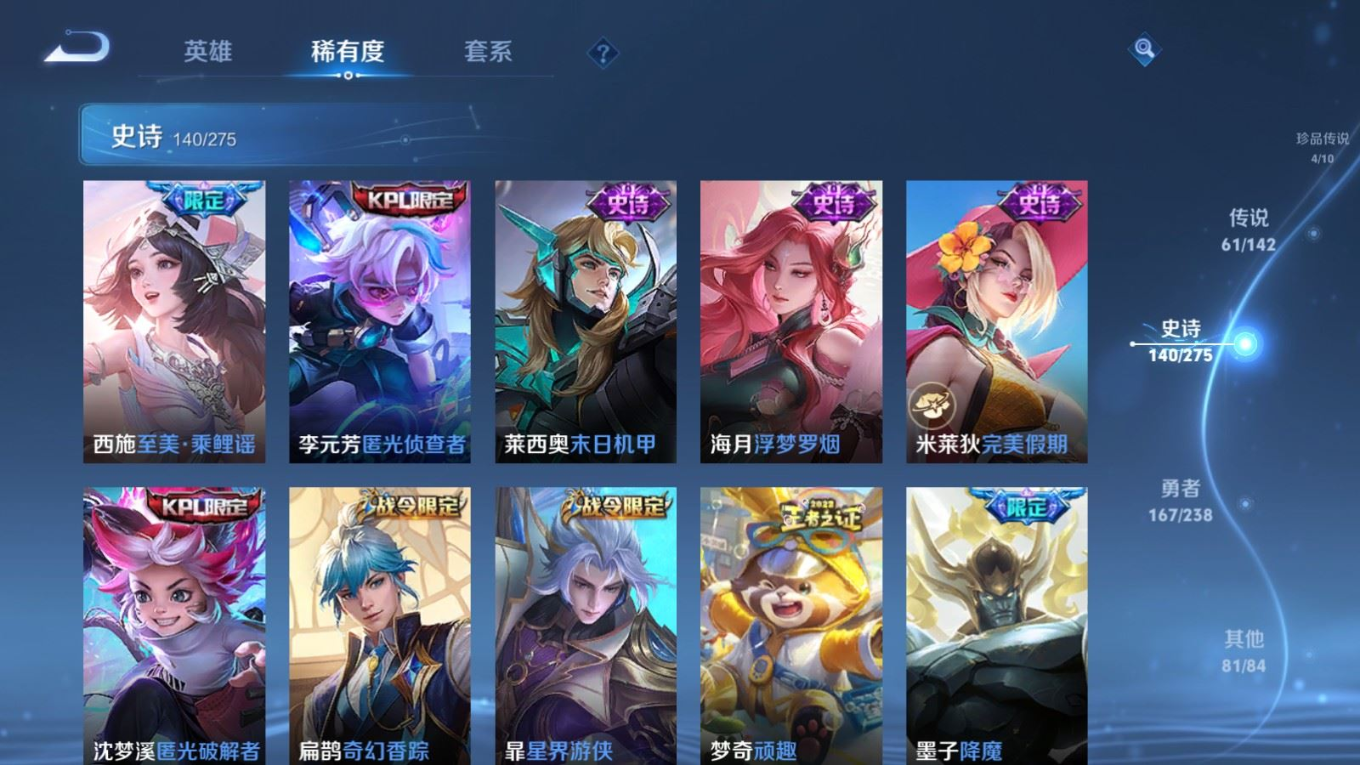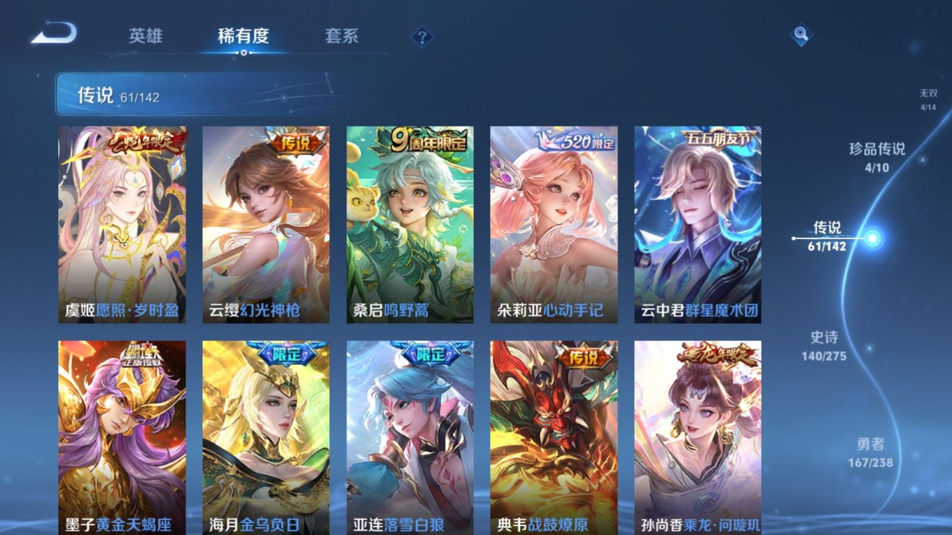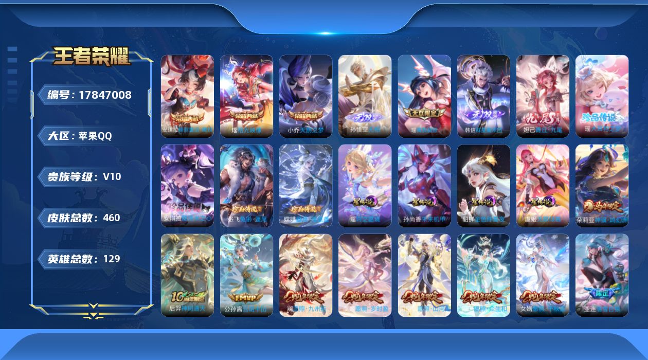 贵族等级:v10皮肤数:460生肖限定19 传说品质61 情人节限定8 无双4 荣耀典藏3 珍品传说4 英雄数:129