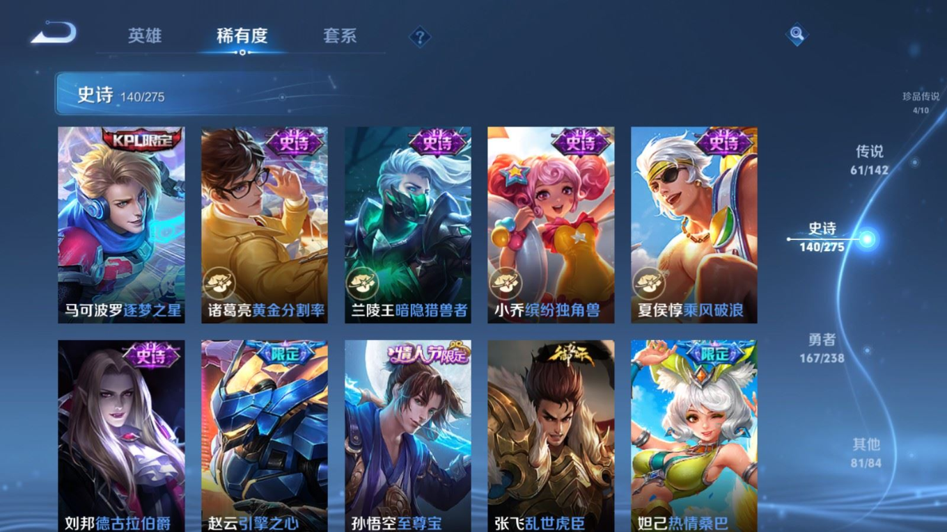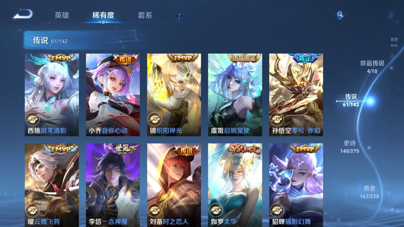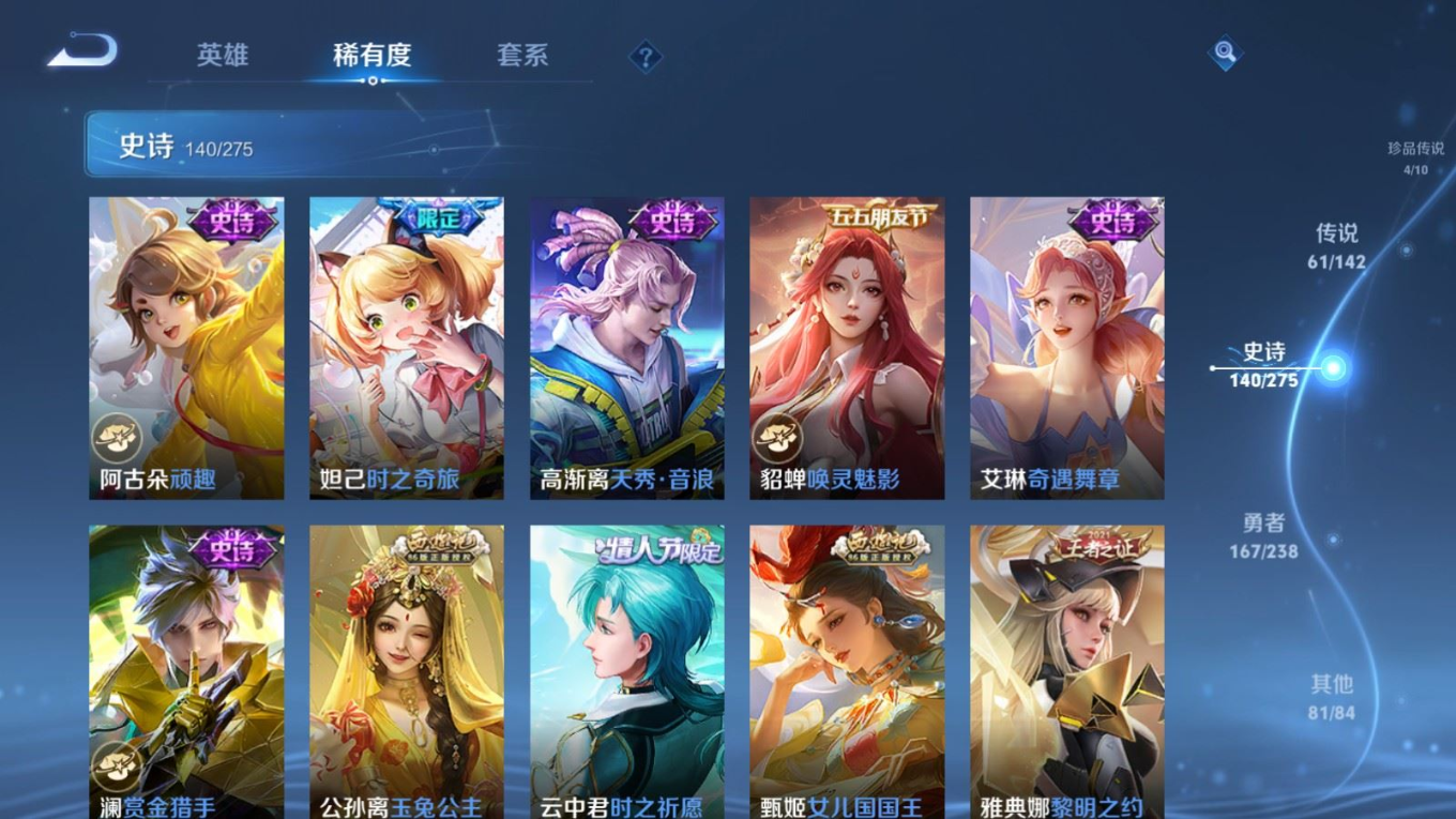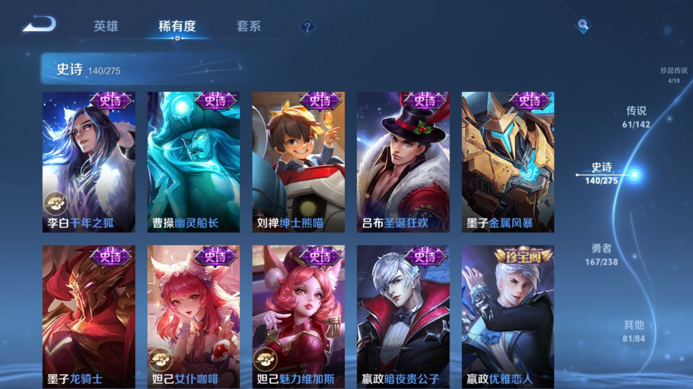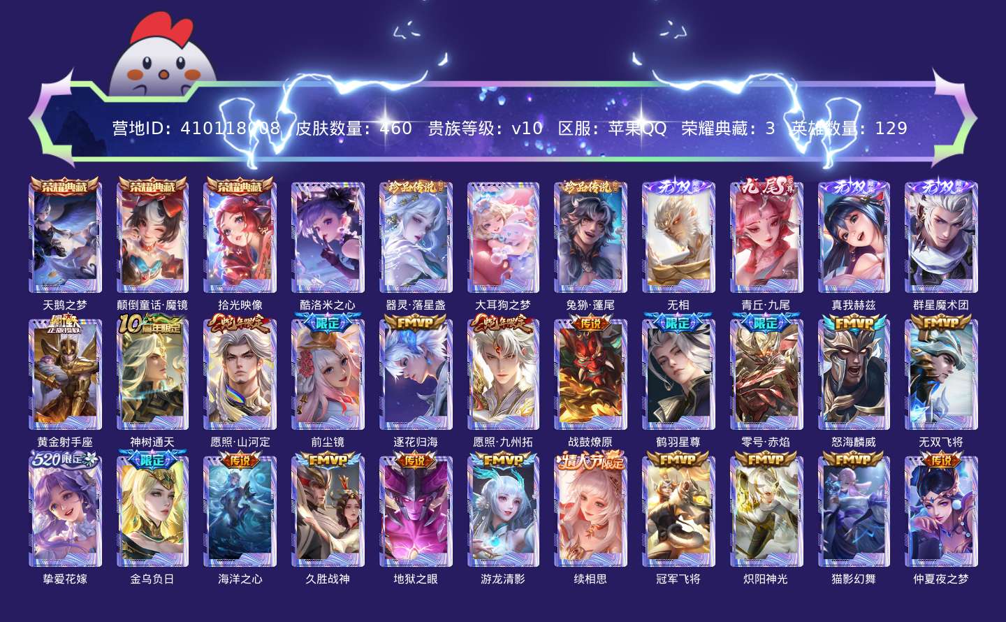 贵族等级:v10皮肤数:460生肖限定19 传说品质61 情人节限定8 无双4 荣耀典藏3 珍品传说4 英雄数:129