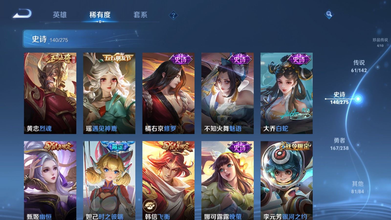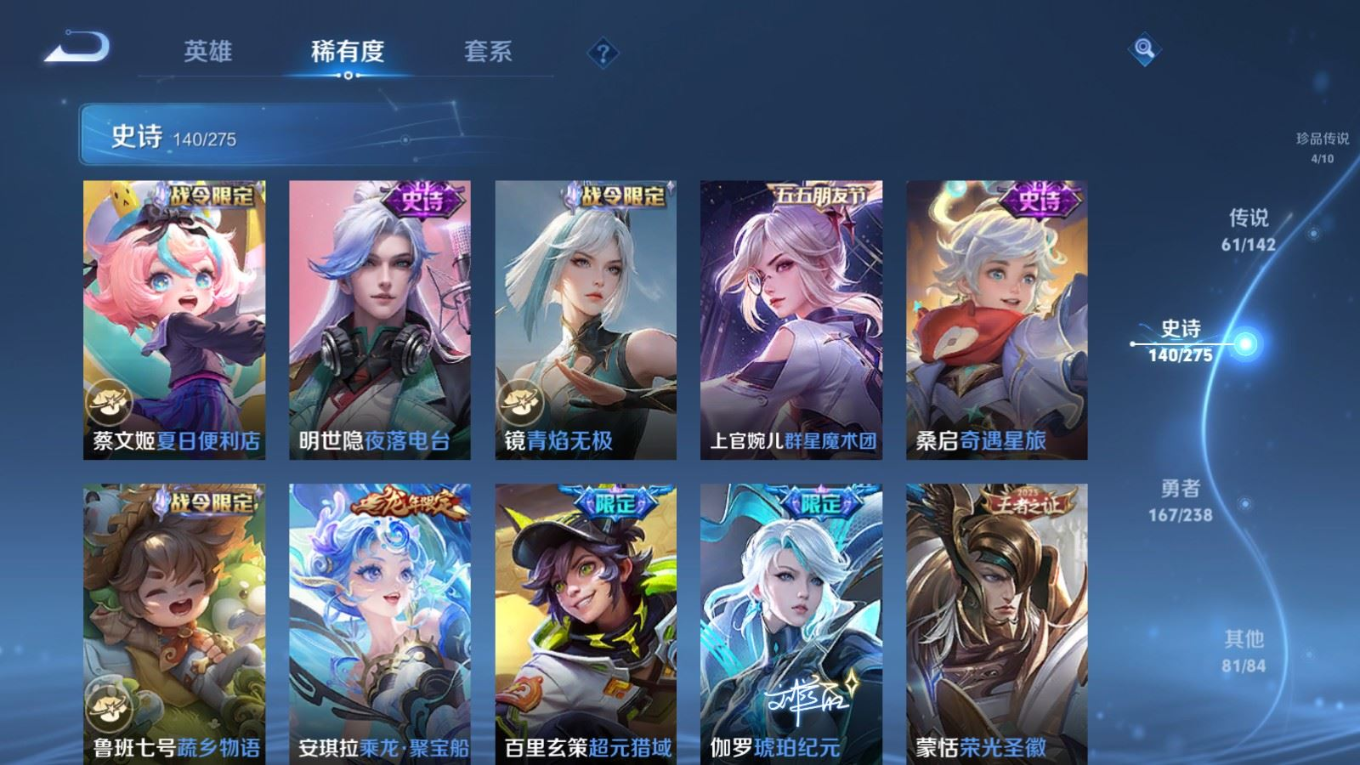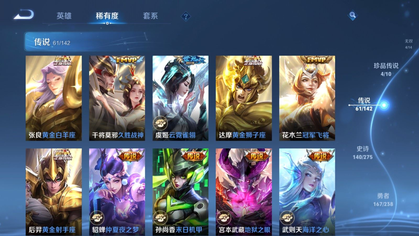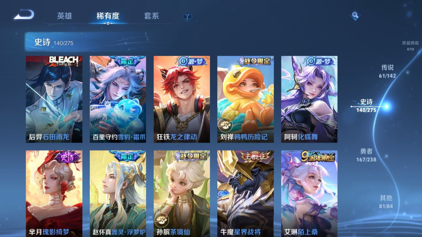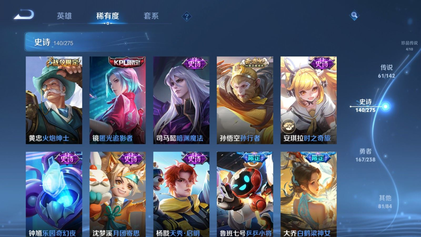 贵族等级:v10皮肤数:460生肖限定19 传说品质61 情人节限定8 无双4 荣耀典藏3 珍品传说4 英雄数:129