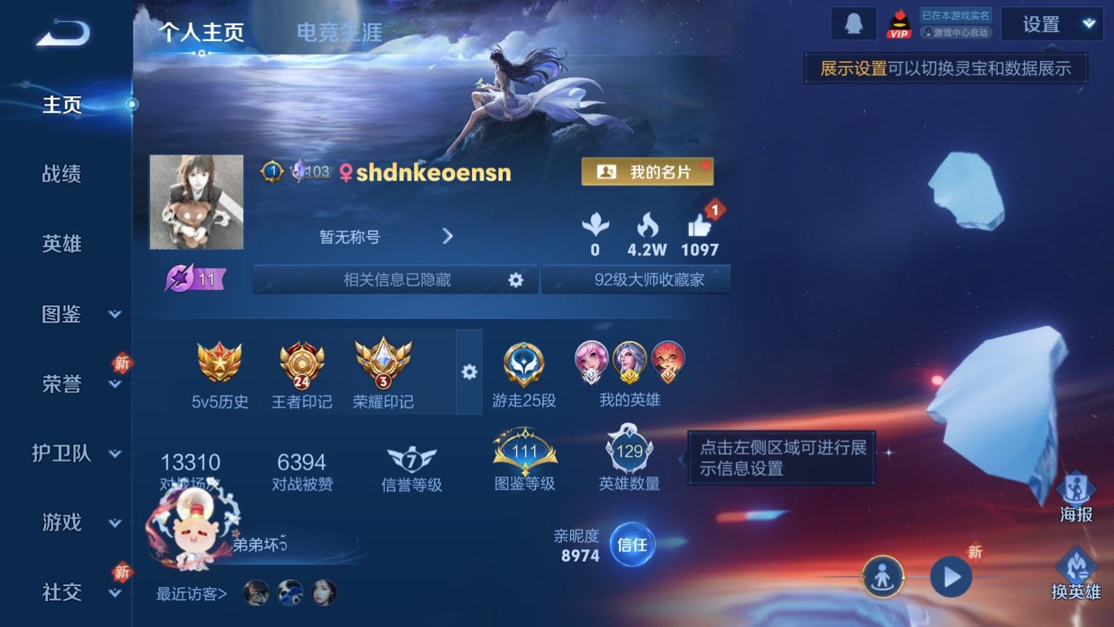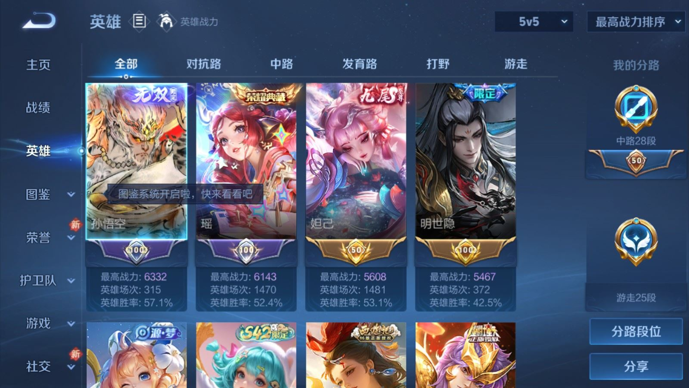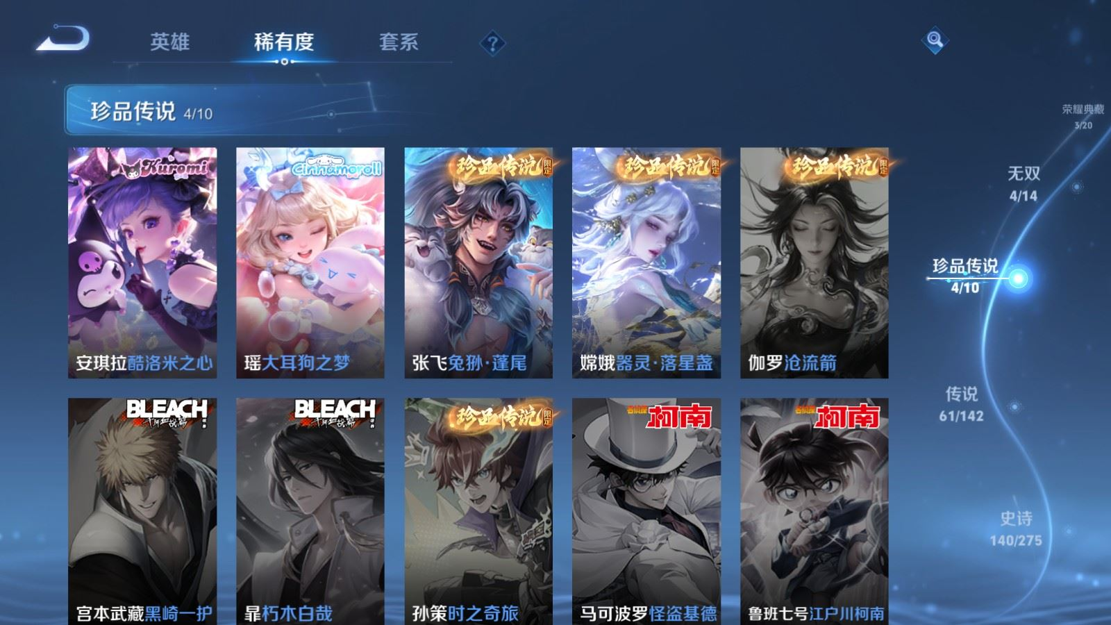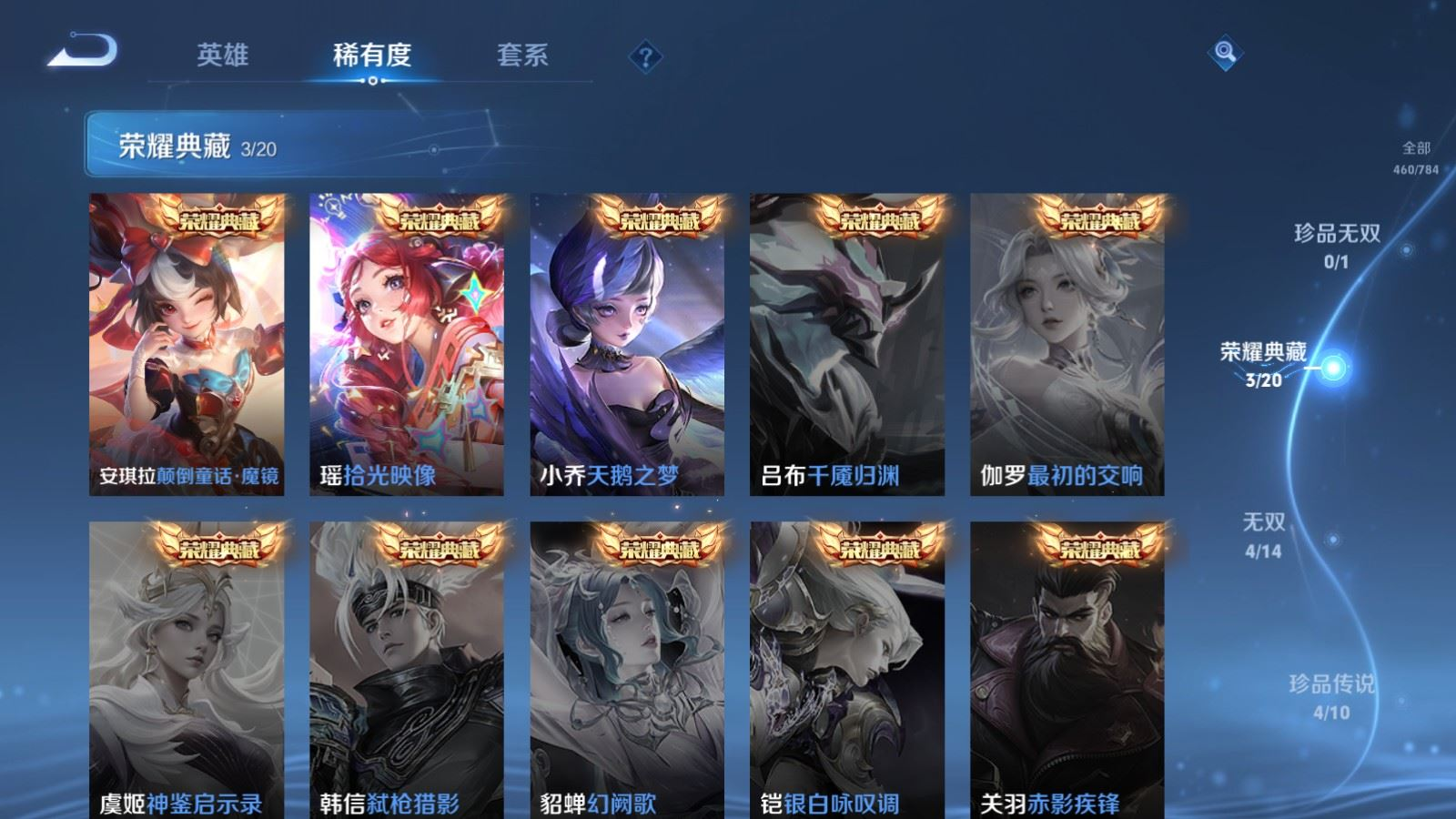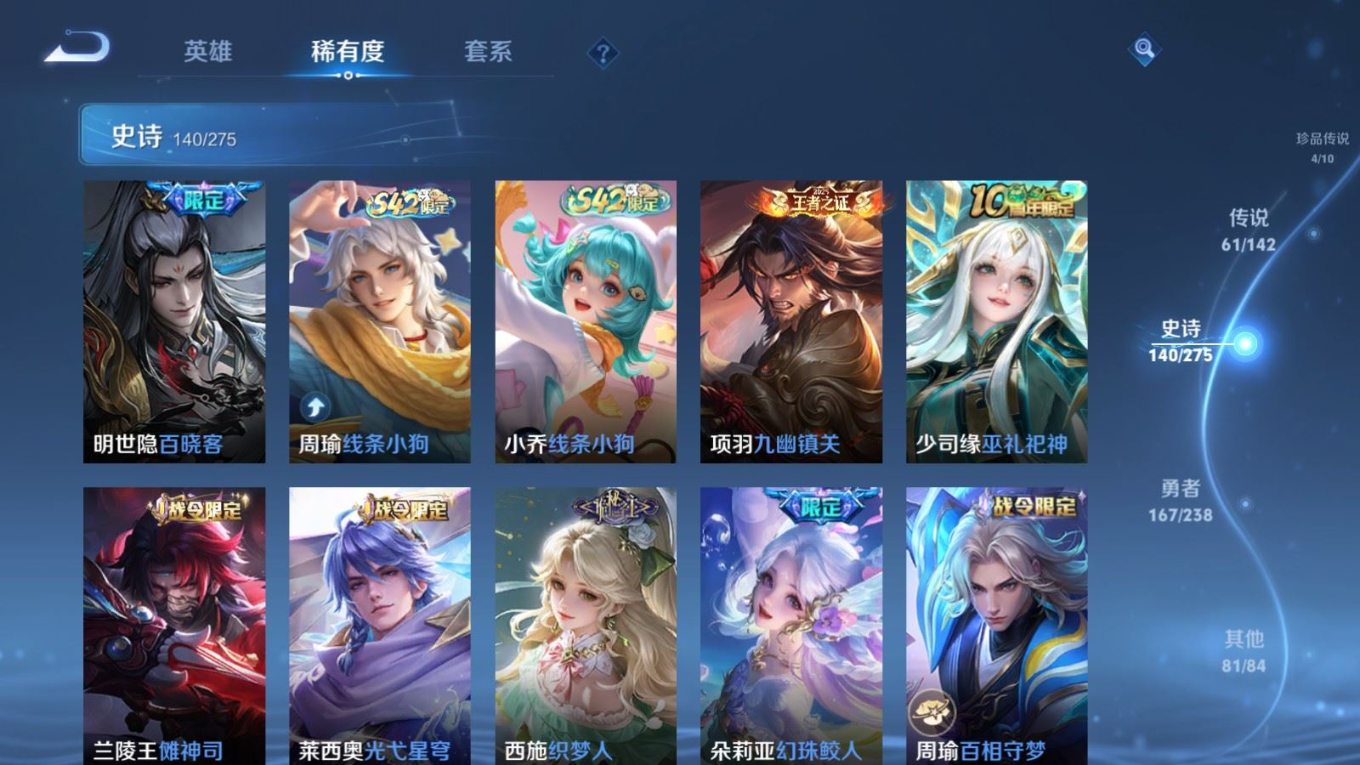 贵族等级:v10皮肤数:460生肖限定19 传说品质61 情人节限定8 无双4 荣耀典藏3 珍品传说4 英雄数:129