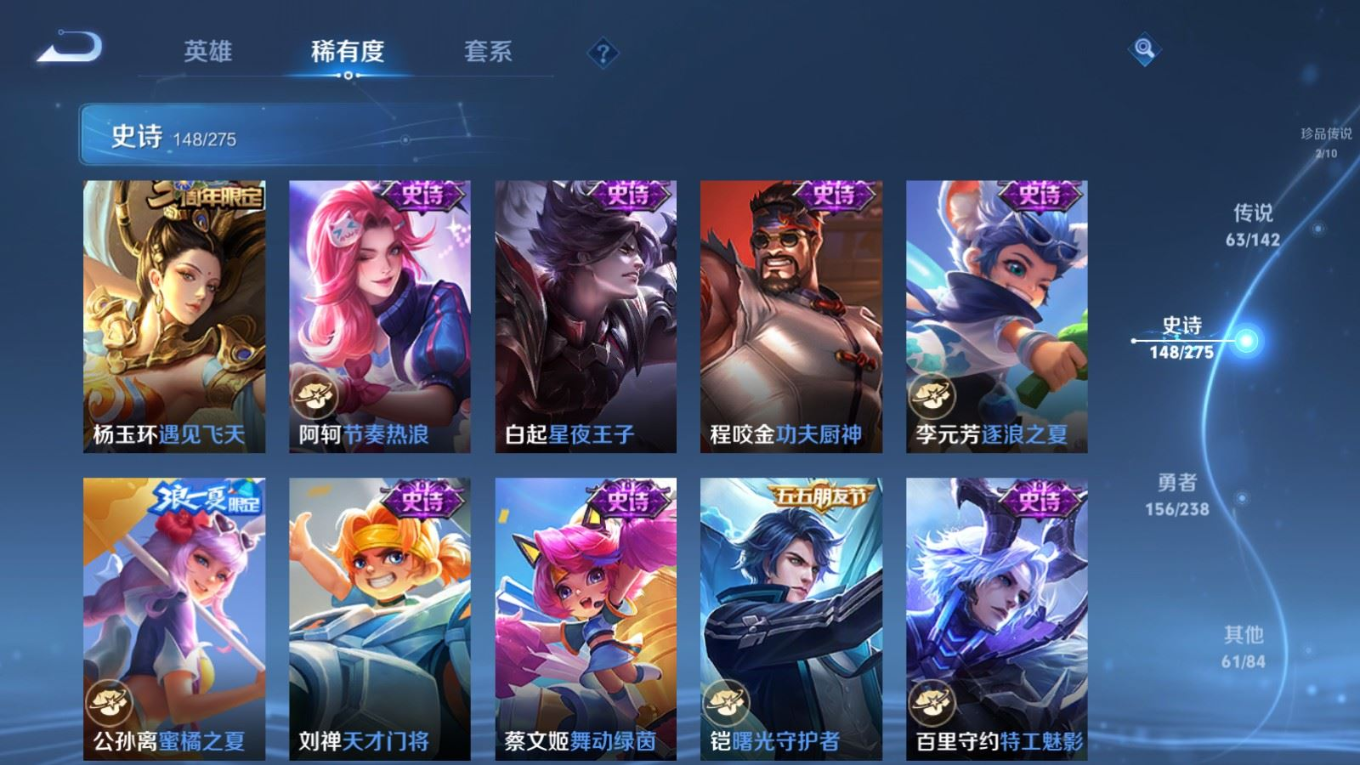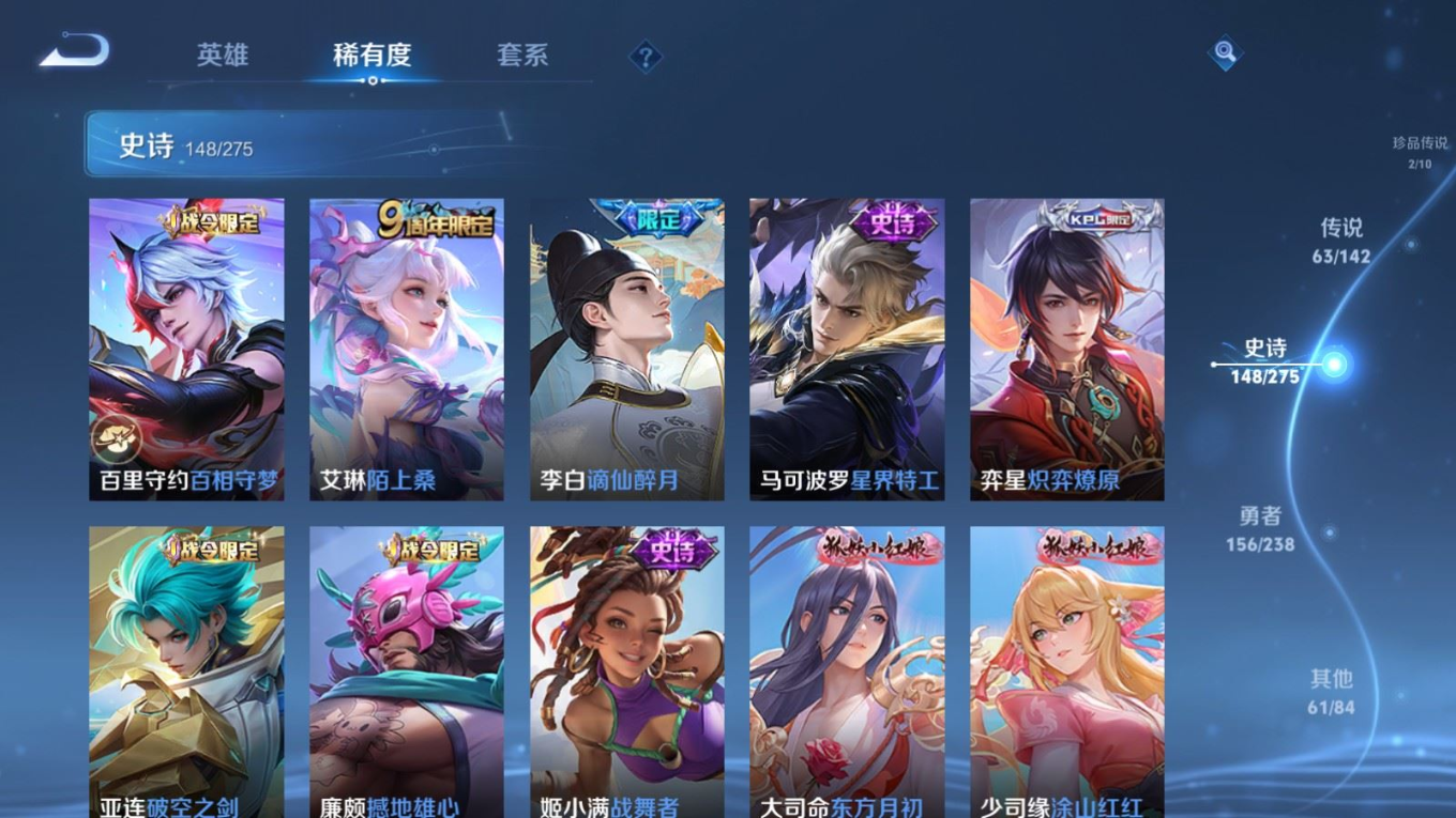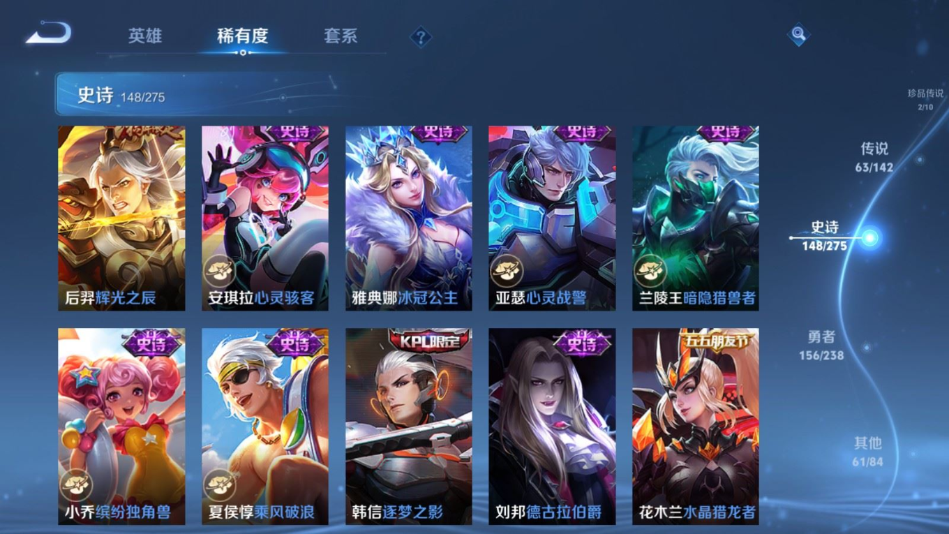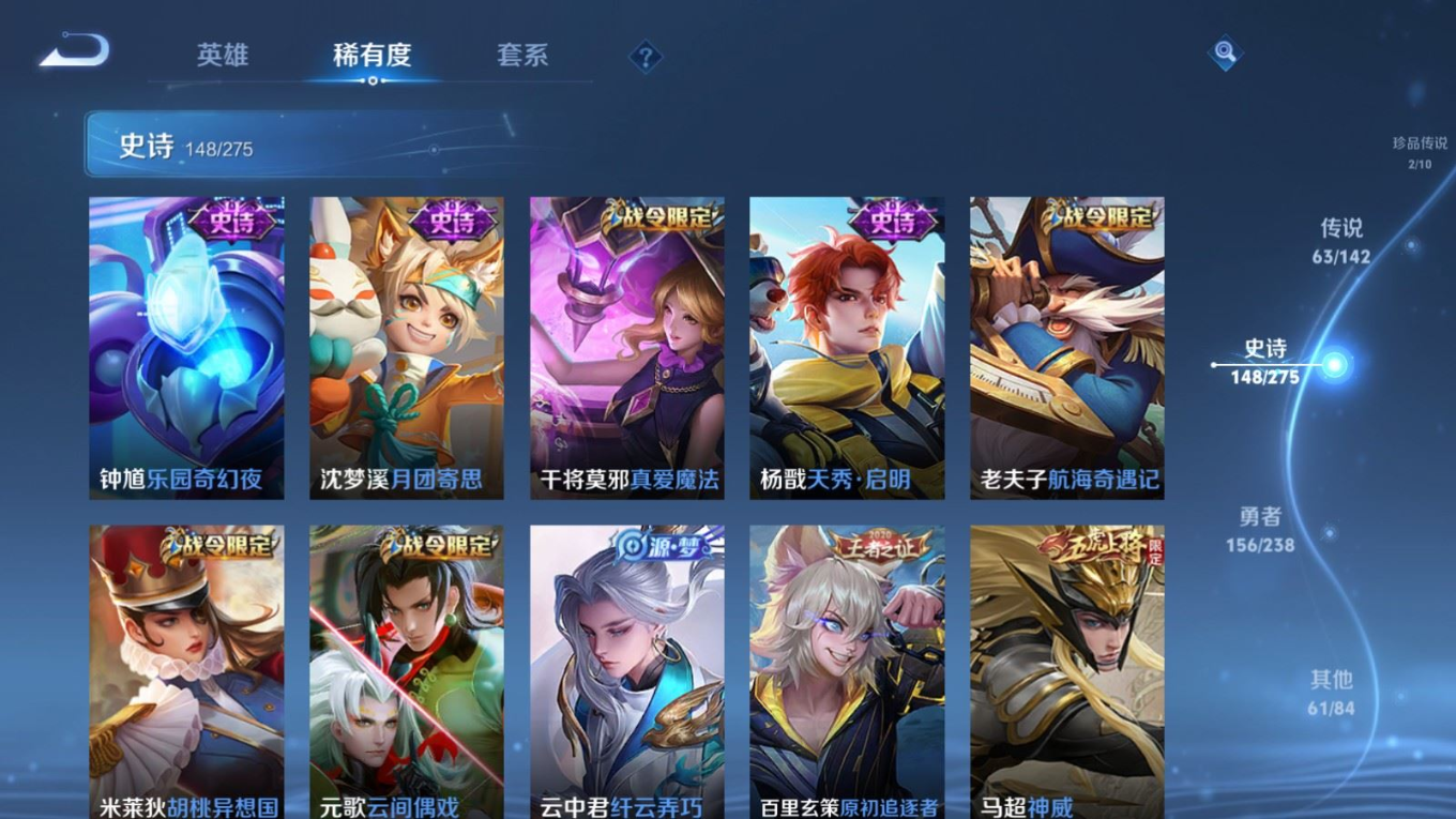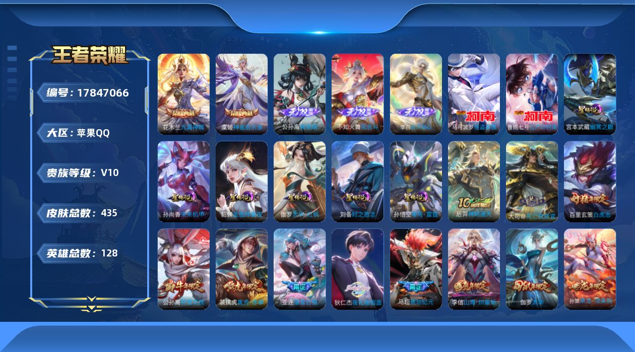贵族等级:v10皮肤数:435生肖限定18 情人节限定3 传说品质63 荣耀典藏2 无双3 珍品传说2 英雄数:128