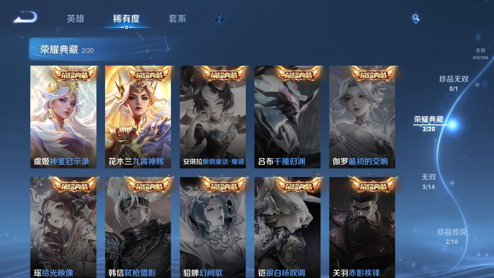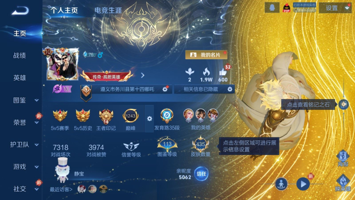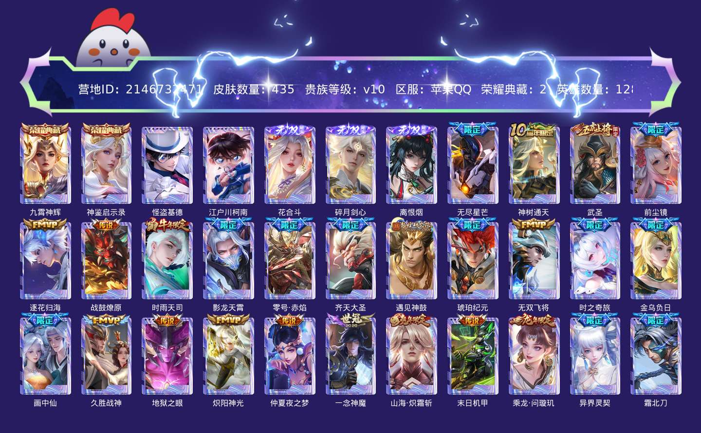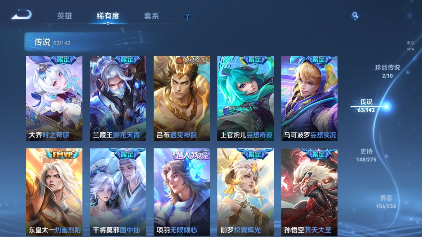 贵族等级:v10皮肤数:435生肖限定18 情人节限定3 传说品质63 荣耀典藏2 无双3 珍品传说2 英雄数:128