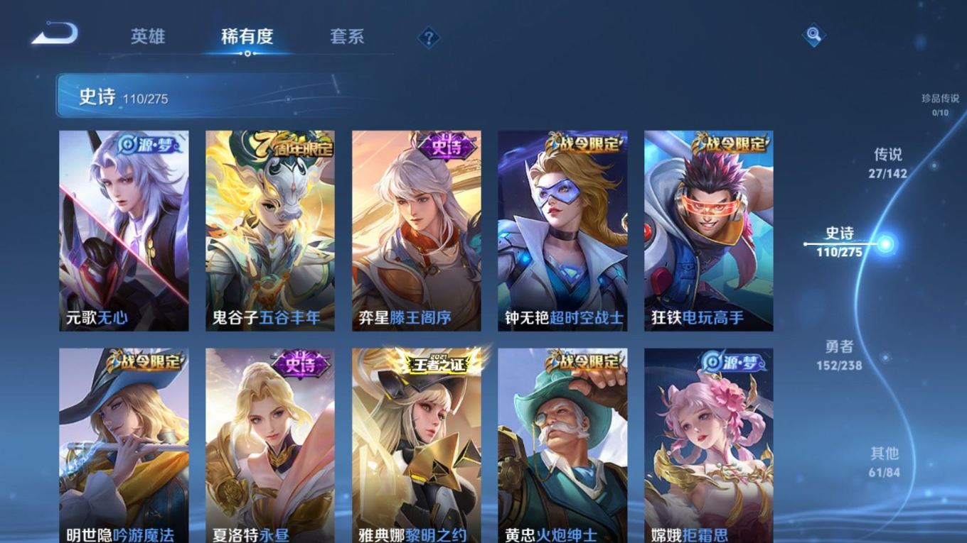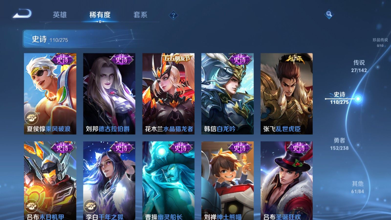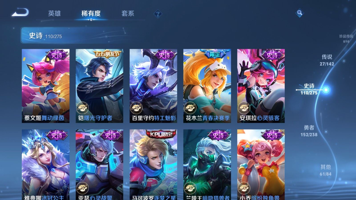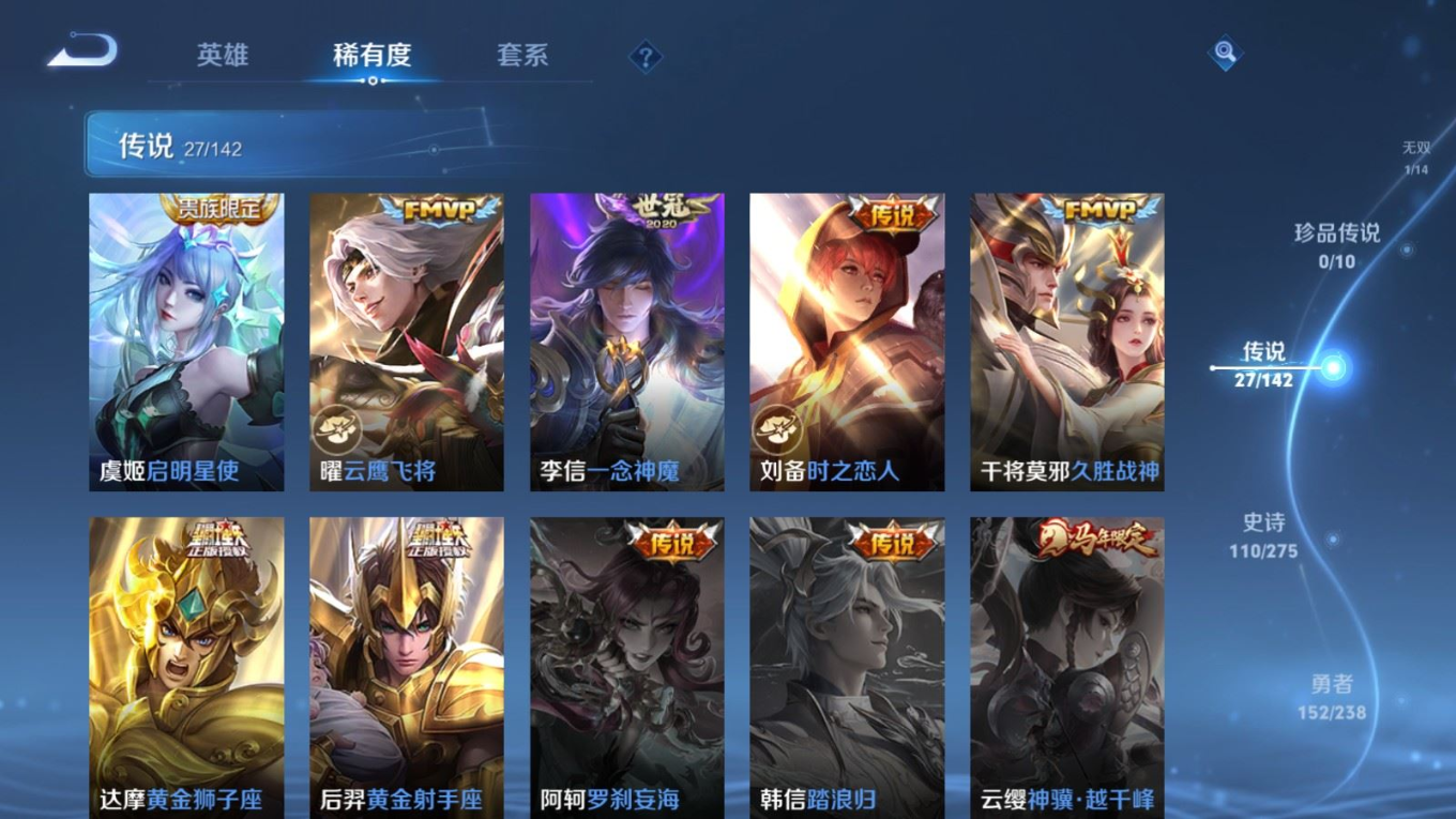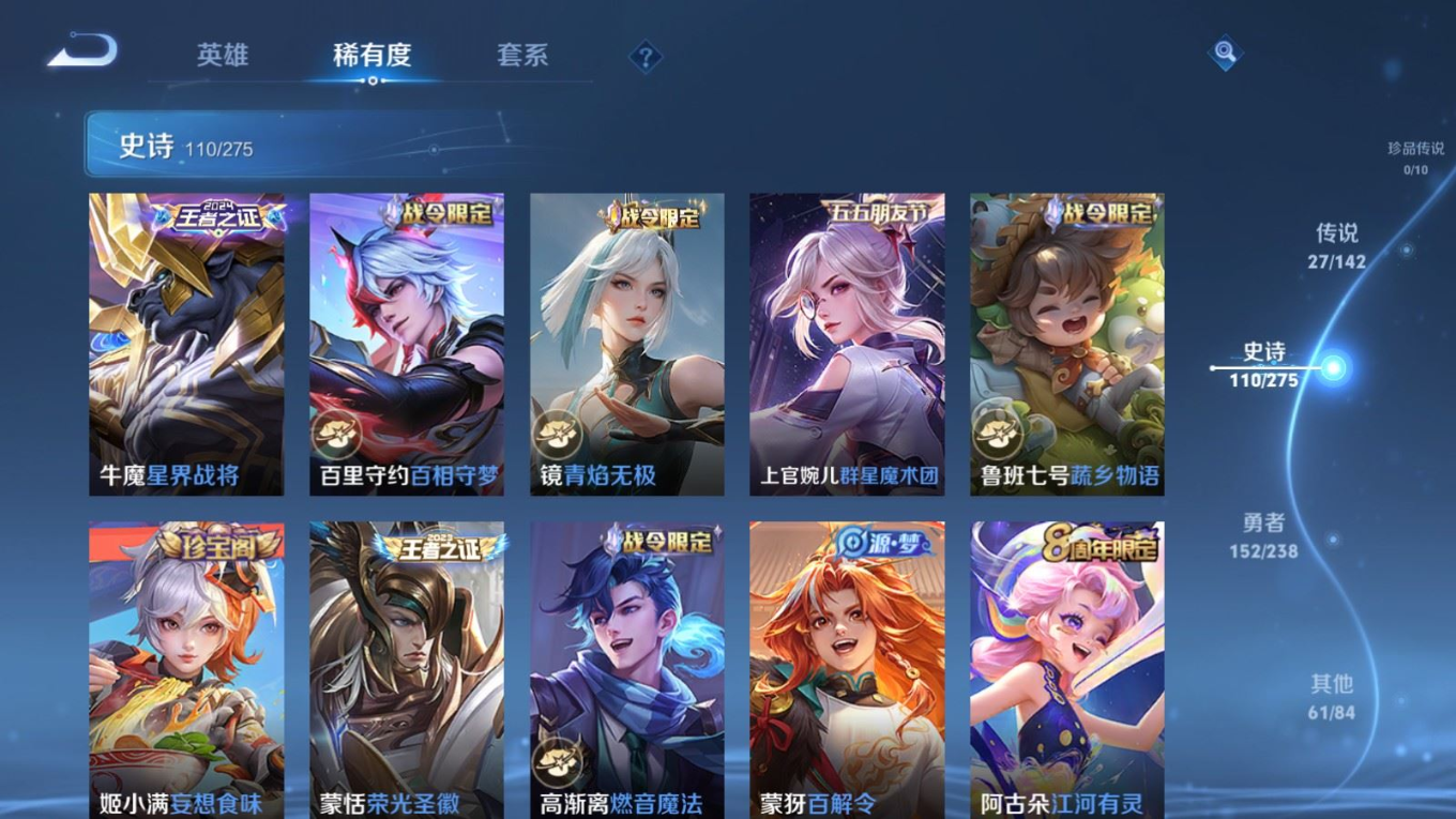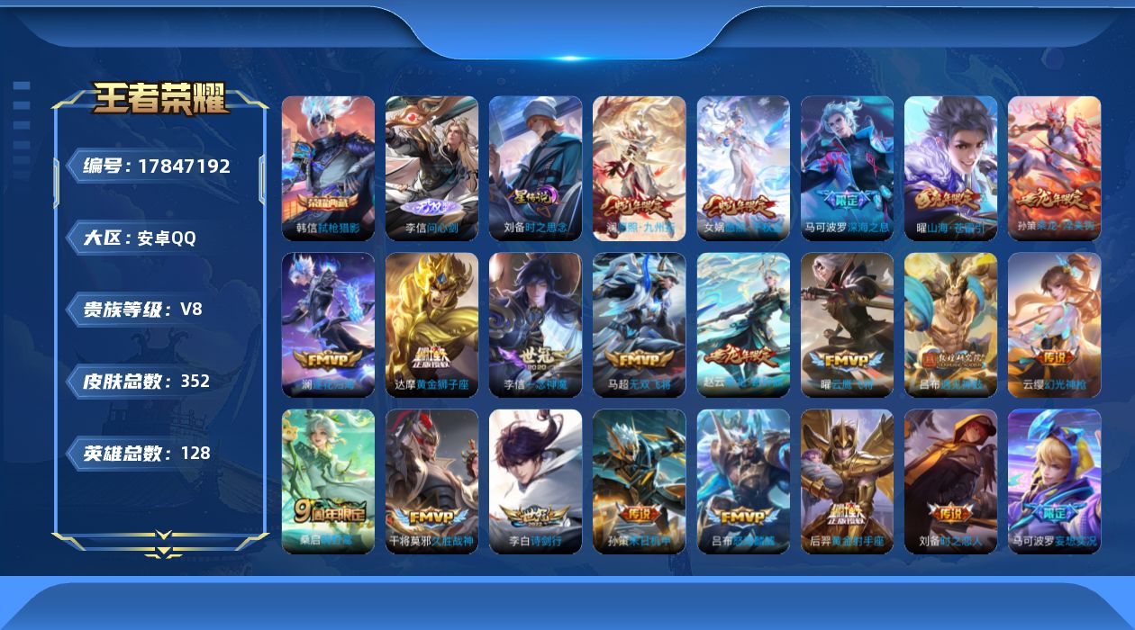 贵族等级:v8皮肤数:352传说品质27 情人节限定1 生肖限定5 无双1 荣耀典藏1 英雄数:128