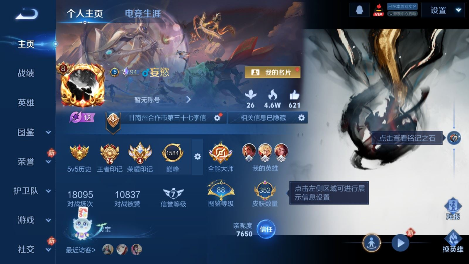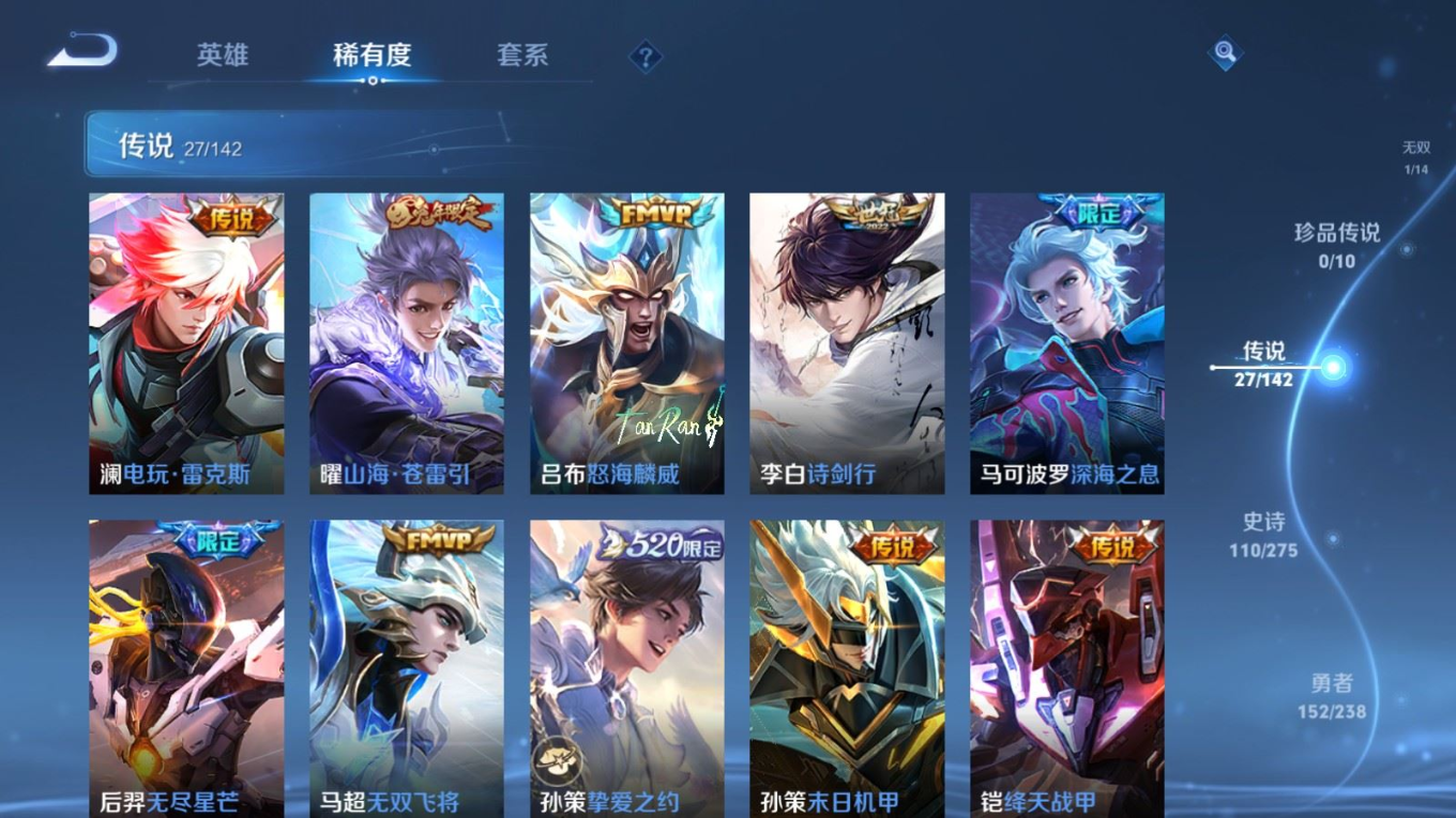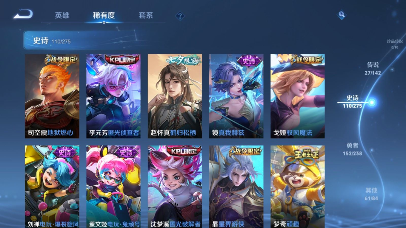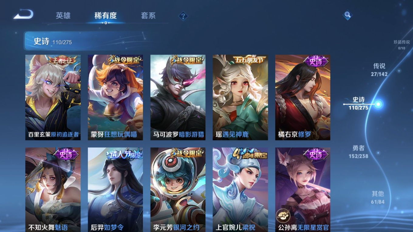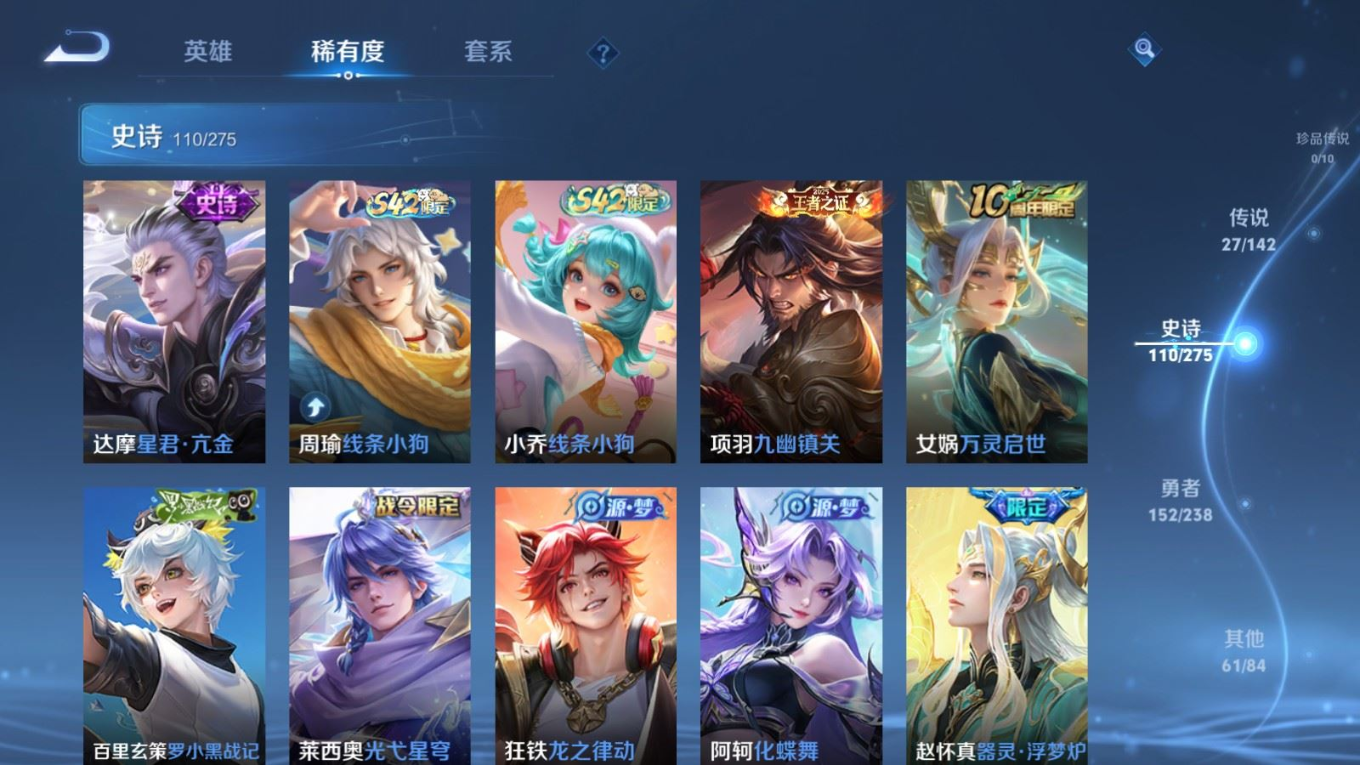 贵族等级:v8皮肤数:352传说品质27 情人节限定1 生肖限定5 无双1 荣耀典藏1 英雄数:128