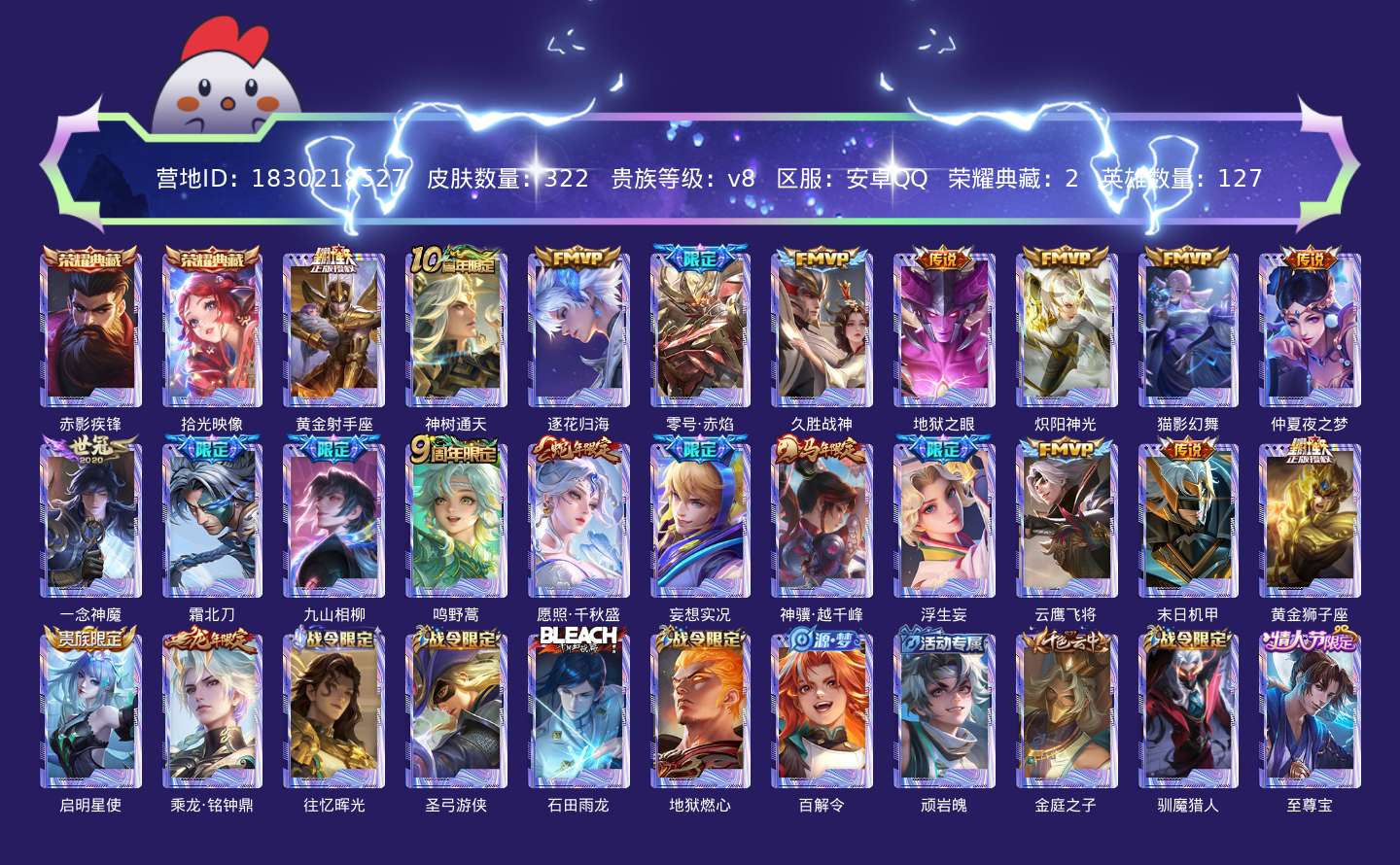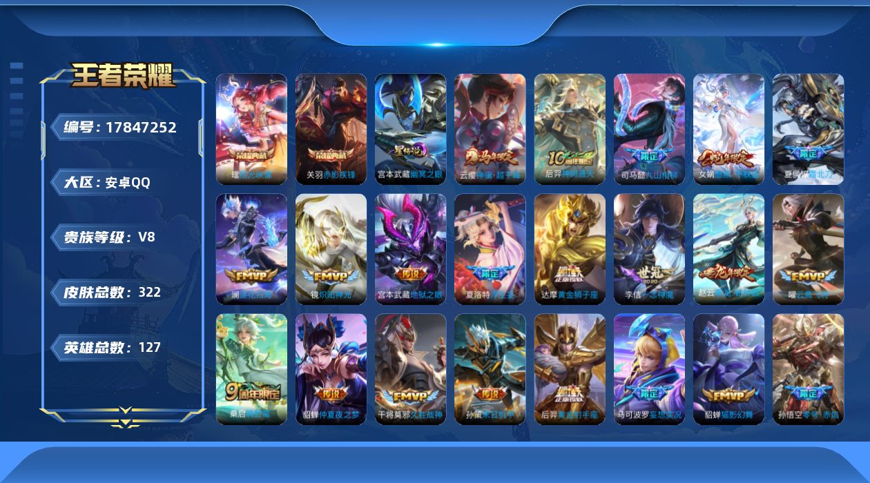 贵族等级:v8皮肤数:322传说品质22 荣耀典藏2 情人节限定1 生肖限定4 英雄数:127