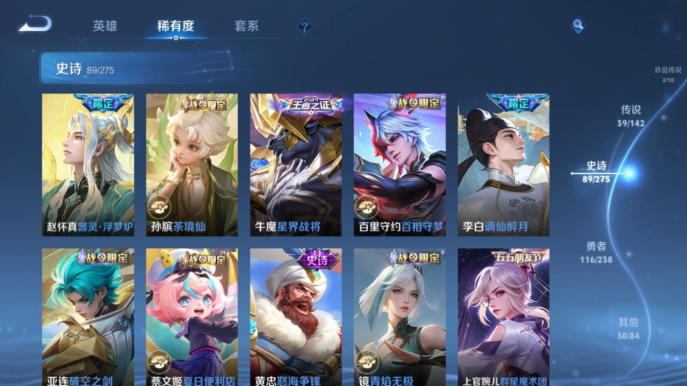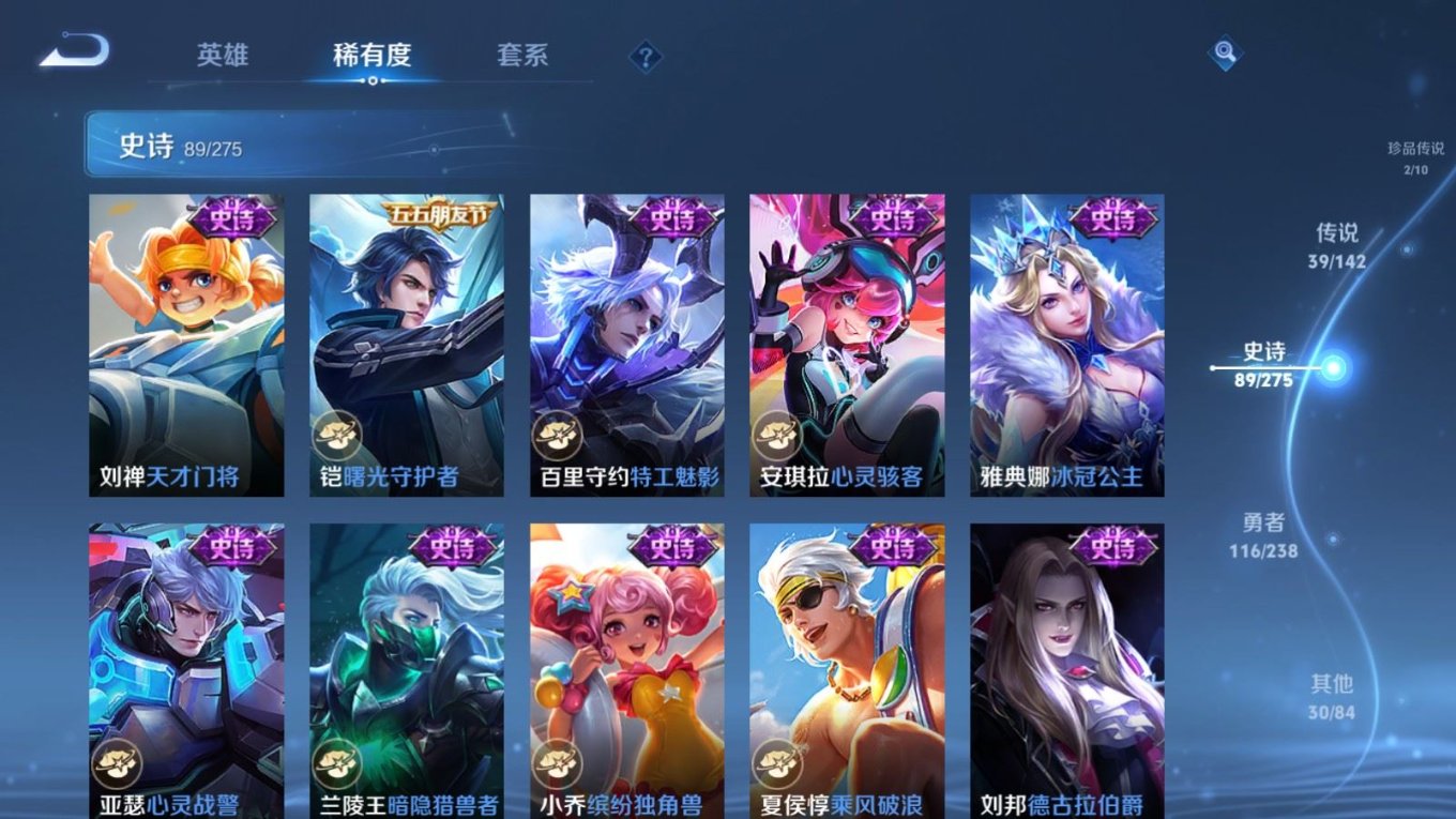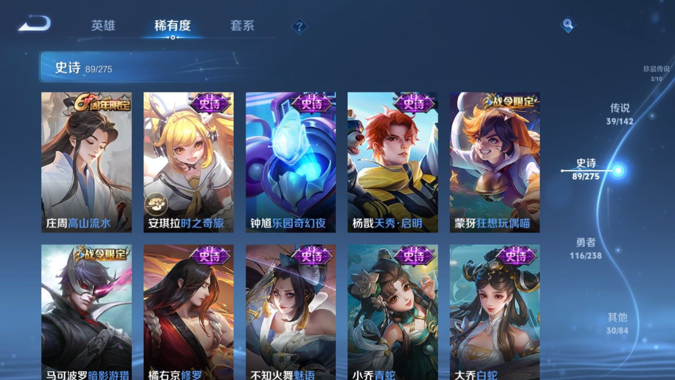 传说品质_后羿_神树通天传说品质_司空震_愿照·山河定传说品质_澜_愿照·九州拓传说品质_典韦_战鼓燎原传说品质_孙悟空_零号·赤焰传说品质_孙悟空_地狱火传说品质_吕布_怒海麟威传说品质_马超_琥珀纪元传说品质_干将莫邪_画中仙传说品质_干将莫邪_久胜战神传说品质_宫本武藏_地狱之眼传说品质_镜_炽阳神光传说品质_不知火舞_绯月行传说品质_貂蝉_仲夏夜之梦传说品质_李信_山海·炽霜斩传说品质_孙尚香_音你闪耀传说品质_孙尚香_异界灵契传说品质_夏侯惇_霜北刀传说品质_桑启_鸣野蒿传说品质_橘右京_枫霜尽传说品质_女娲_愿照·千秋盛传说品质_墨子_黄金天蝎座传说品质_杨玉环_星之鸣奏传说品质_马可波罗_深海之息传说品质_妲己_愿照·众生和传说品质_云缨_幻光神枪传说品质_瑶_时之祈愿传说品质_蔡文姬_愿照·福禄聚传说品质_公孙离_记忆之芯传说品质_公孙离_云诺千山传说品质_百里守约_碎云传说品质_孙策_末日机甲传说品质_铠_绛天战甲传说品质_铠_琥珀纪元传说品质_鲁班七号_时之奇旅传说品质_虞姬_愿照·岁时盈传说品质_虞姬_启明星使传说品质_嬴政_玄雷天君传说品质_赵云_淬星耀世