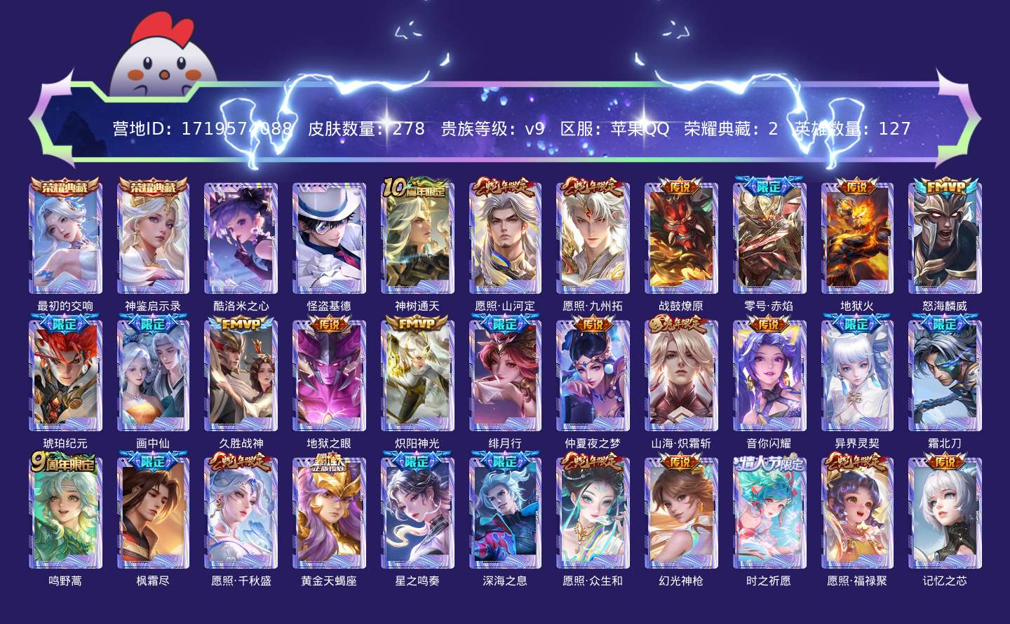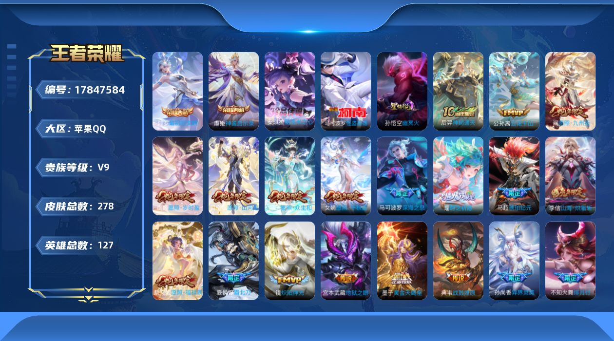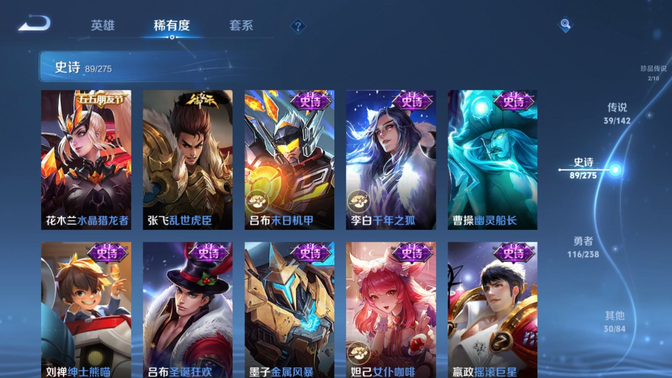 传说品质_后羿_神树通天传说品质_司空震_愿照·山河定传说品质_澜_愿照·九州拓传说品质_典韦_战鼓燎原传说品质_孙悟空_零号·赤焰传说品质_孙悟空_地狱火传说品质_吕布_怒海麟威传说品质_马超_琥珀纪元传说品质_干将莫邪_画中仙传说品质_干将莫邪_久胜战神传说品质_宫本武藏_地狱之眼传说品质_镜_炽阳神光传说品质_不知火舞_绯月行传说品质_貂蝉_仲夏夜之梦传说品质_李信_山海·炽霜斩传说品质_孙尚香_音你闪耀传说品质_孙尚香_异界灵契传说品质_夏侯惇_霜北刀传说品质_桑启_鸣野蒿传说品质_橘右京_枫霜尽传说品质_女娲_愿照·千秋盛传说品质_墨子_黄金天蝎座传说品质_杨玉环_星之鸣奏传说品质_马可波罗_深海之息传说品质_妲己_愿照·众生和传说品质_云缨_幻光神枪传说品质_瑶_时之祈愿传说品质_蔡文姬_愿照·福禄聚传说品质_公孙离_记忆之芯传说品质_公孙离_云诺千山传说品质_百里守约_碎云传说品质_孙策_末日机甲传说品质_铠_绛天战甲传说品质_铠_琥珀纪元传说品质_鲁班七号_时之奇旅传说品质_虞姬_愿照·岁时盈传说品质_虞姬_启明星使传说品质_嬴政_玄雷天君传说品质_赵云_淬星耀世