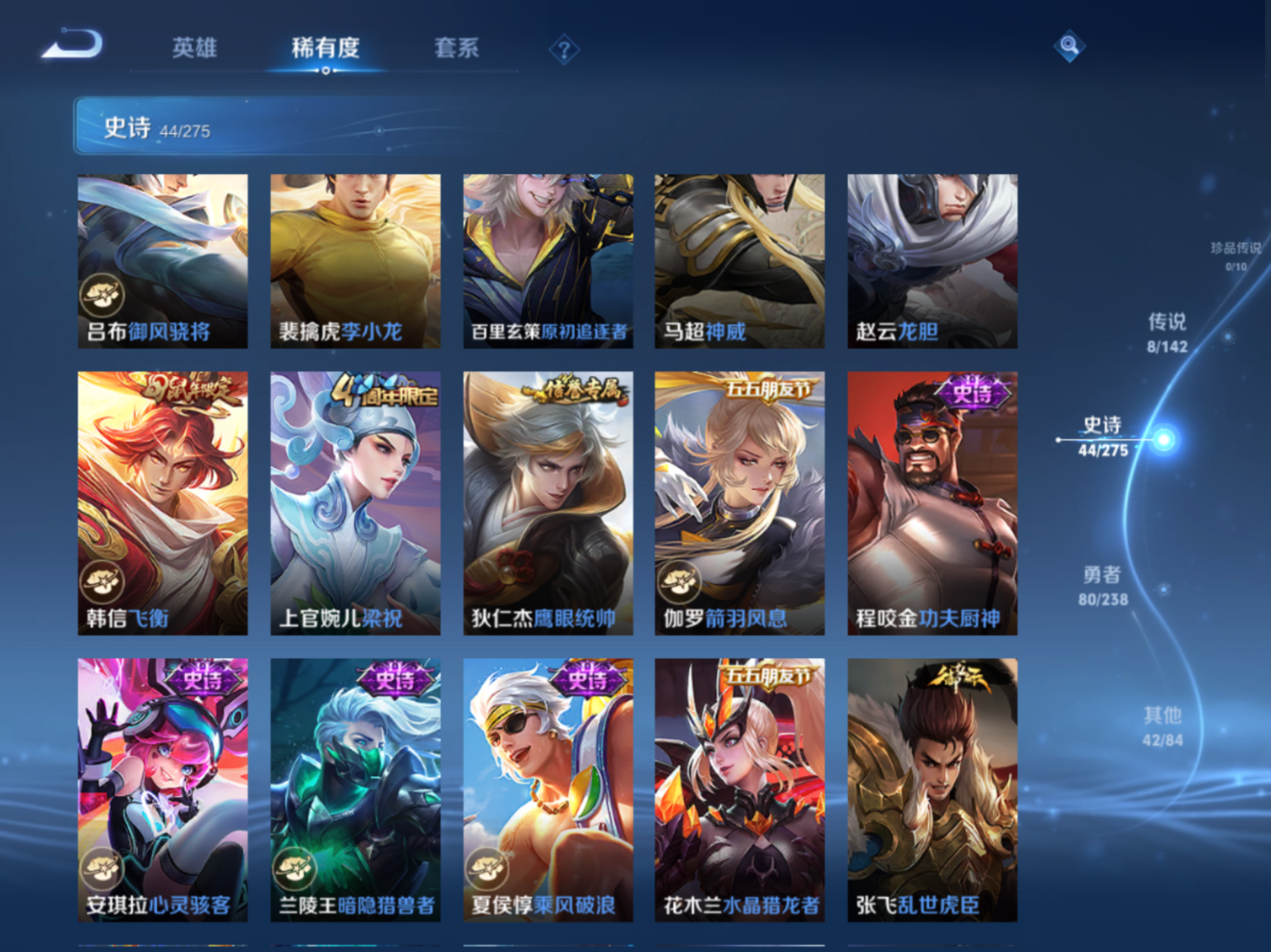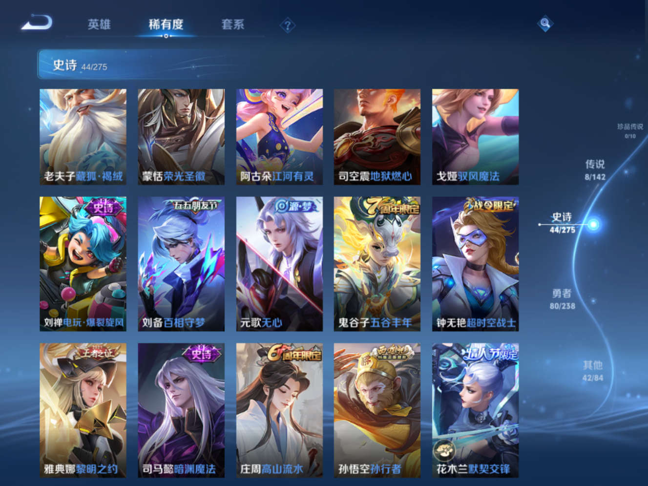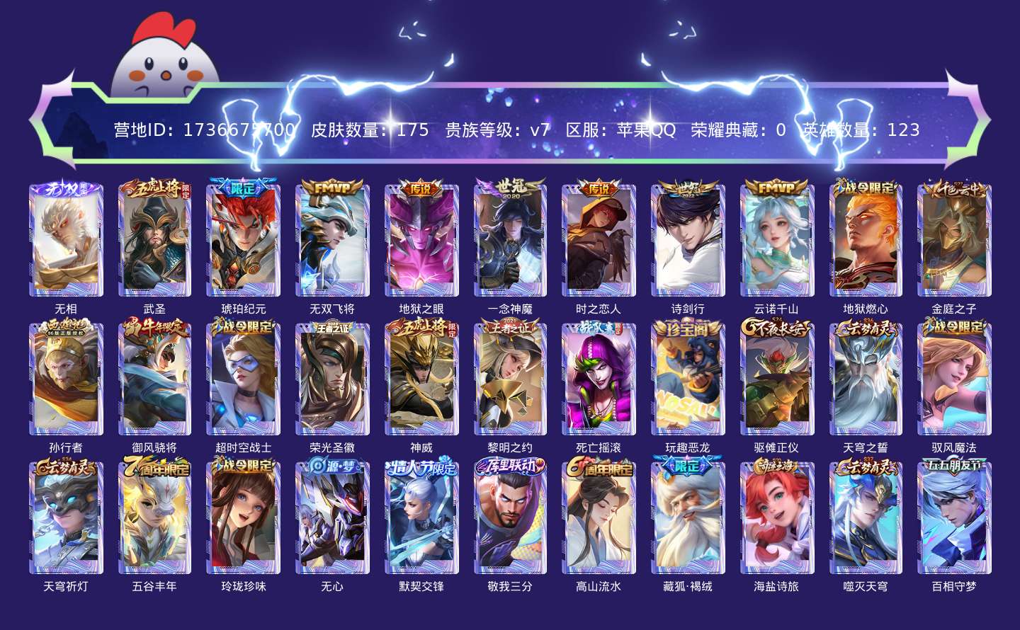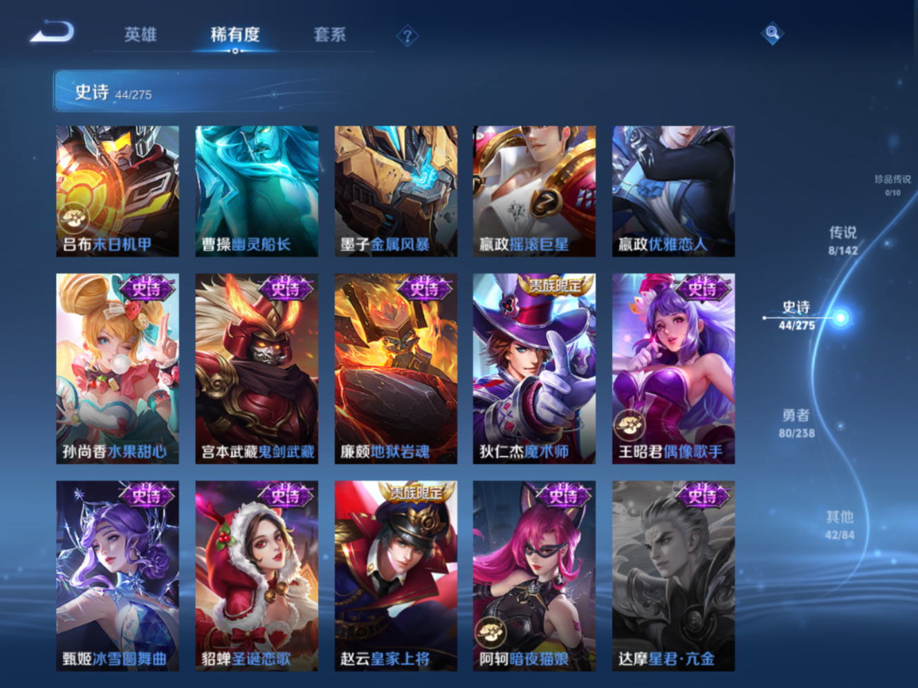 贵族等级:v7皮肤数:175传说品质8 无双1 生肖限定2 情人节限定1 英雄数:123
