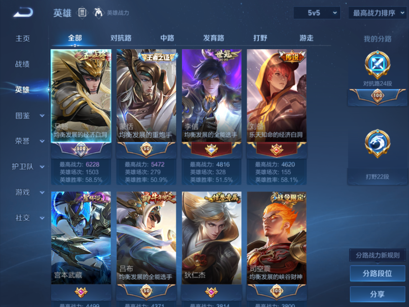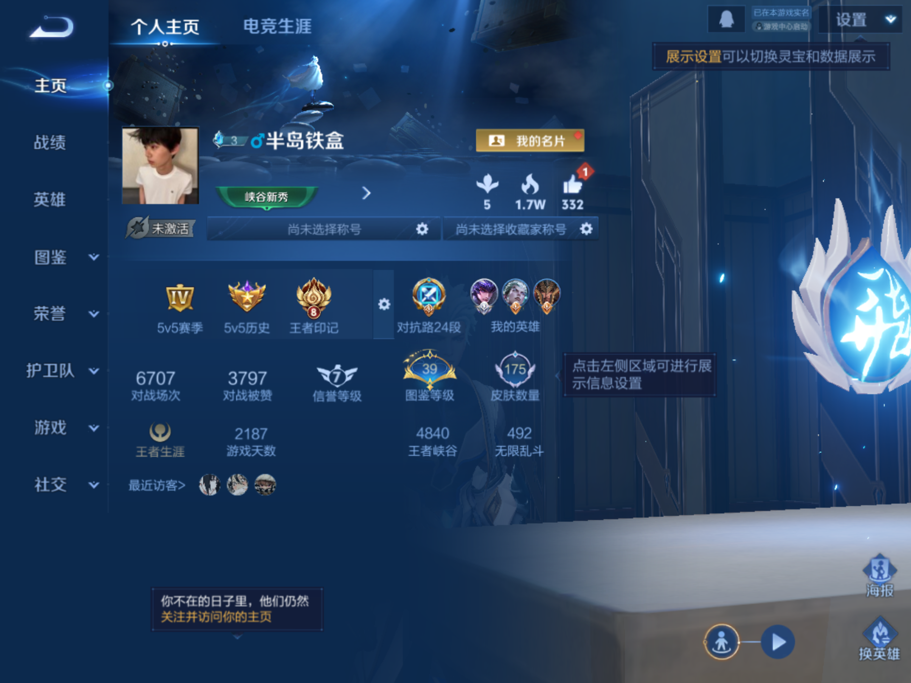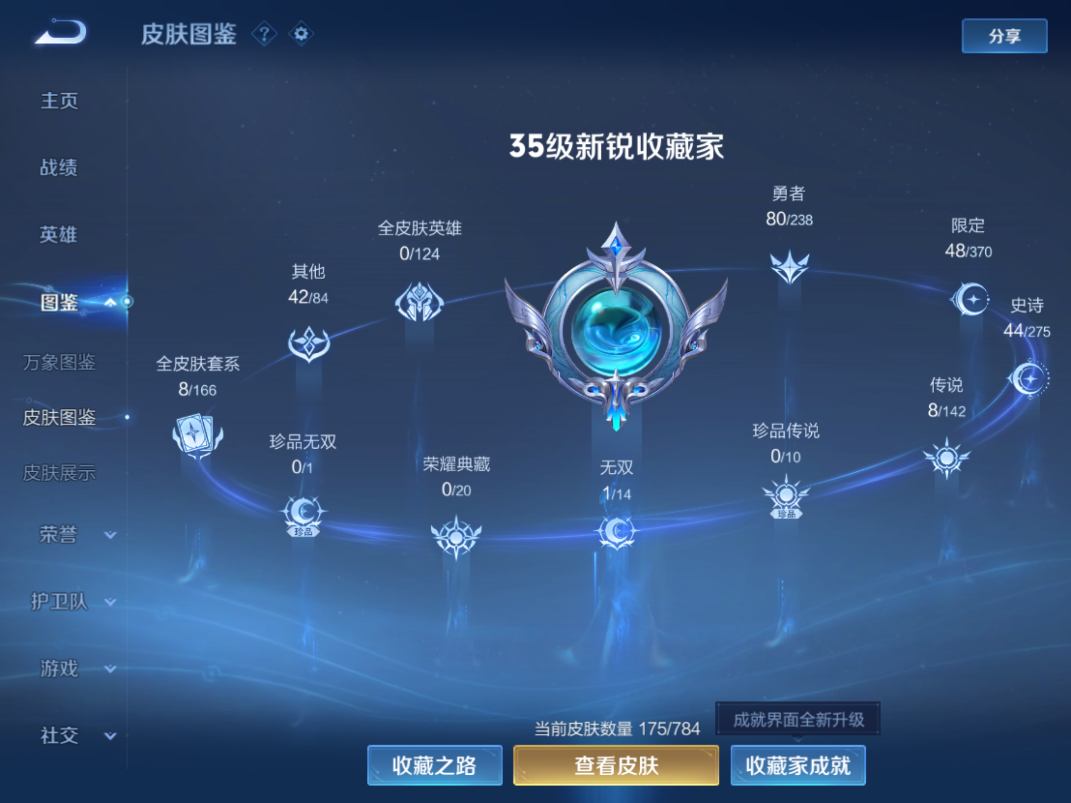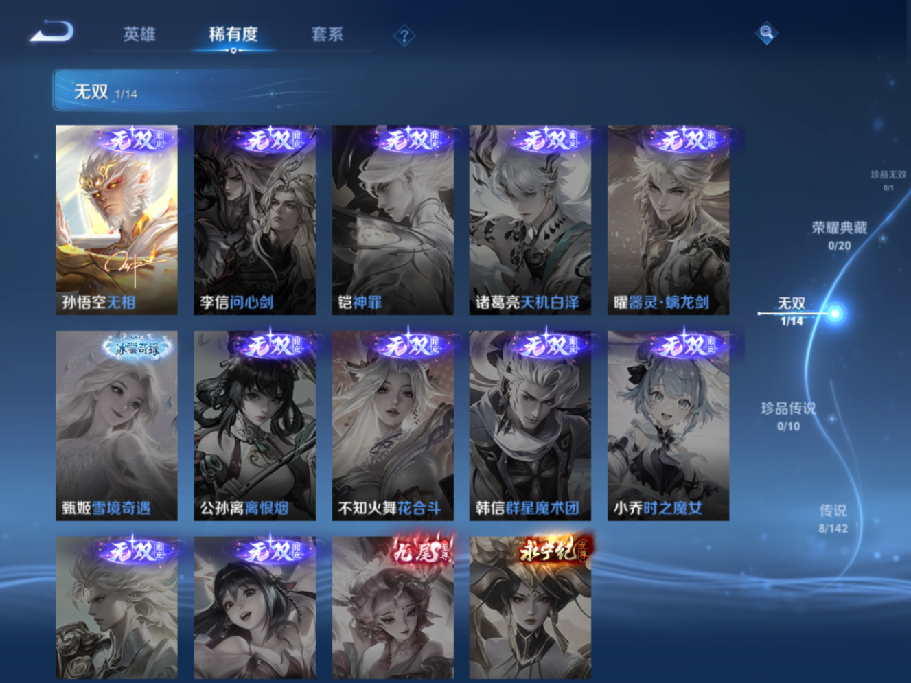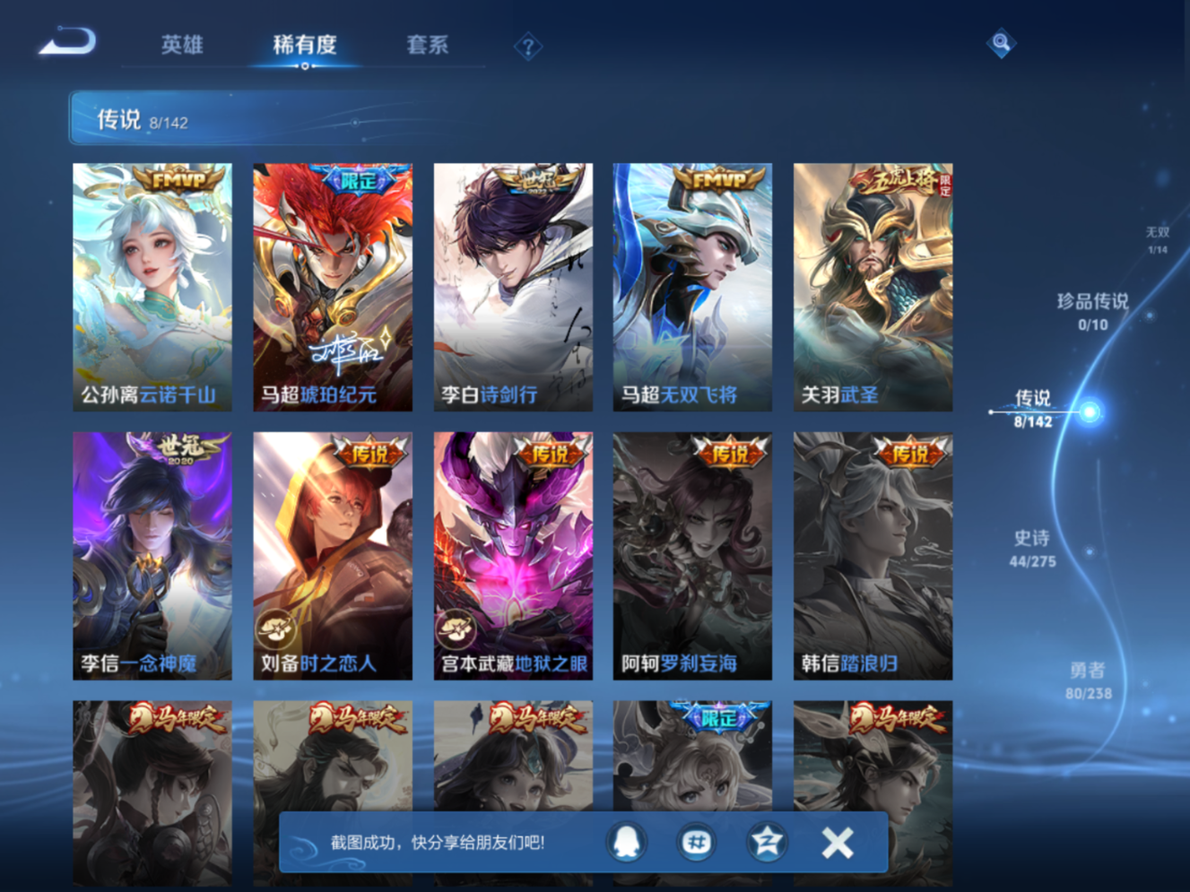 贵族等级:v7皮肤数:175传说品质8 无双1 生肖限定2 情人节限定1 英雄数:123