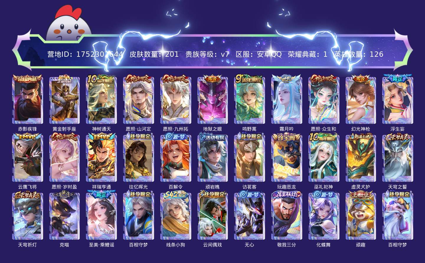 贵族等级:v7皮肤数:201传说品质13 荣耀典藏1 生肖限定5 英雄数:126