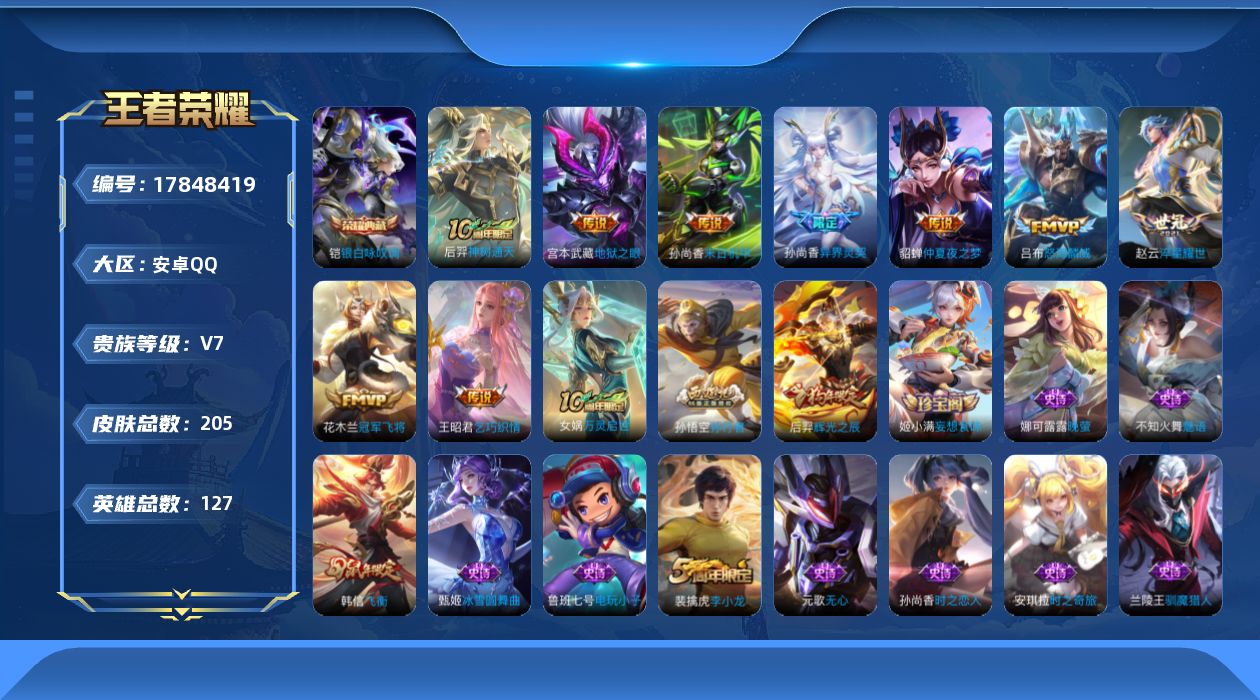 贵族等级:v7皮肤数:205生肖限定2 传说品质9 荣耀典藏1 英雄数:127