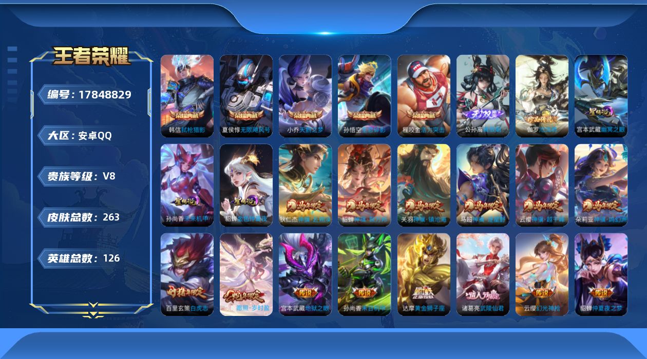 贵族等级:v8皮肤数:263传说品质17 生肖限定11 情人节限定1 荣耀典藏5 无双1 珍品传说1 英雄数:126