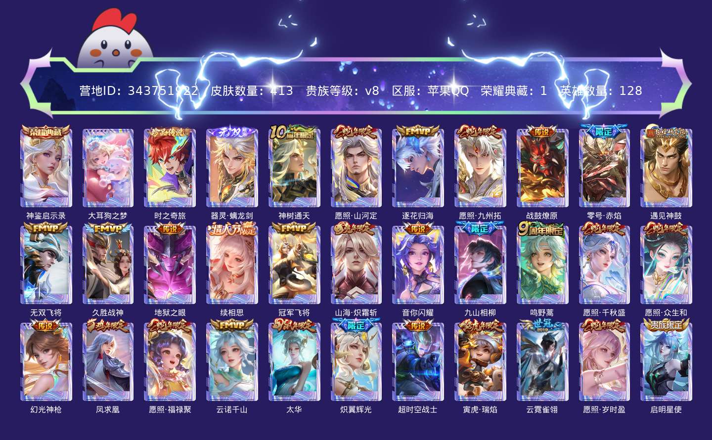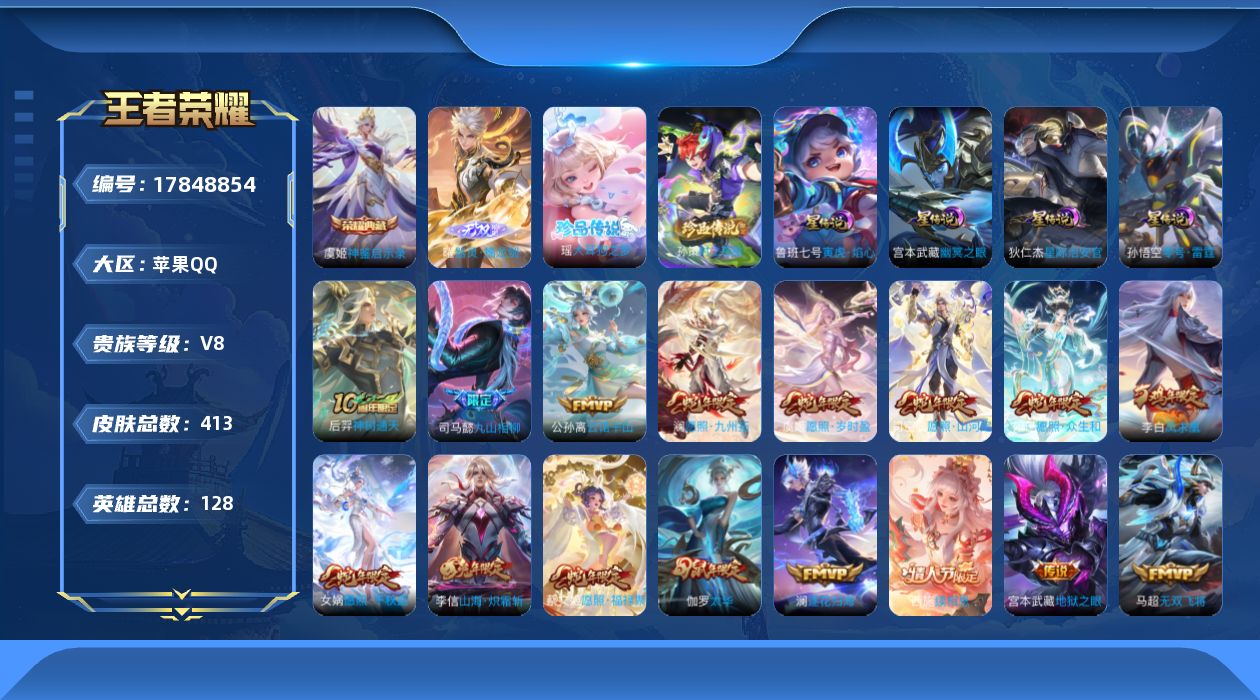 传说品质_后羿_神树通天传说品质_司空震_愿照·山河定传说品质_澜_逐花归海传说品质_澜_愿照·九州拓传说品质_典韦_战鼓燎原传说品质_孙悟空_零号·赤焰传说品质_吕布_遇见神鼓传说品质_马超_无双飞将传说品质_干将莫邪_久胜战神传说品质_宫本武藏_地狱之眼传说品质_西施_续相思传说品质_花木兰_冠军飞将传说品质_李信_山海·炽霜斩传说品质_孙尚香_音你闪耀传说品质_司马懿_九山相柳传说品质_桑启_鸣野蒿传说品质_女娲_愿照·千秋盛传说品质_妲己_愿照·众生和传说品质_云缨_幻光神枪传说品质_李白_凤求凰传说品质_蔡文姬_愿照·福禄聚传说品质_公孙离_云诺千山传说品质_伽罗_太华传说品质_伽罗_炽翼辉光传说品质_狄仁杰_超时空战士传说品质_鲁班七号_寅虎·瑞焰传说品质_虞姬_云霓雀翎传说品质_虞姬_愿照·岁时盈传说品质_虞姬_启明星使传说品质_赵云_淬星耀世