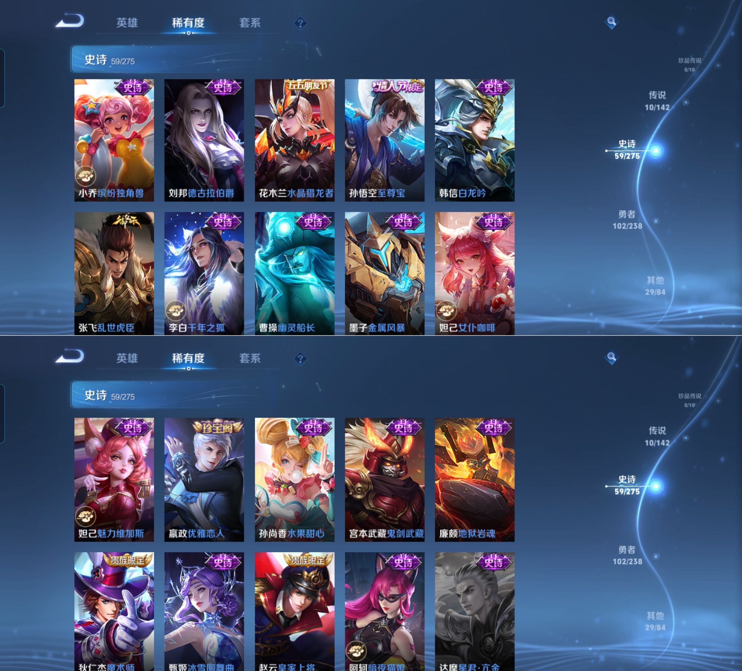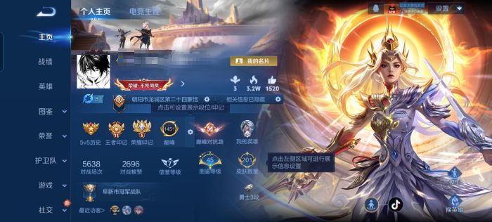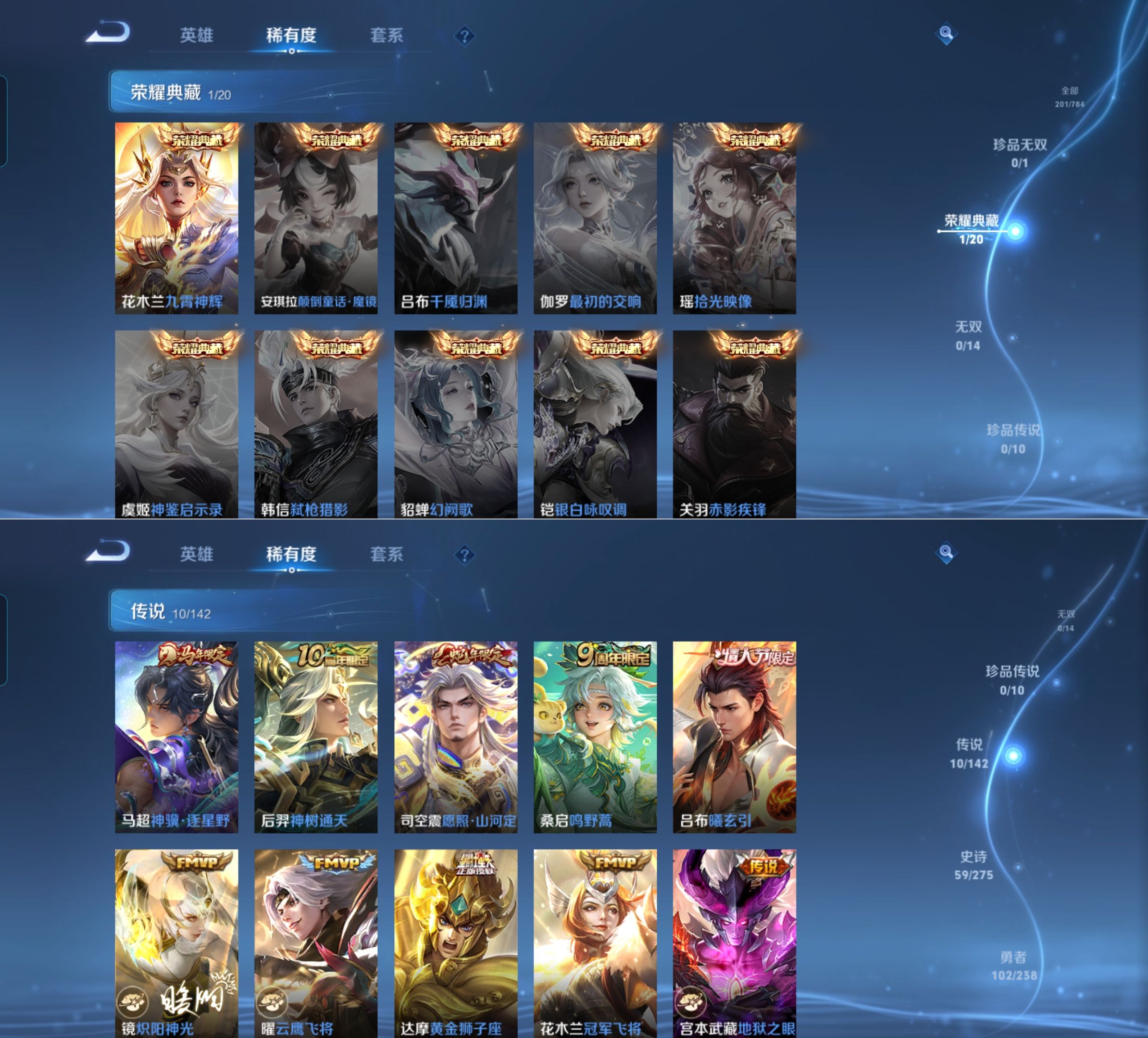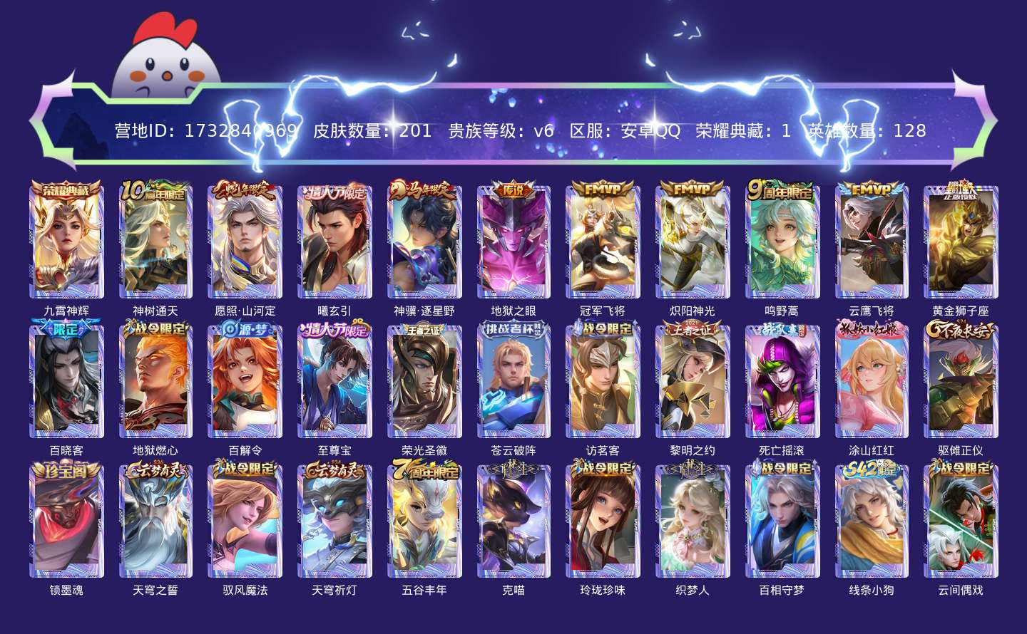 贵族等级:v6皮肤数:201传说品质10 生肖限定2 情人节限定2 荣耀典藏1 英雄数:128