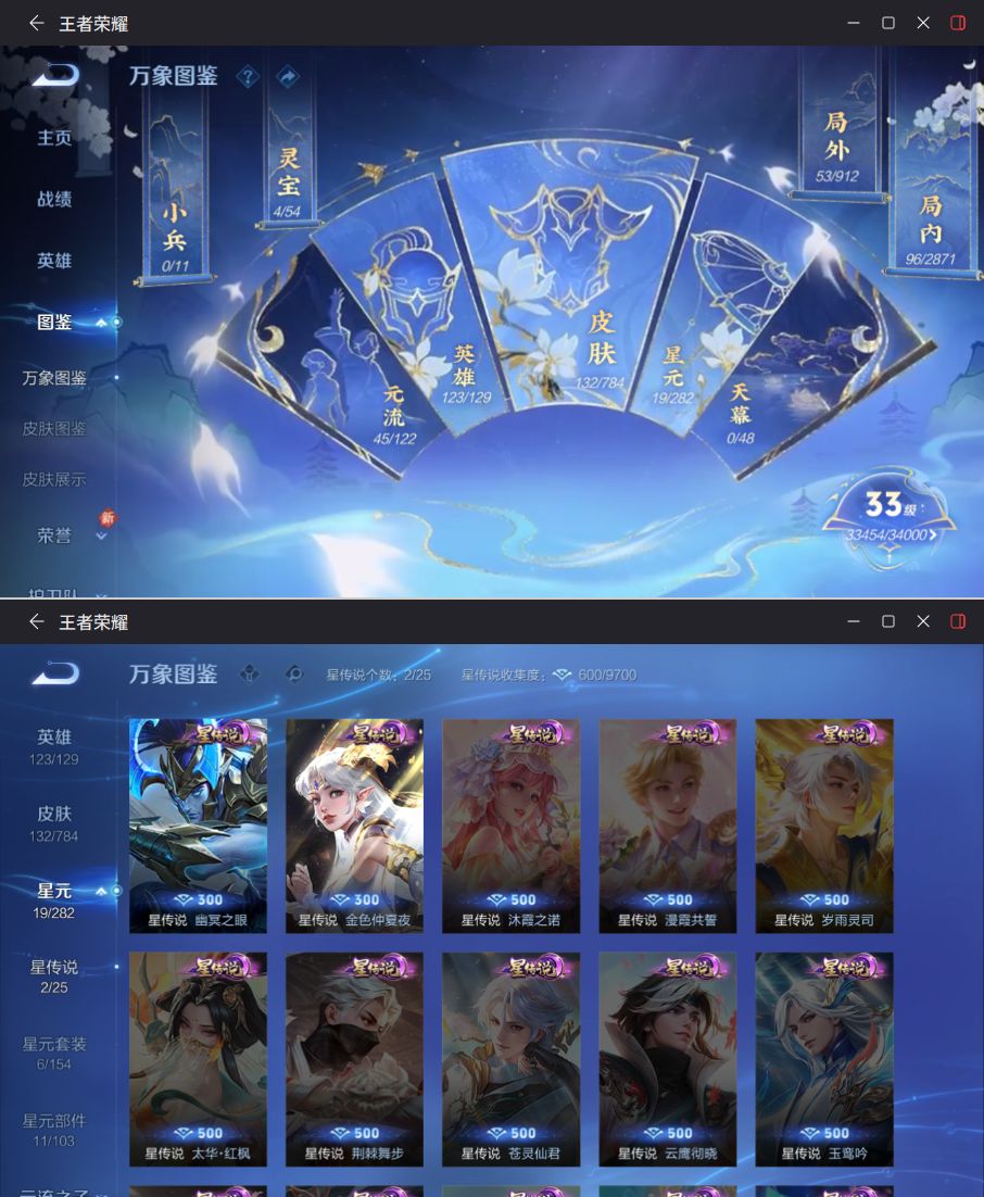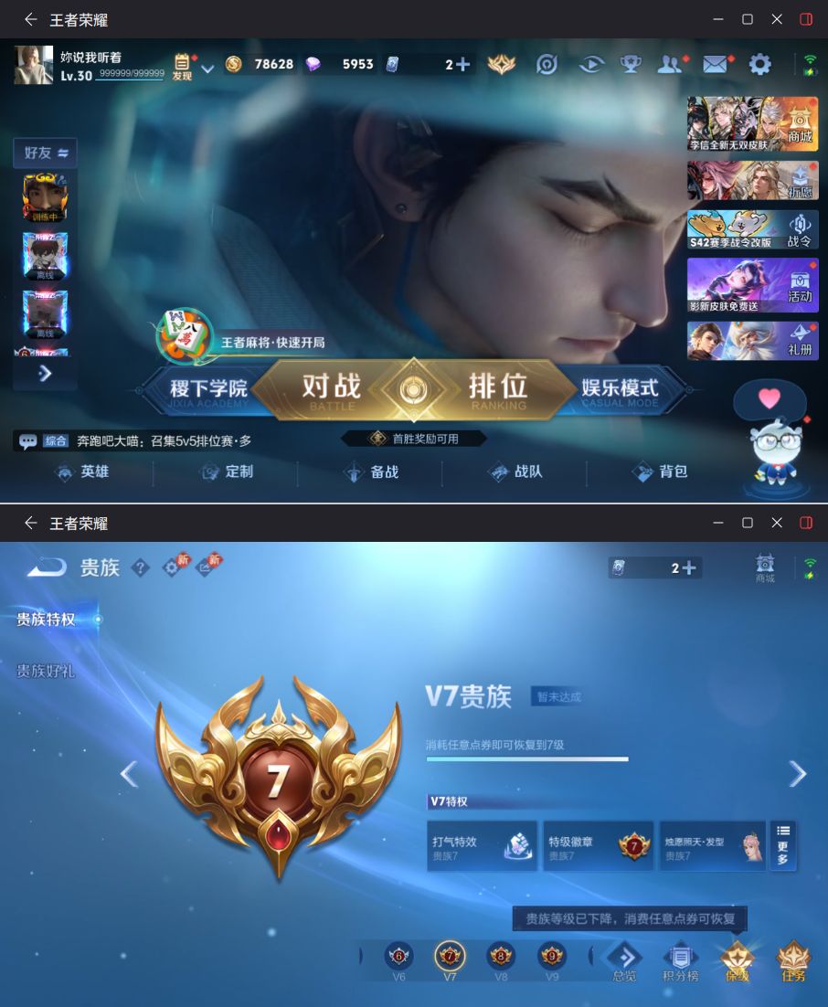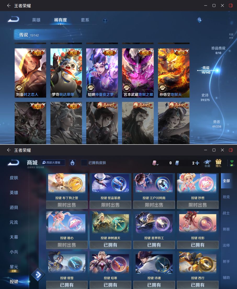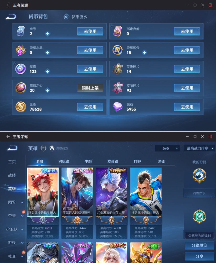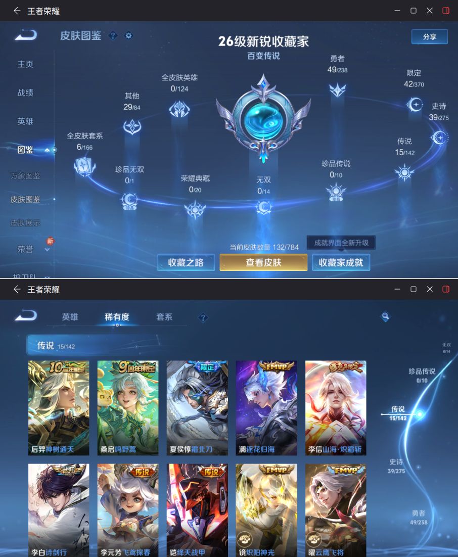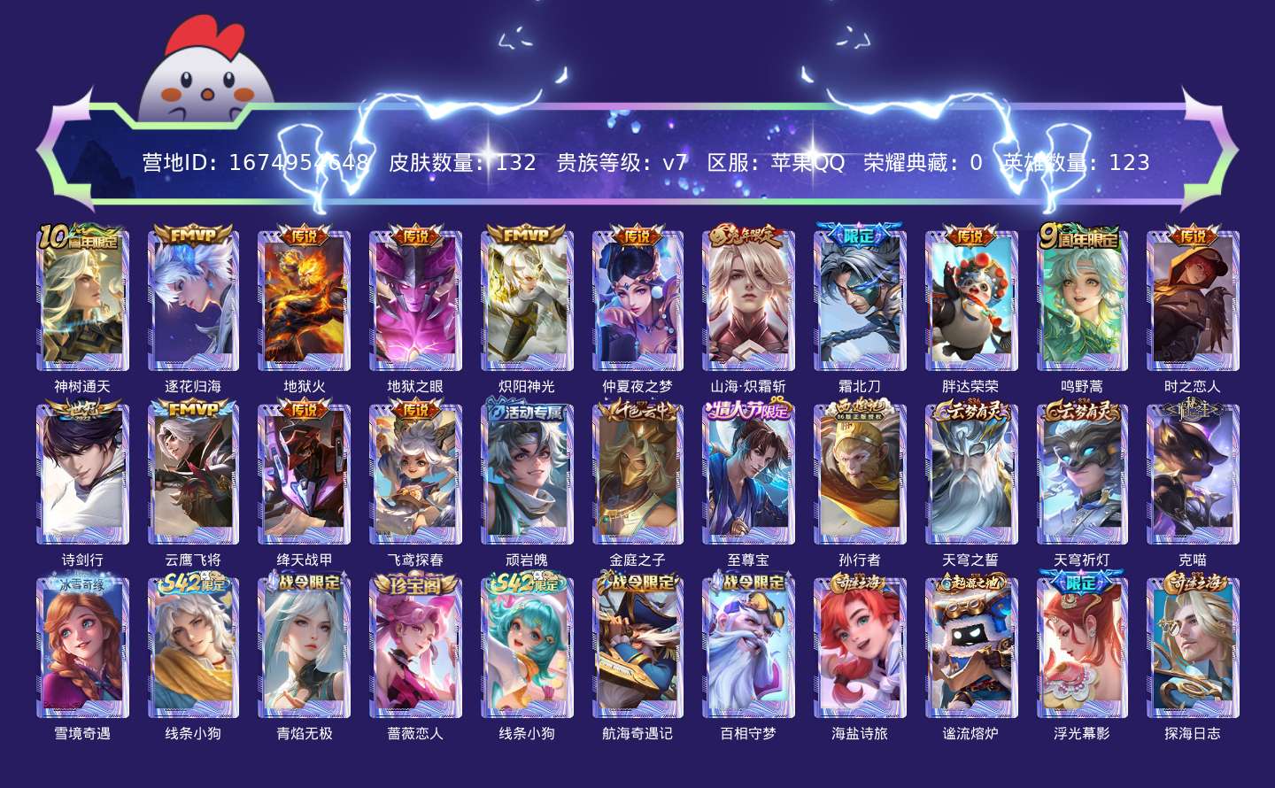 贵族等级:v7皮肤数:132传说品质15 情人节限定1 生肖限定1 英雄数:123