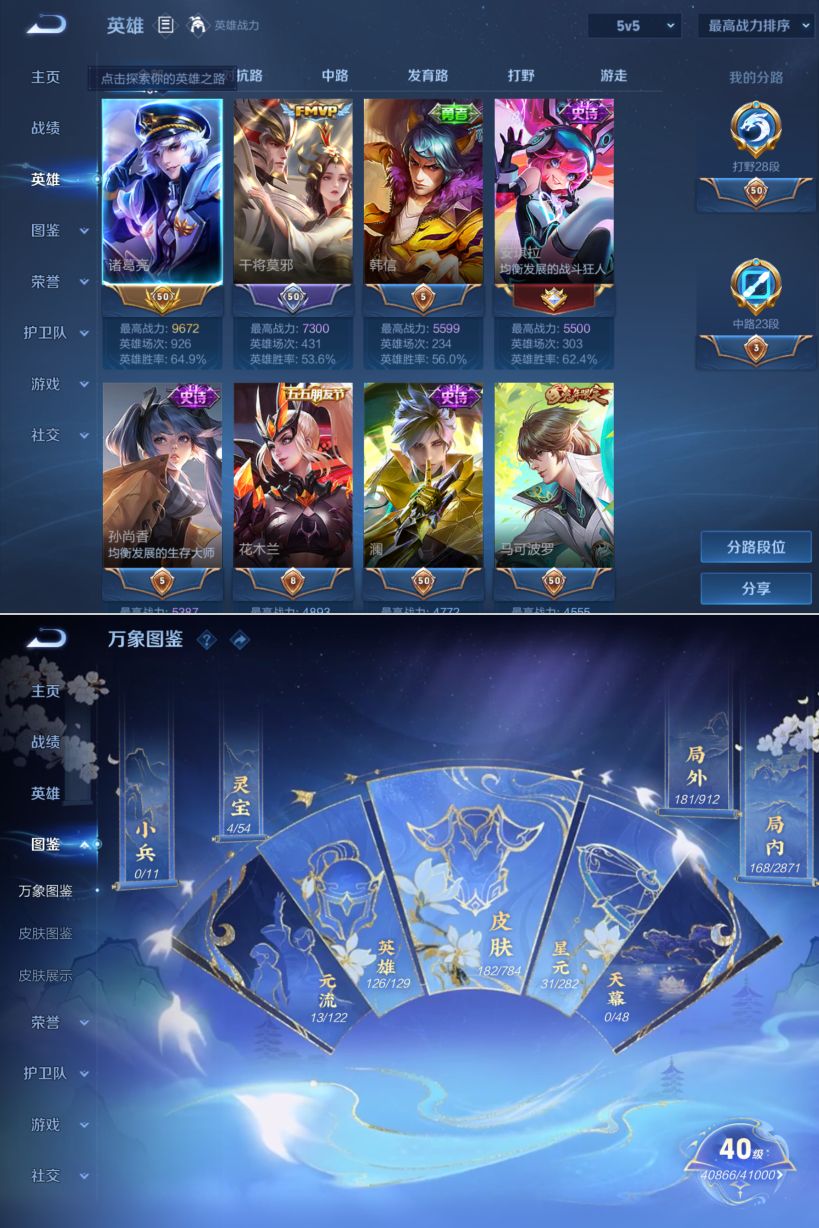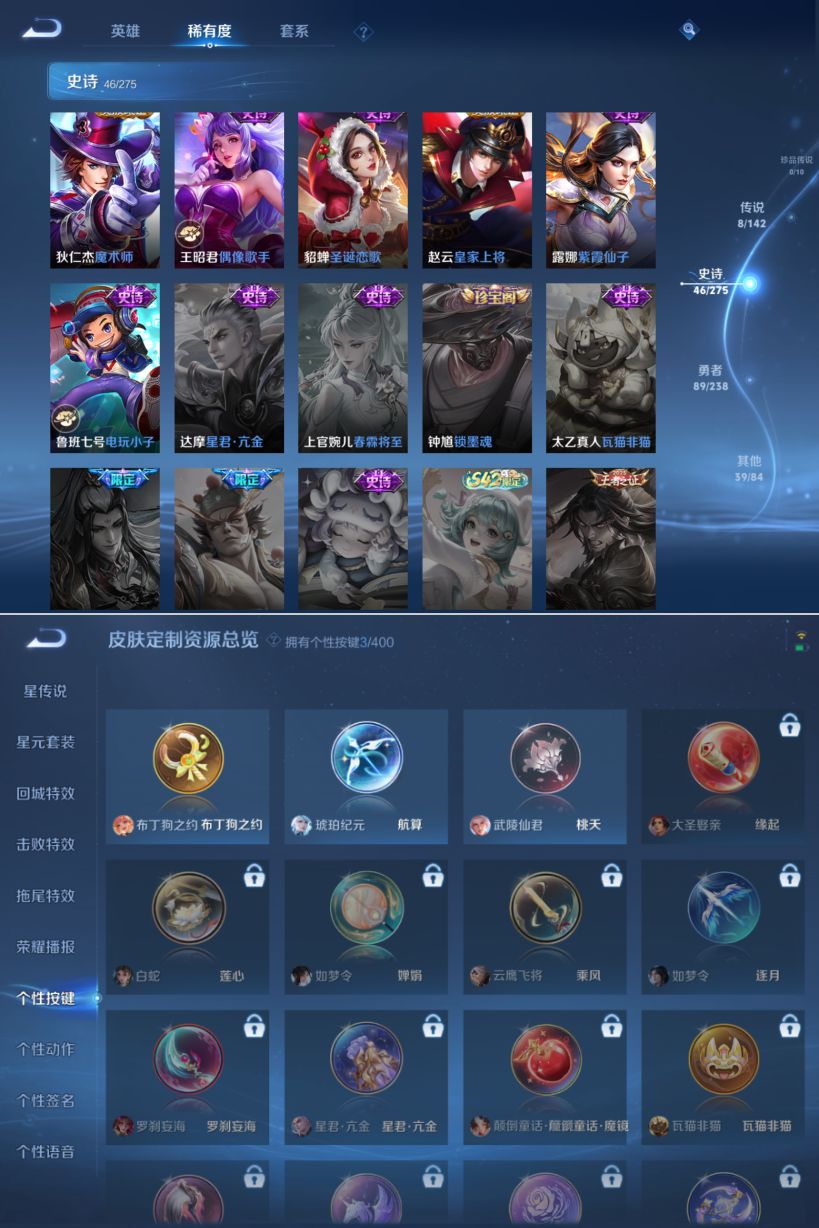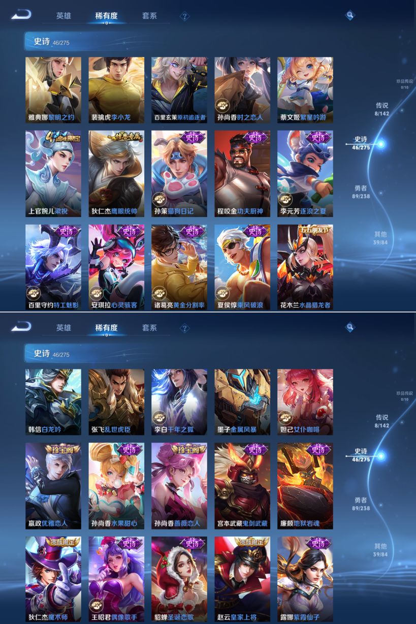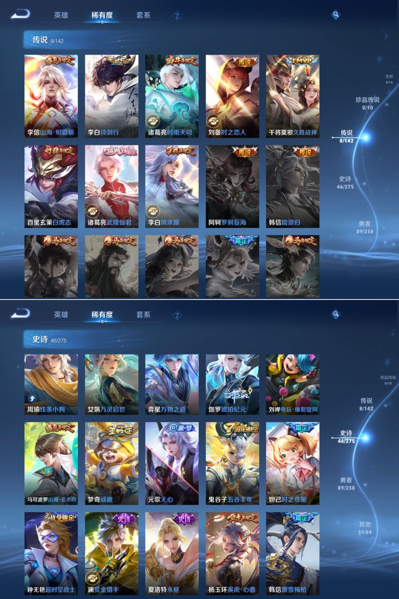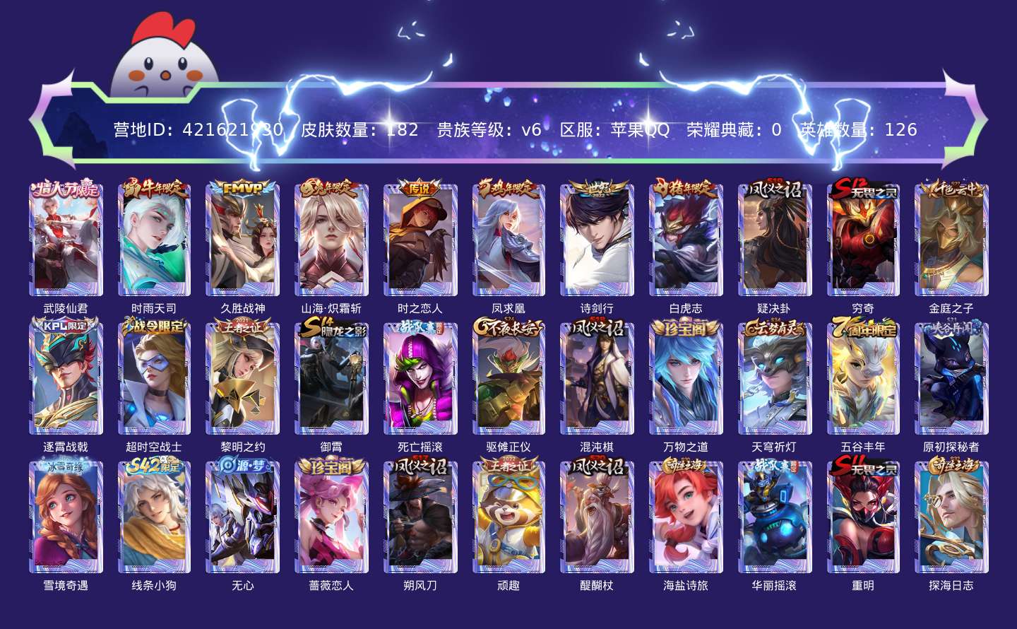 贵族等级:v6皮肤数:182传说品质8 情人节限定1 生肖限定6 英雄数:126