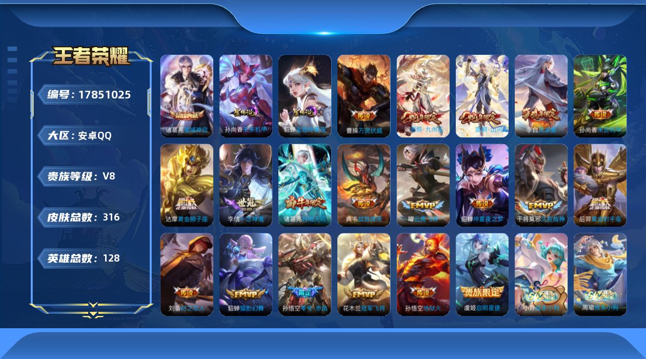 贵族等级:v8皮肤数:316传说品质19 生肖限定6 荣耀典藏1 情人节限定1 英雄数:128