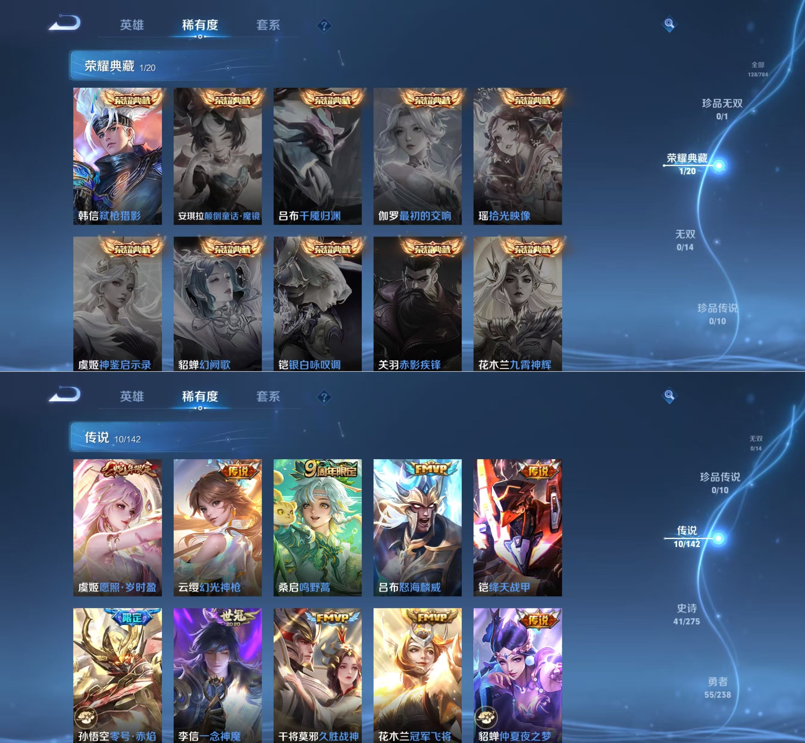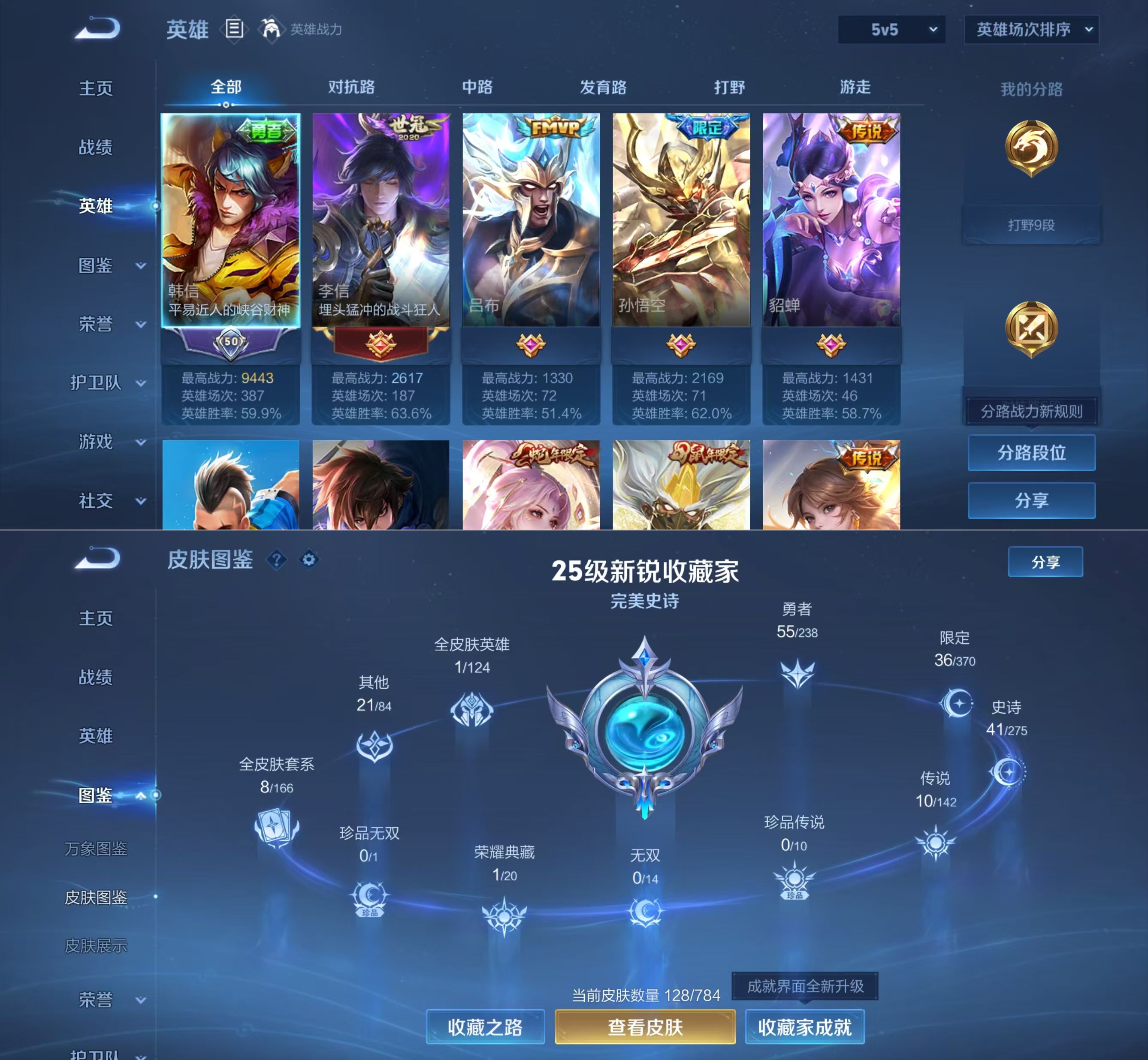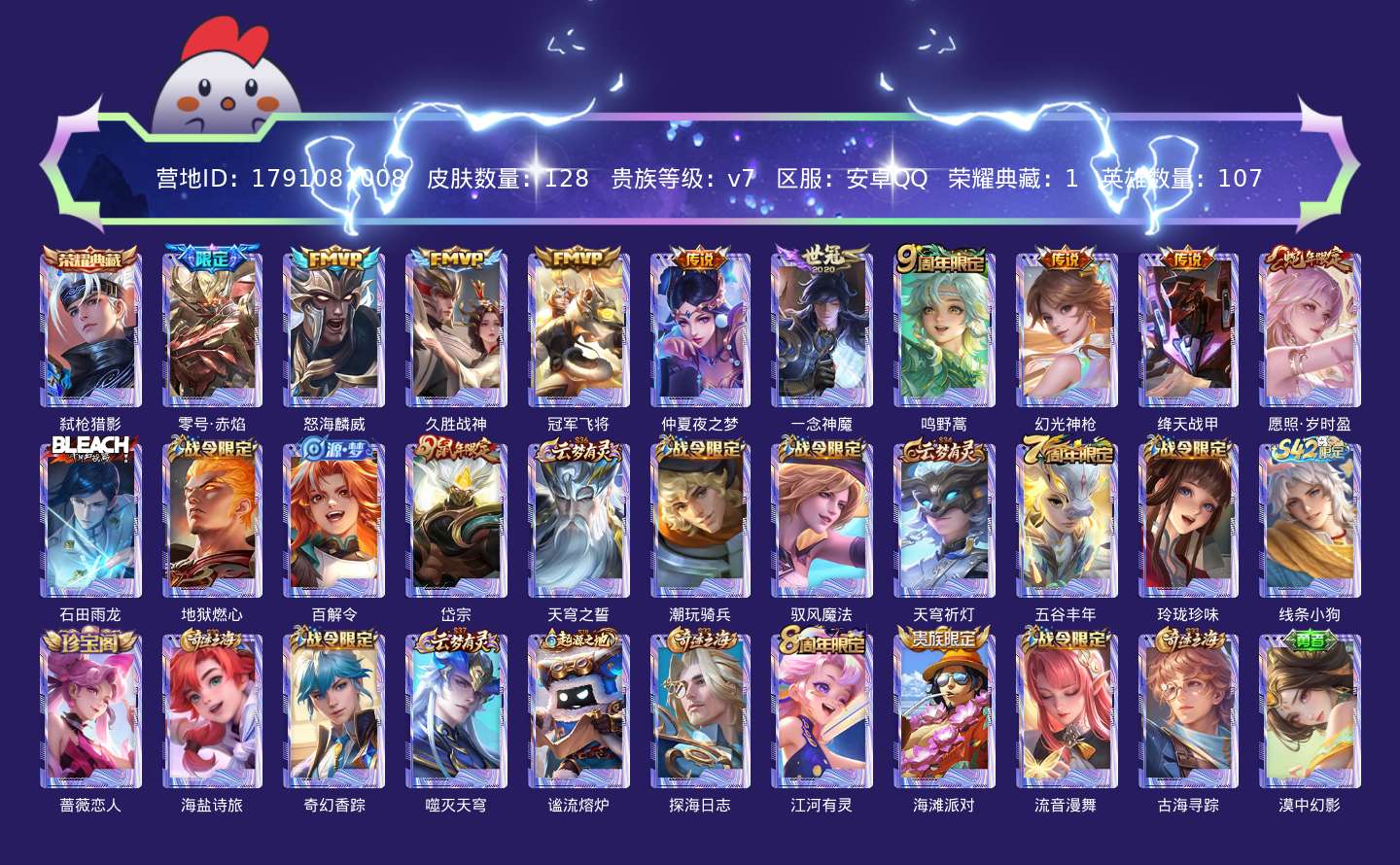 贵族等级:v7皮肤数:128生肖限定2 传说品质10 荣耀典藏1 英雄数:107