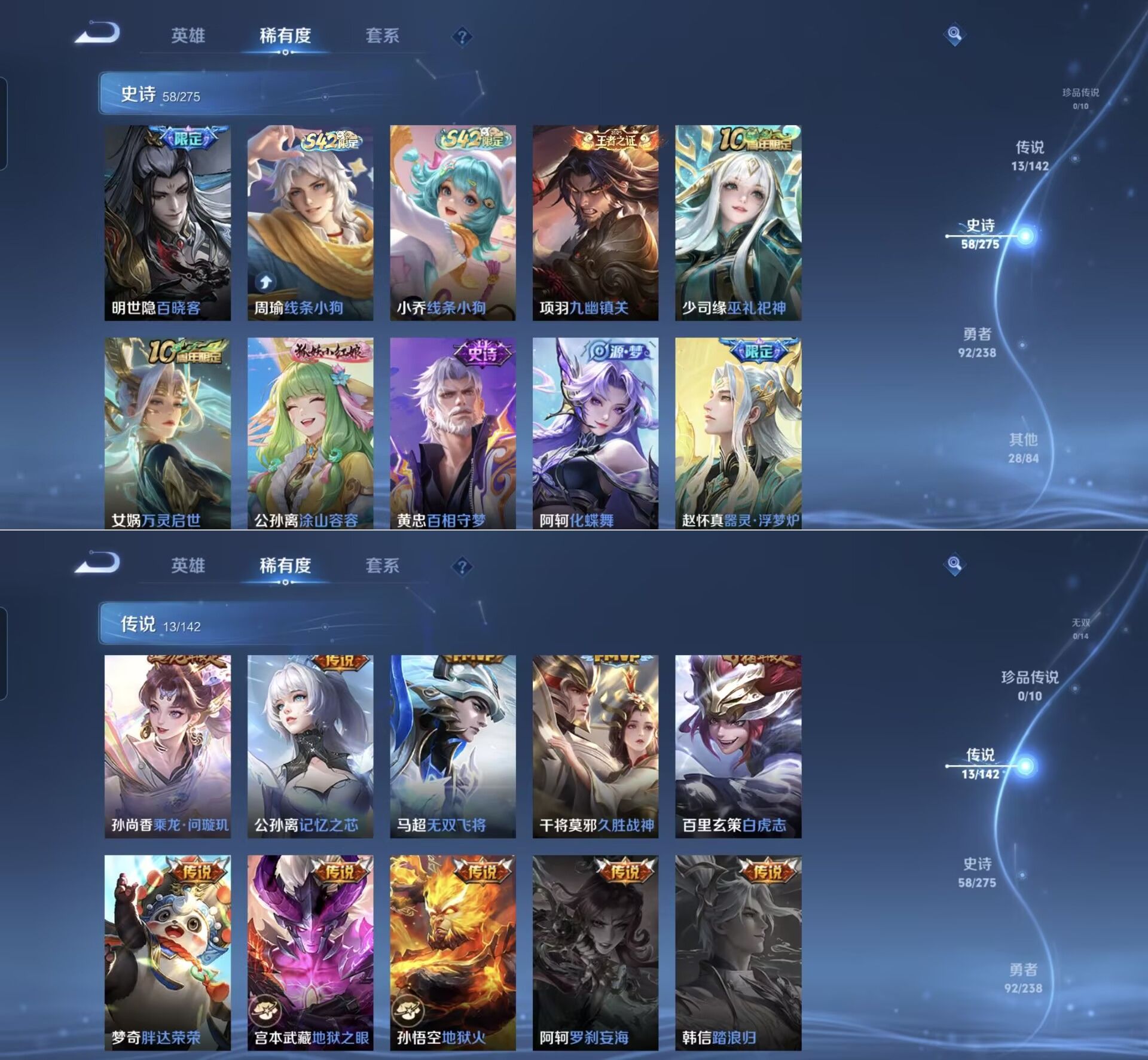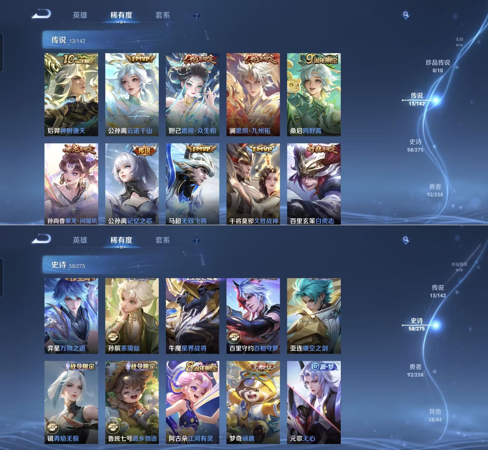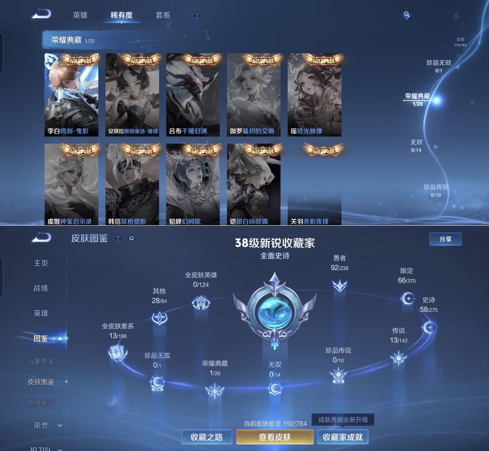 贵族等级:v6皮肤数:192传说品质13 生肖限定4 荣耀典藏1 英雄数:128