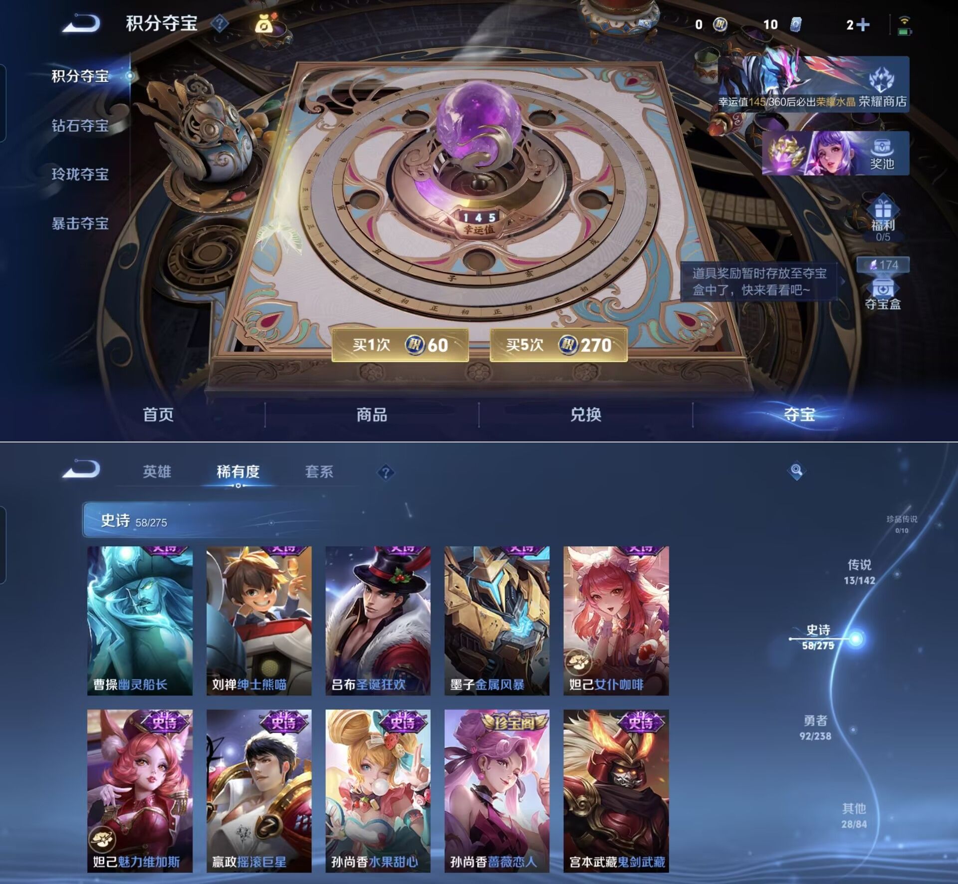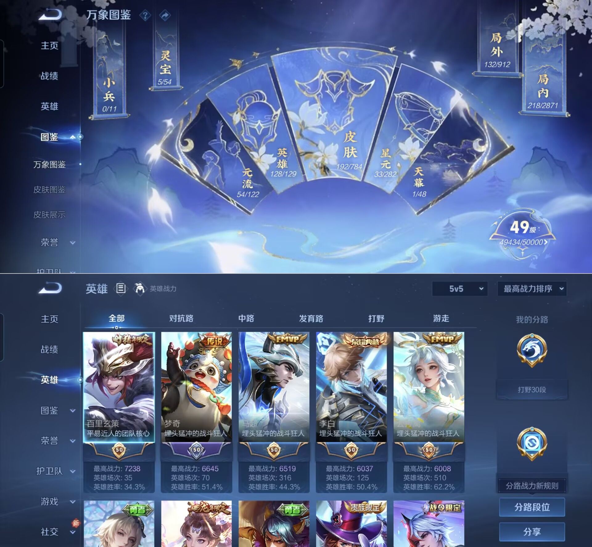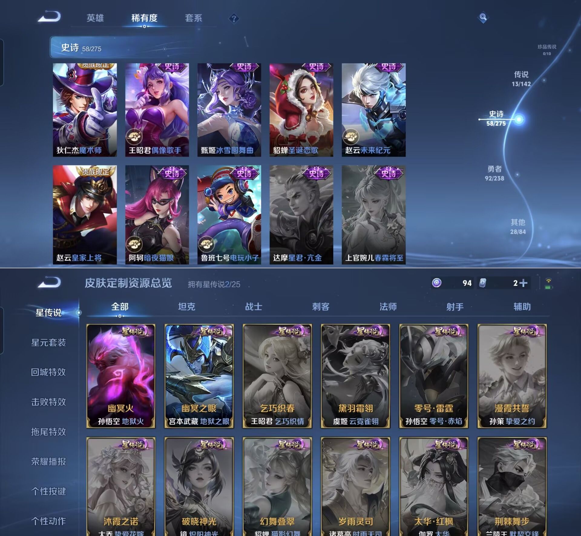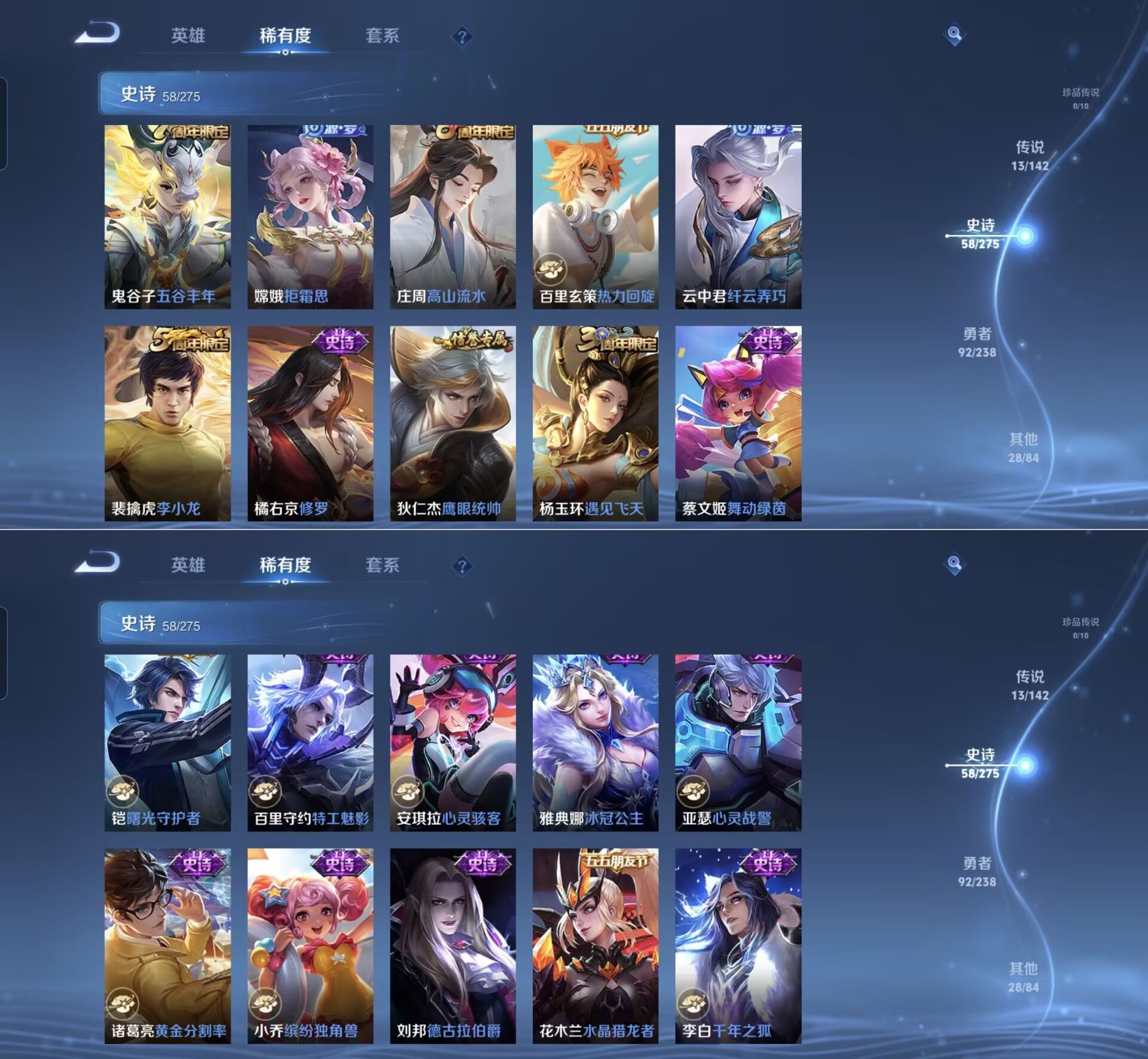 贵族等级:v6皮肤数:192传说品质13 生肖限定4 荣耀典藏1 英雄数:128