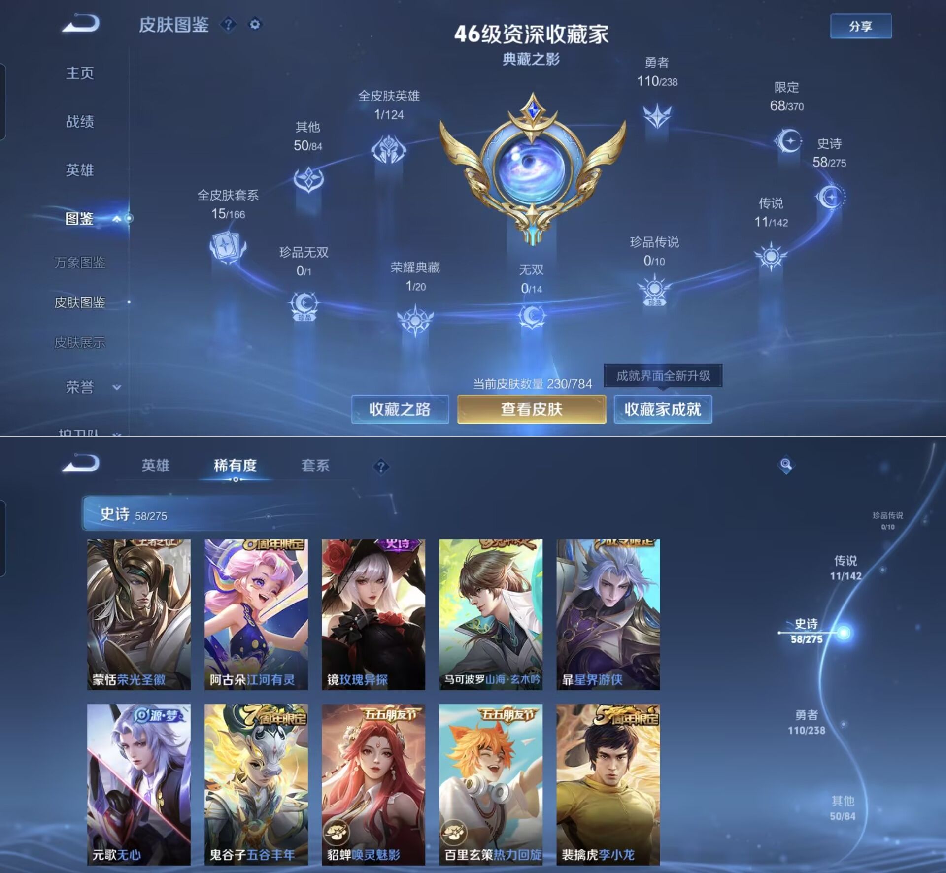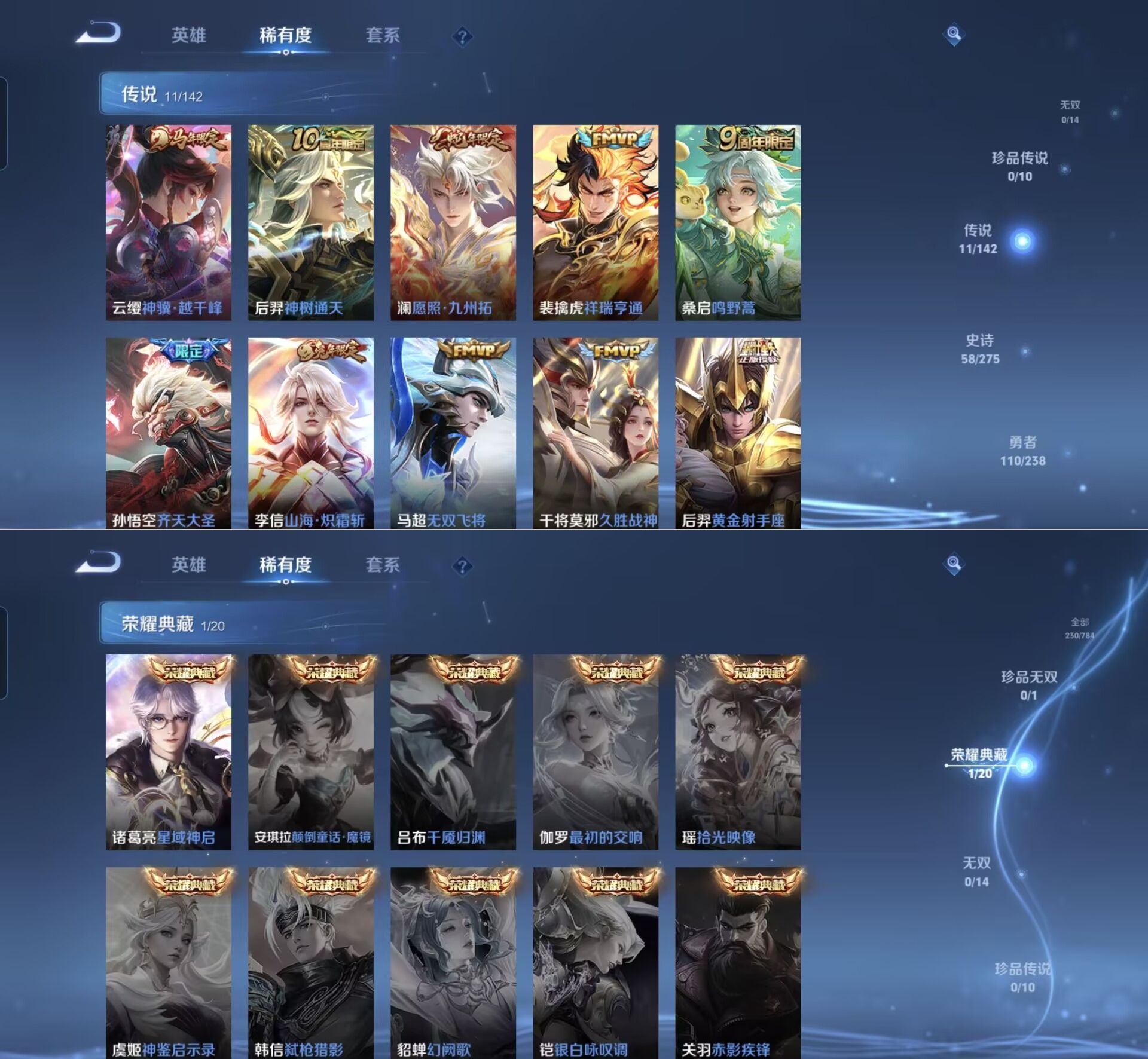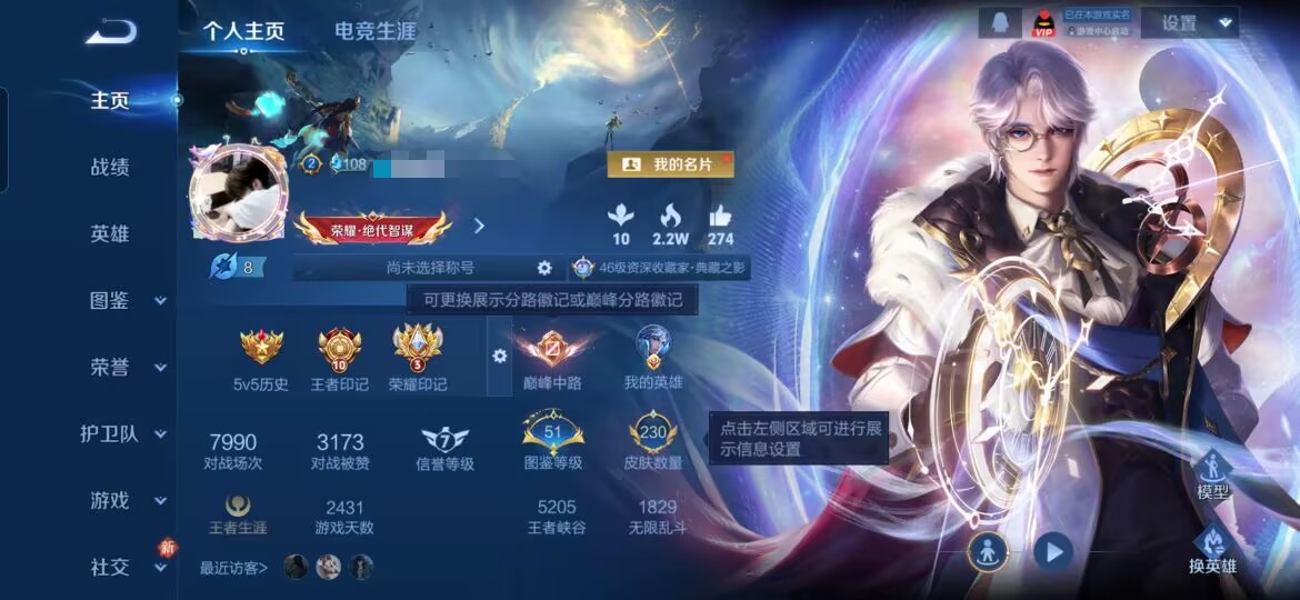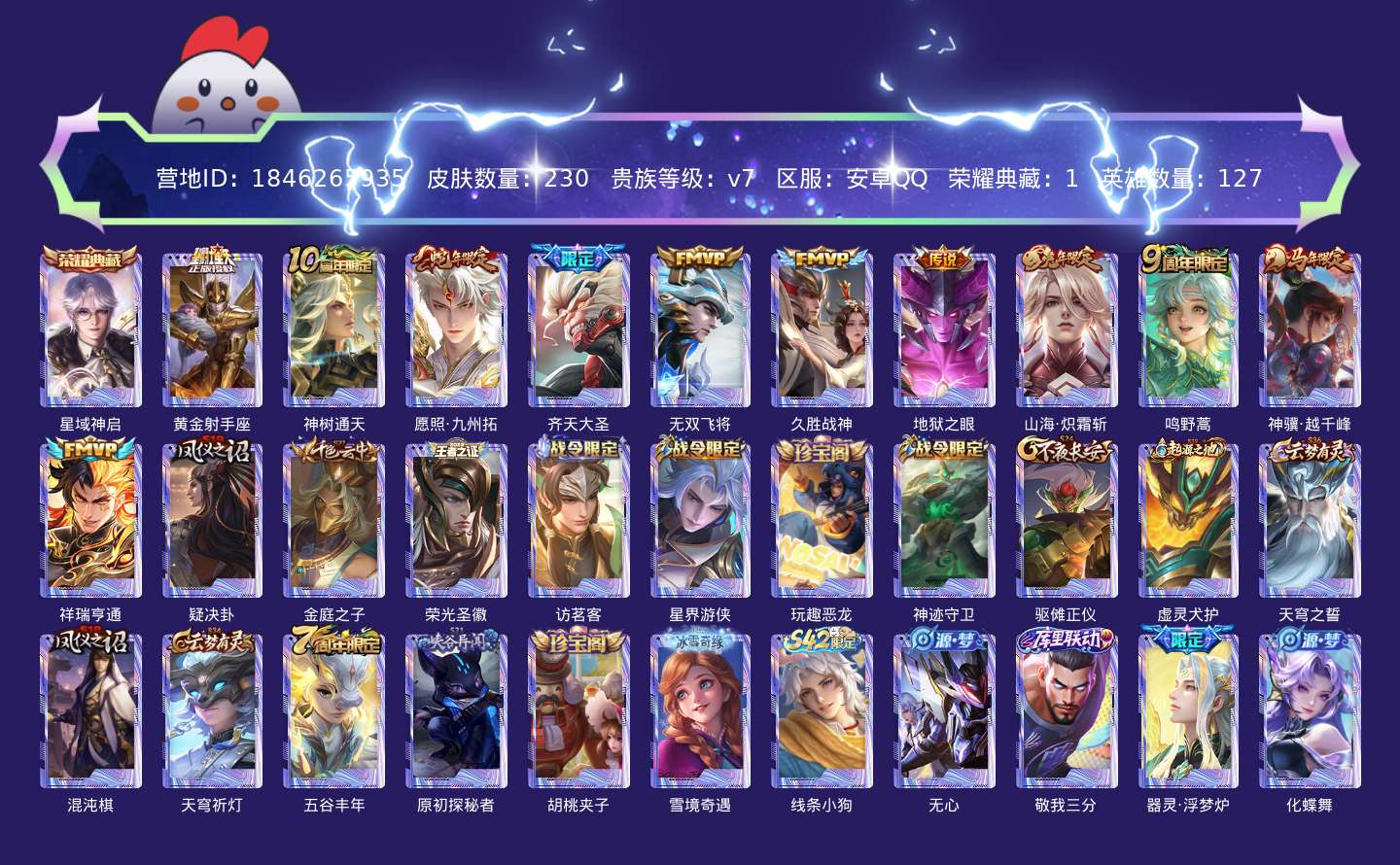 贵族等级:v7皮肤数:230传说品质11 生肖限定5 荣耀典藏1 英雄数:127