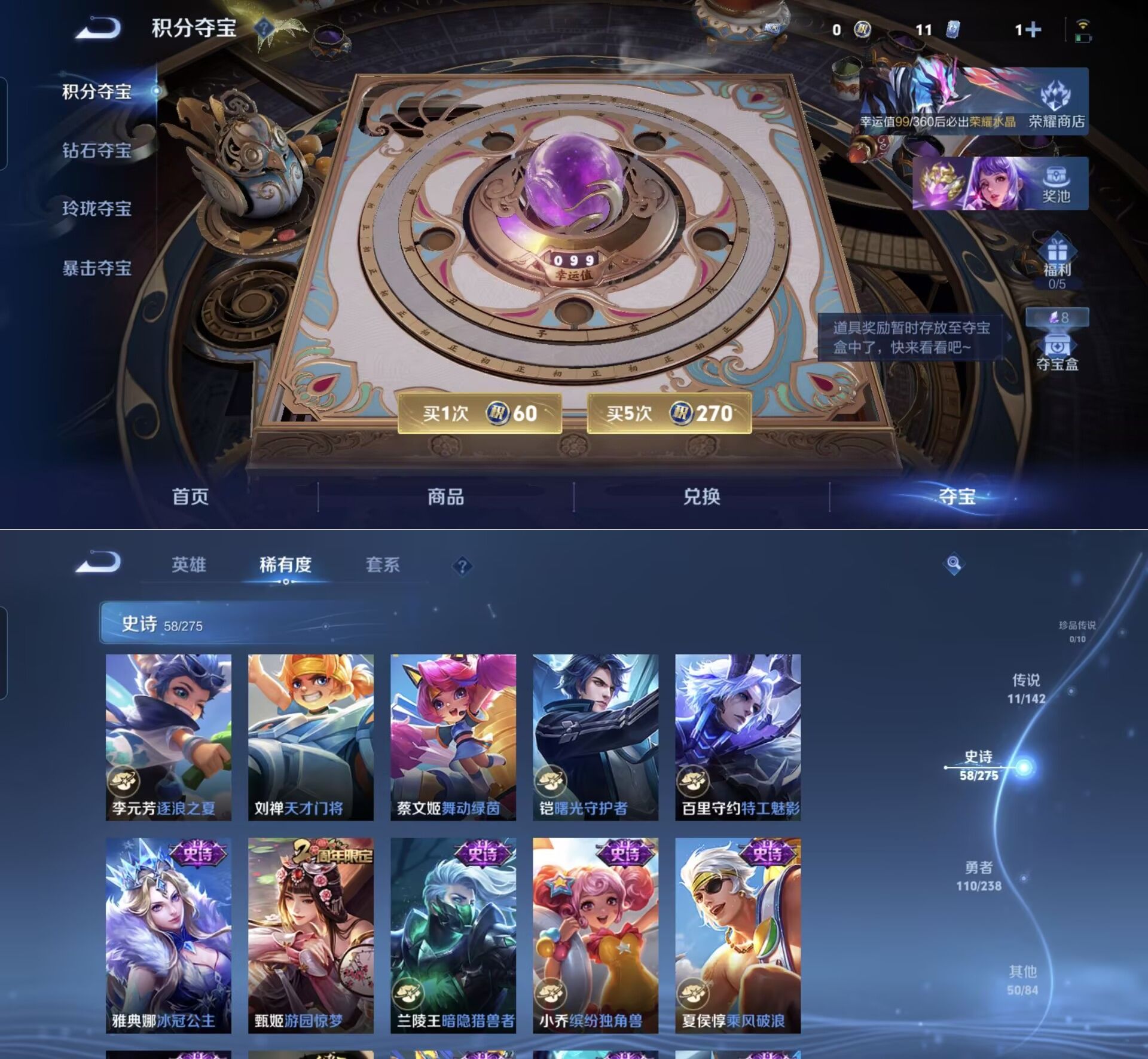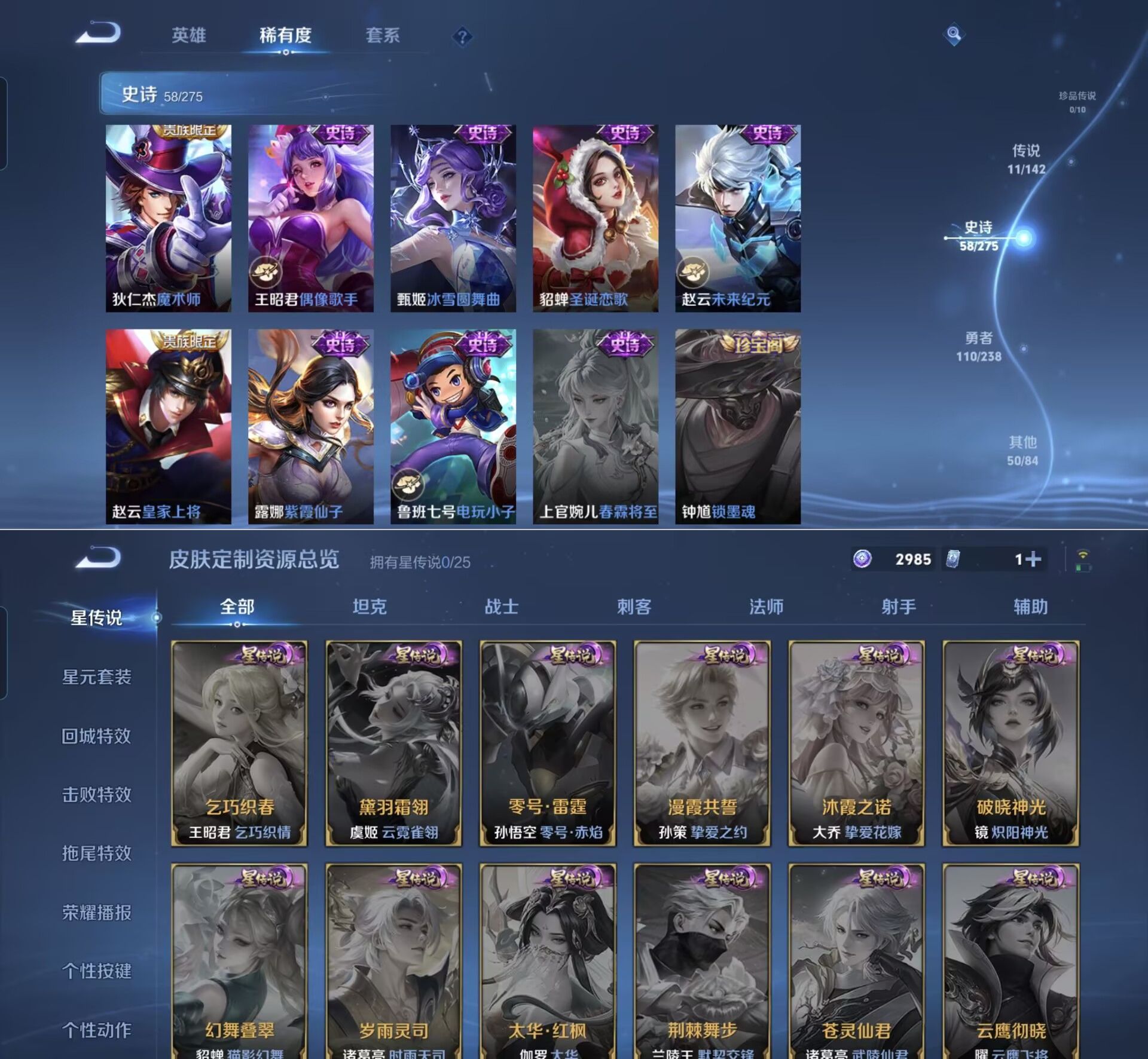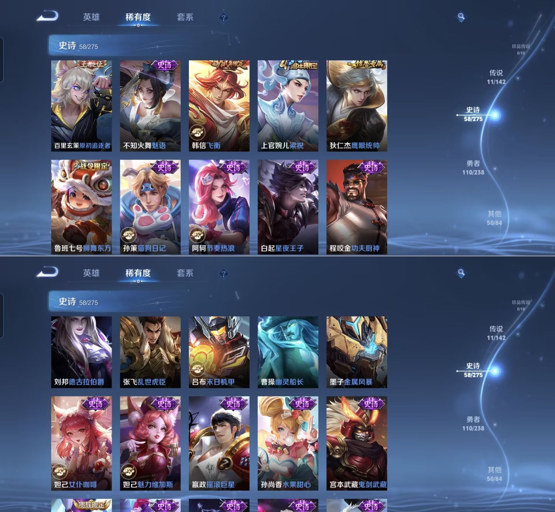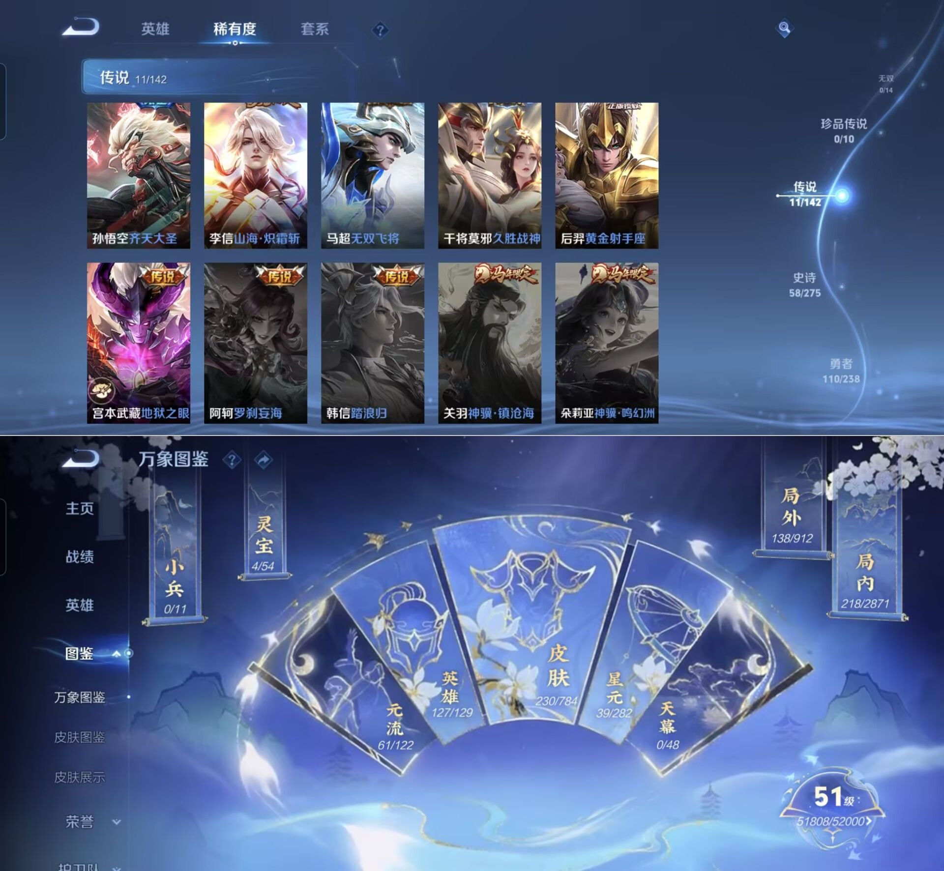 贵族等级:v7皮肤数:230传说品质11 生肖限定5 荣耀典藏1 英雄数:127