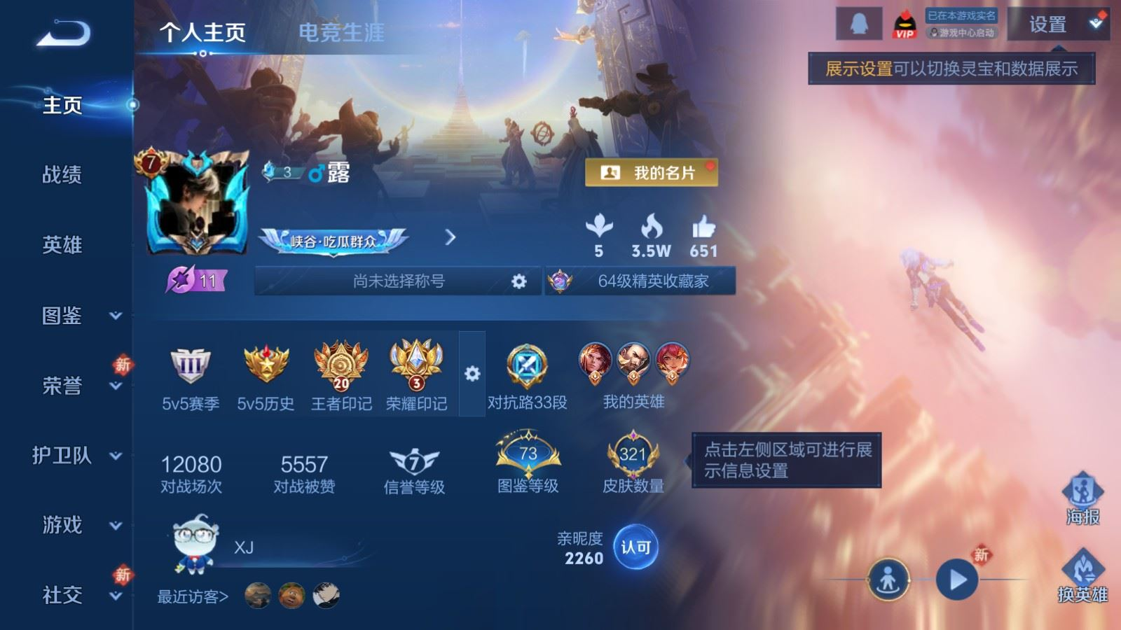 贵族等级:v8皮肤数:323情人节限定2 传说品质13 生肖限定4 珍品传说1 荣耀典藏1 英雄数:128