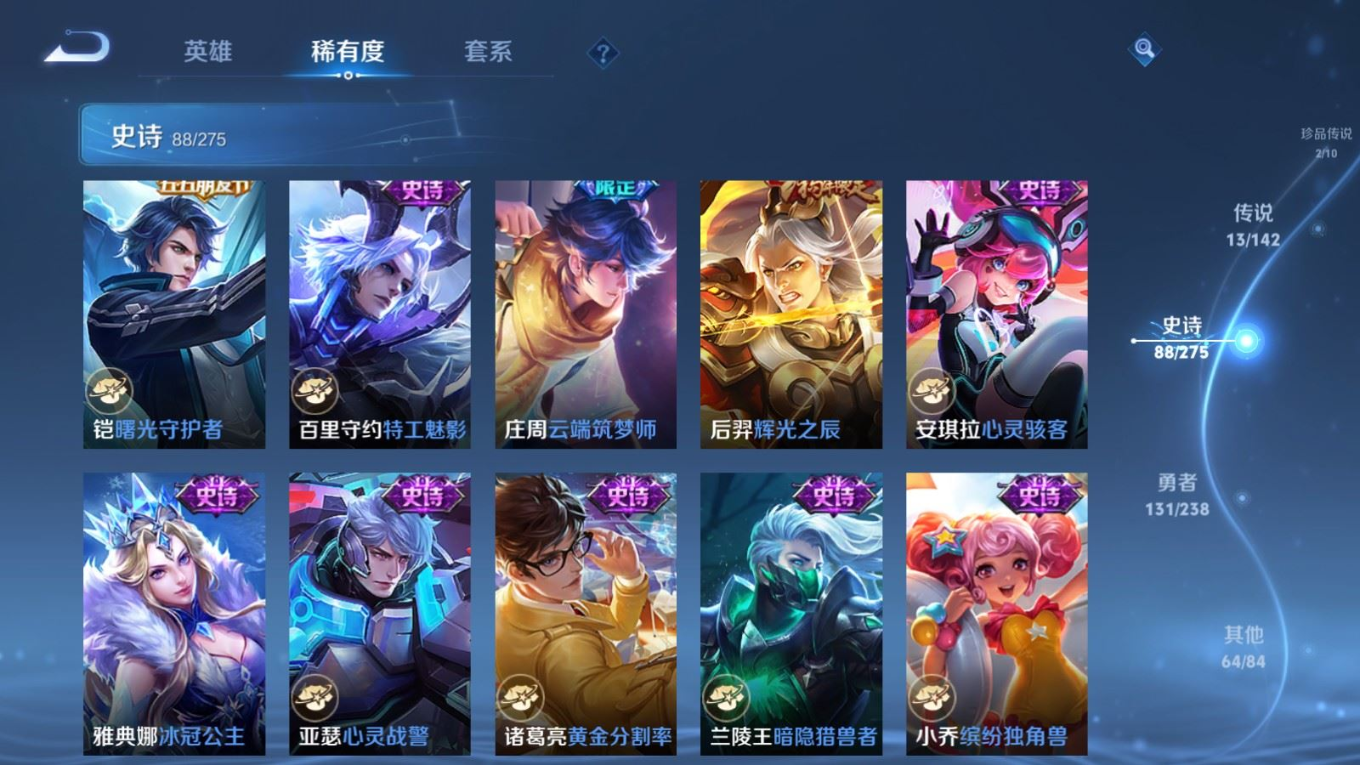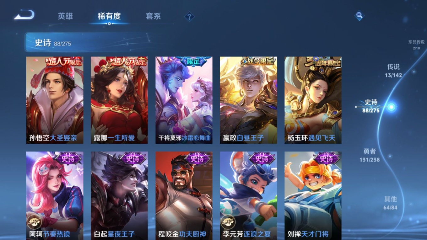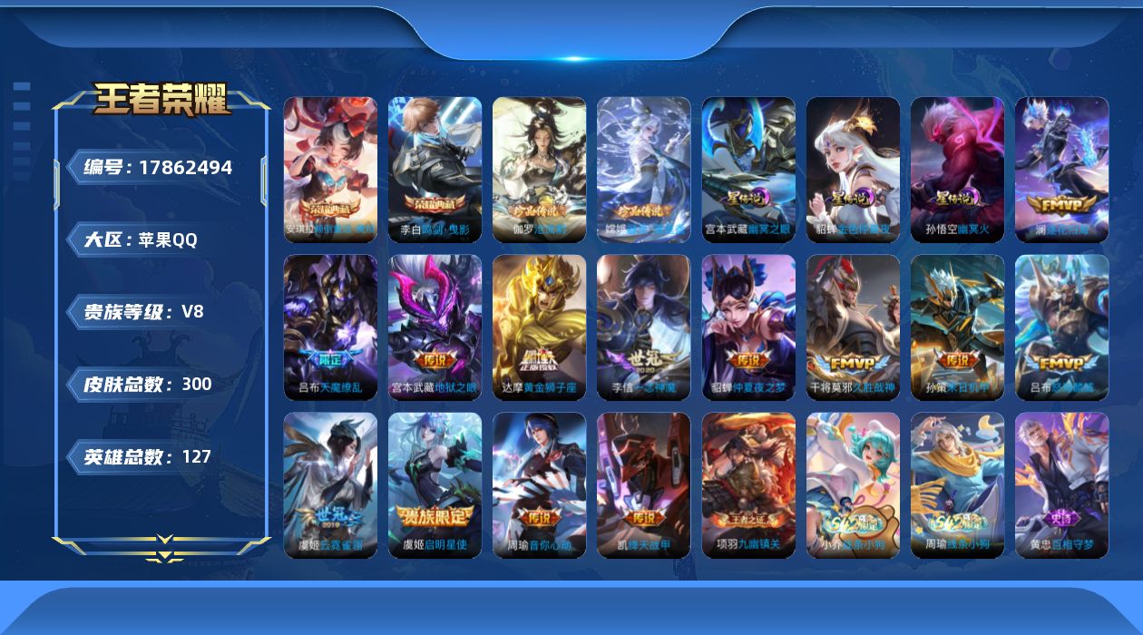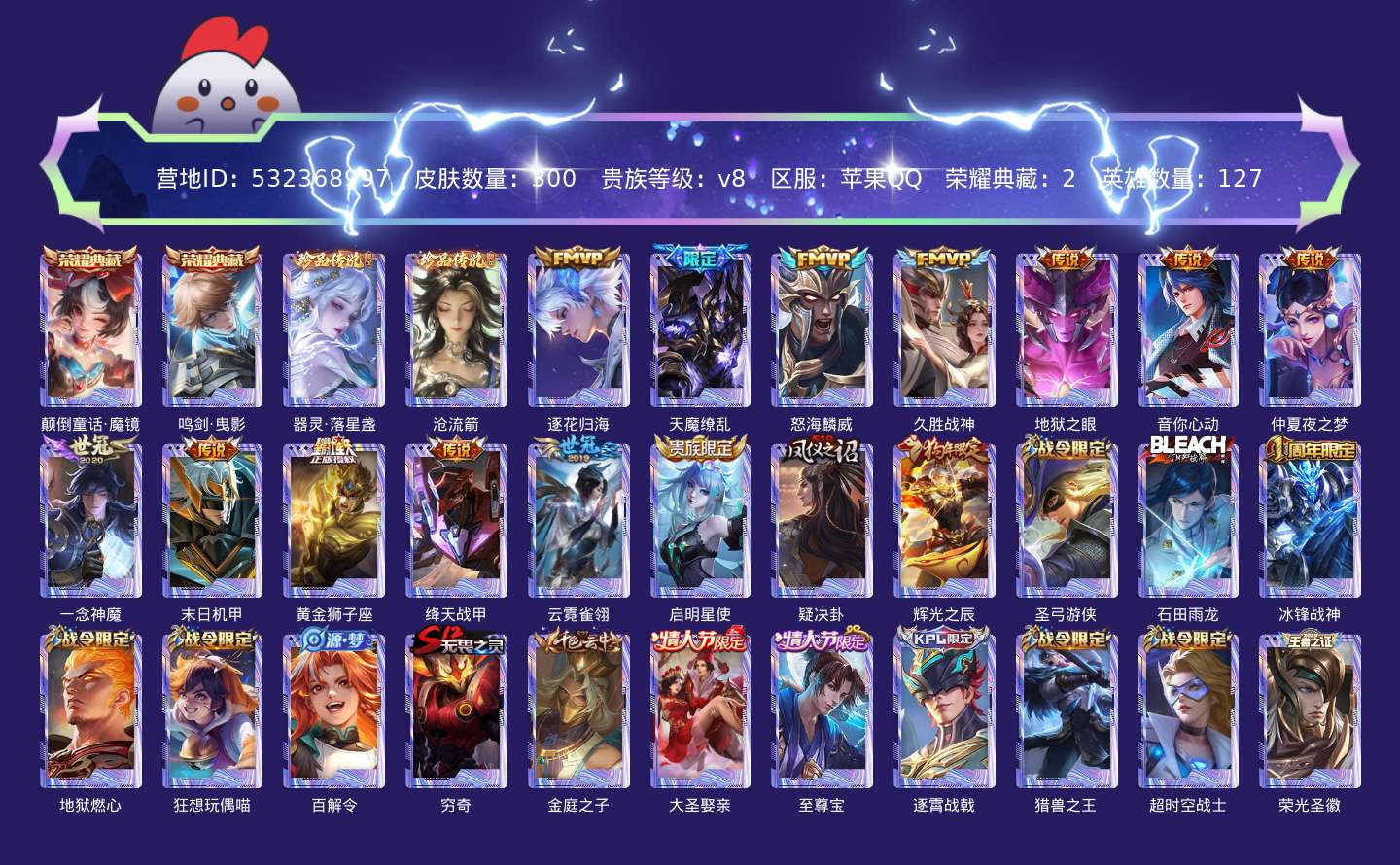 贵族等级:v8皮肤数:300生肖限定2 传说品质13 情人节限定3 荣耀典藏2 珍品传说2 英雄数:127