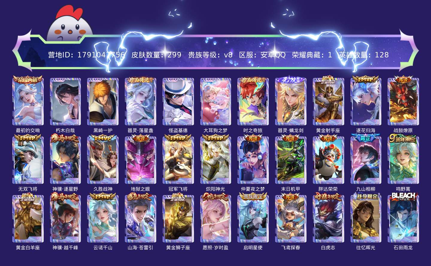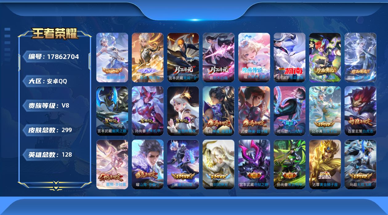 贵族等级:v8皮肤数:299传说品质23 情人节限定1 生肖限定6 珍品传说6 荣耀典藏1 无双1 英雄数:128