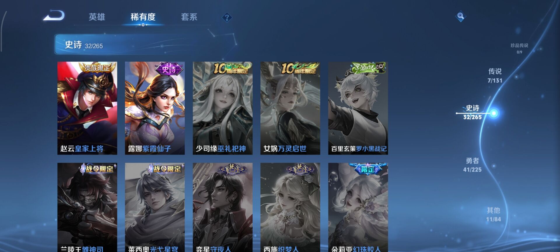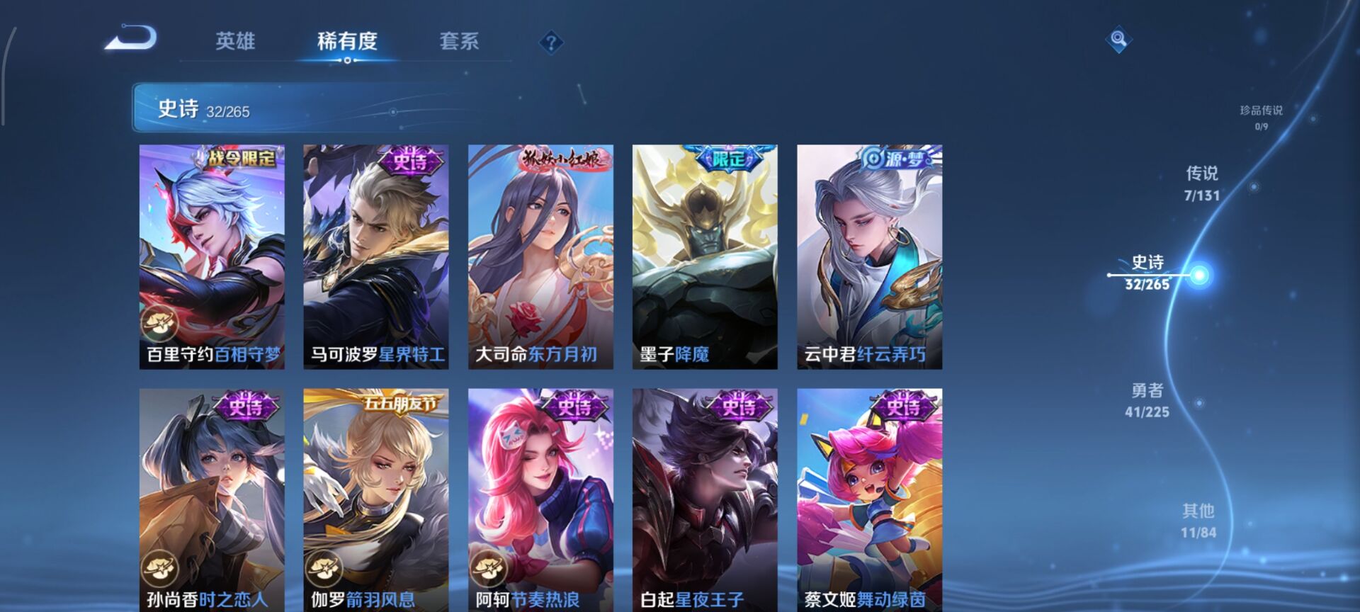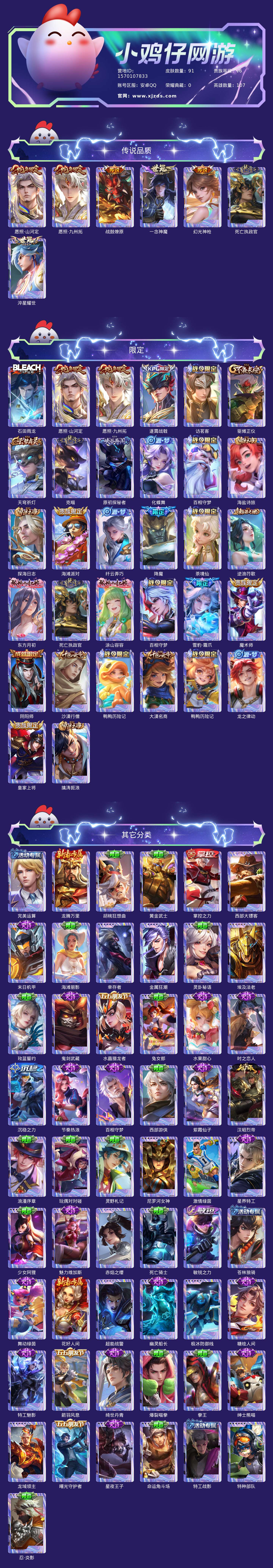 贵族等级:v6皮肤数:91传说品质7 生肖限定2 英雄数:107