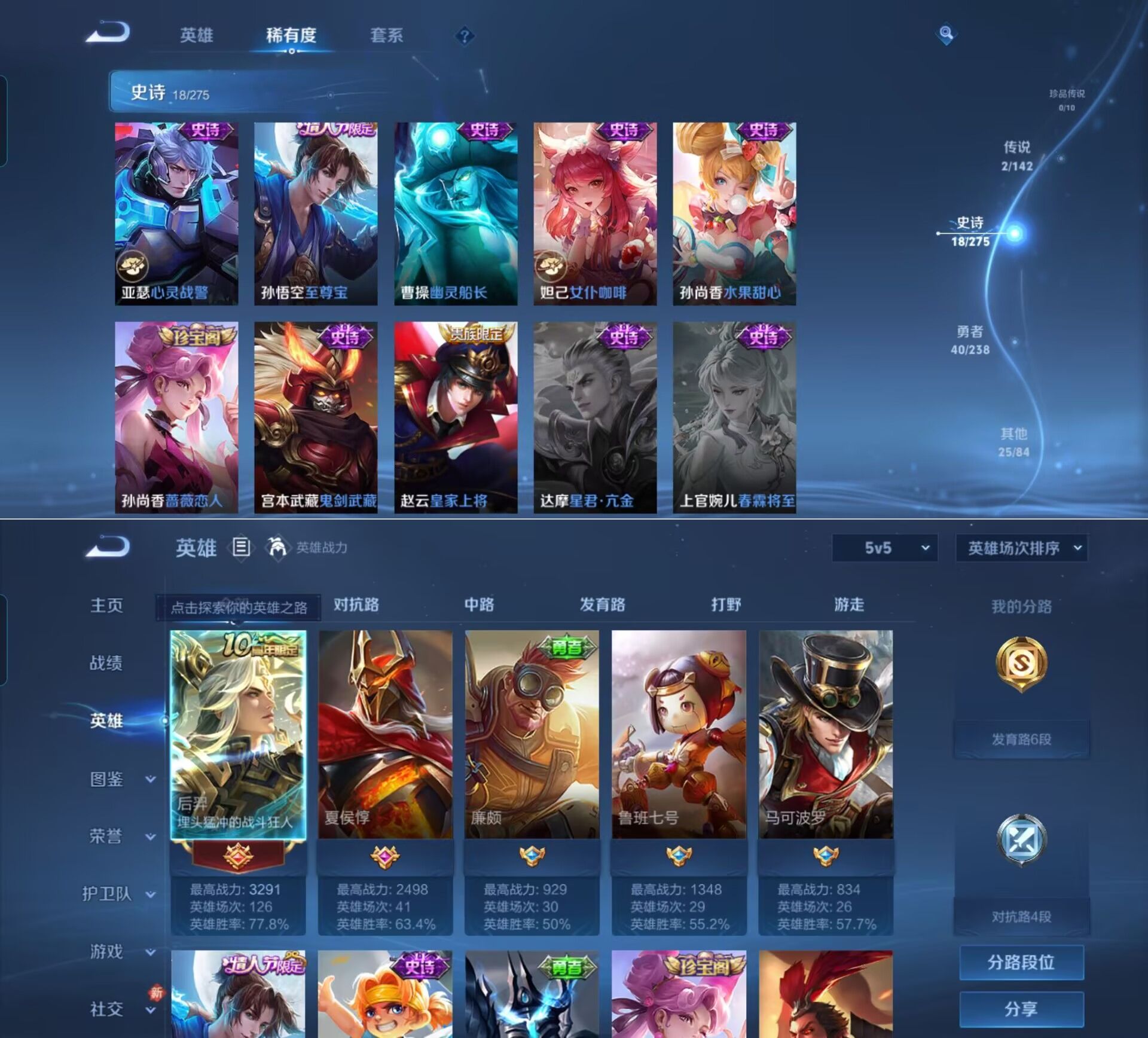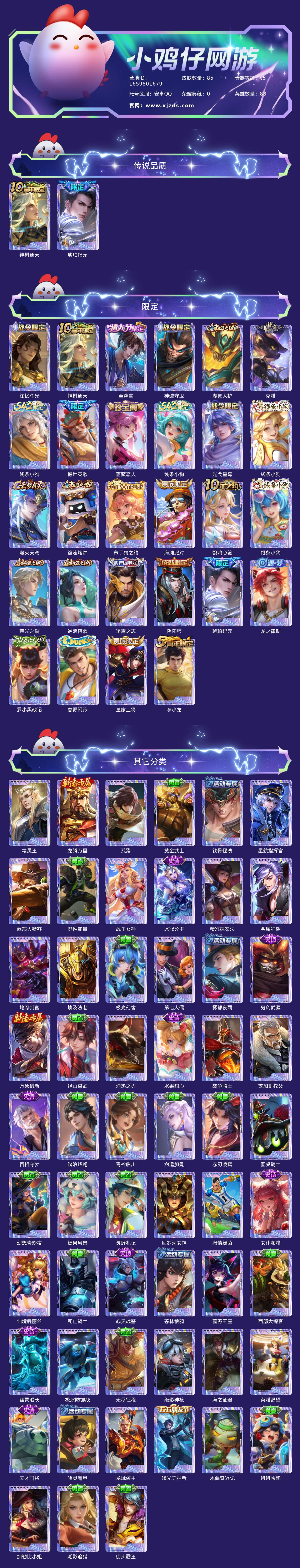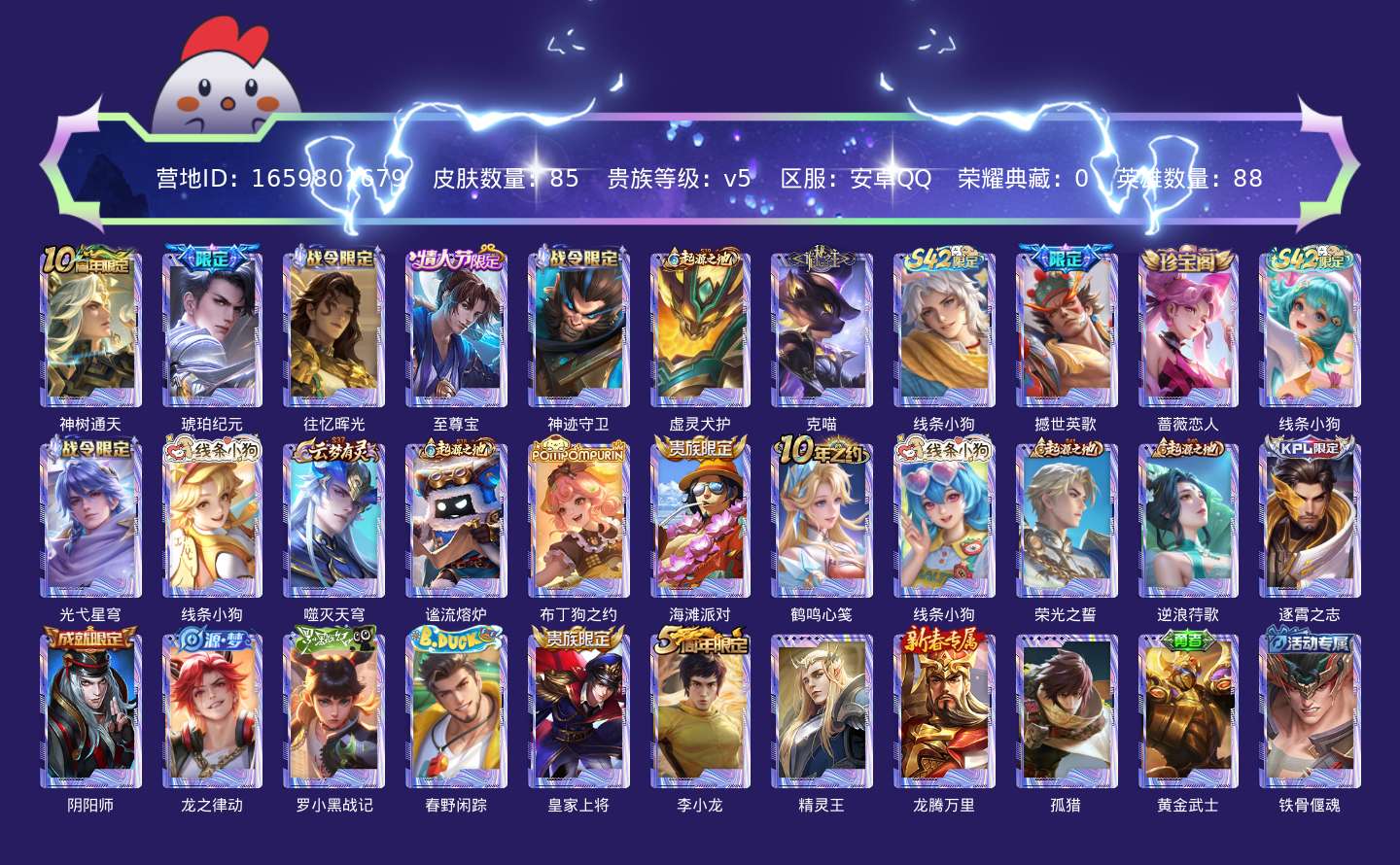 贵族等级:v5皮肤数:85传说品质2 情人节限定1 英雄数:88