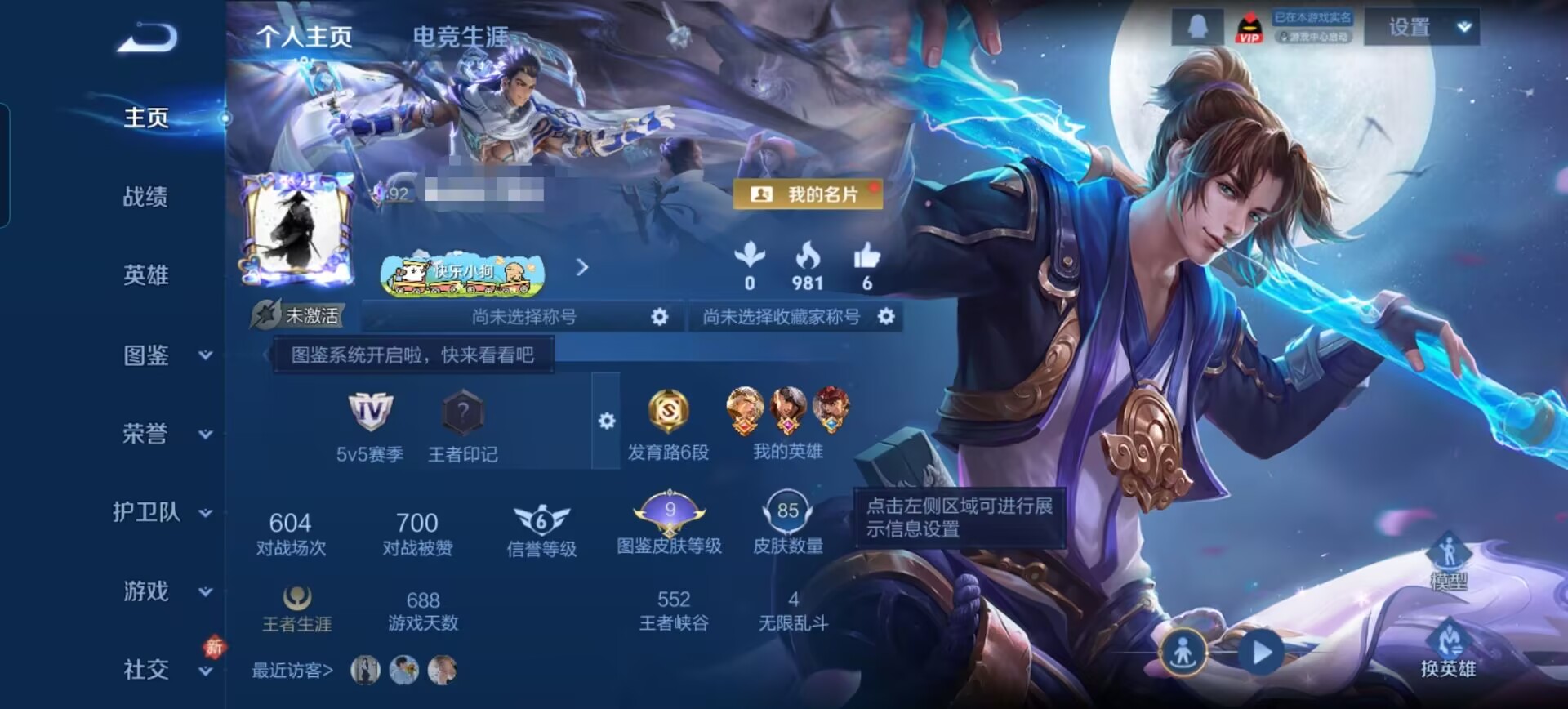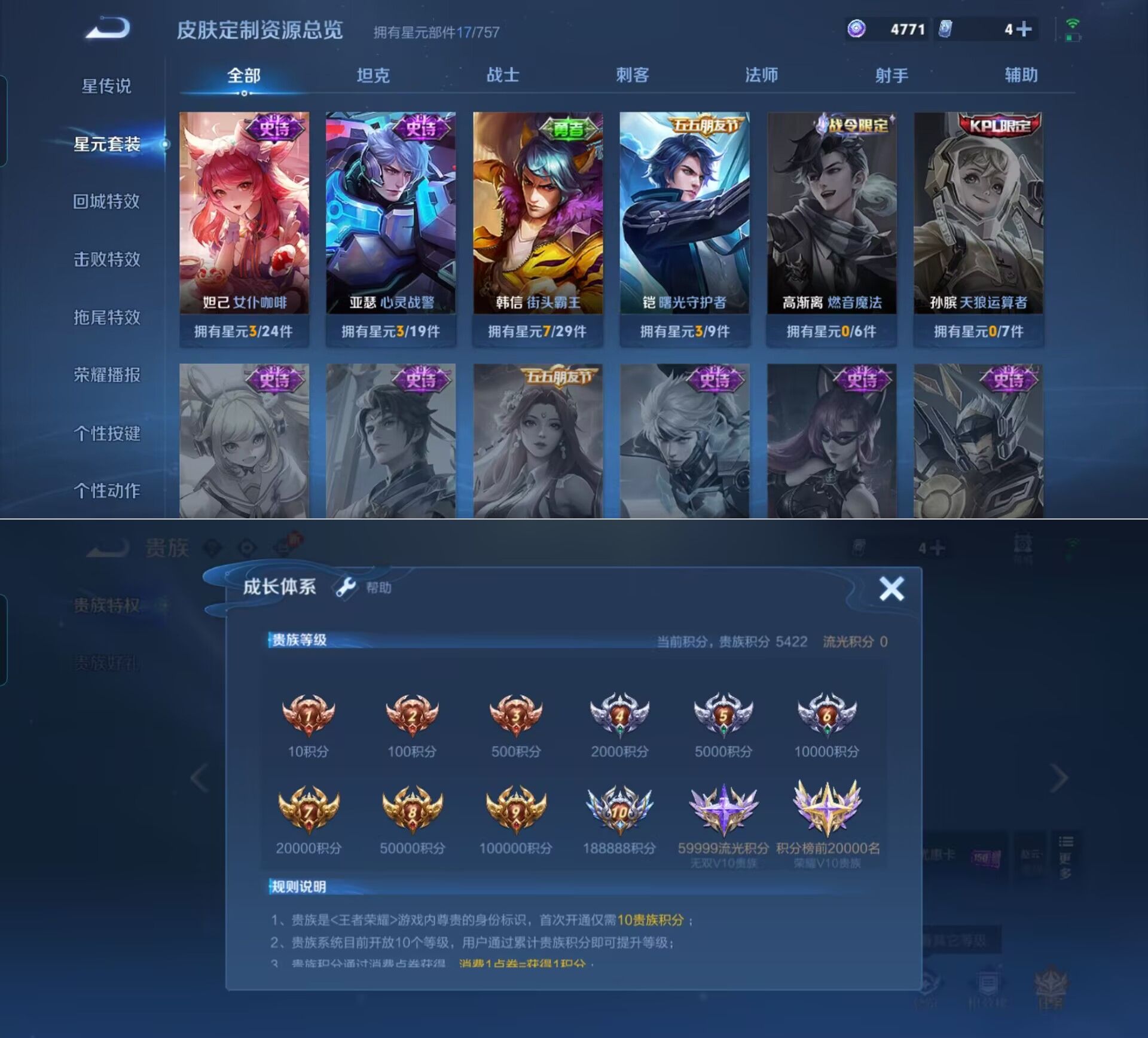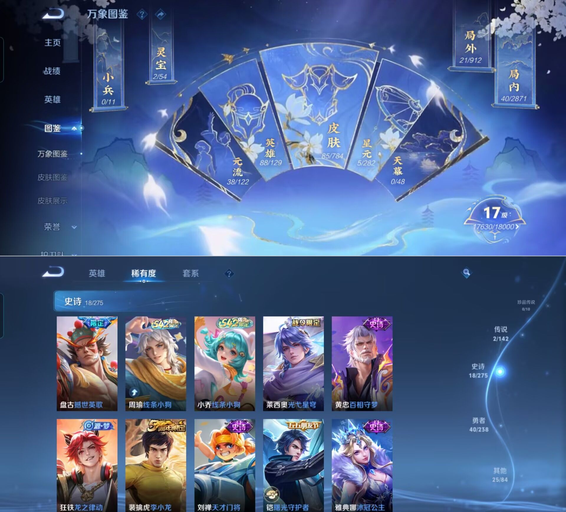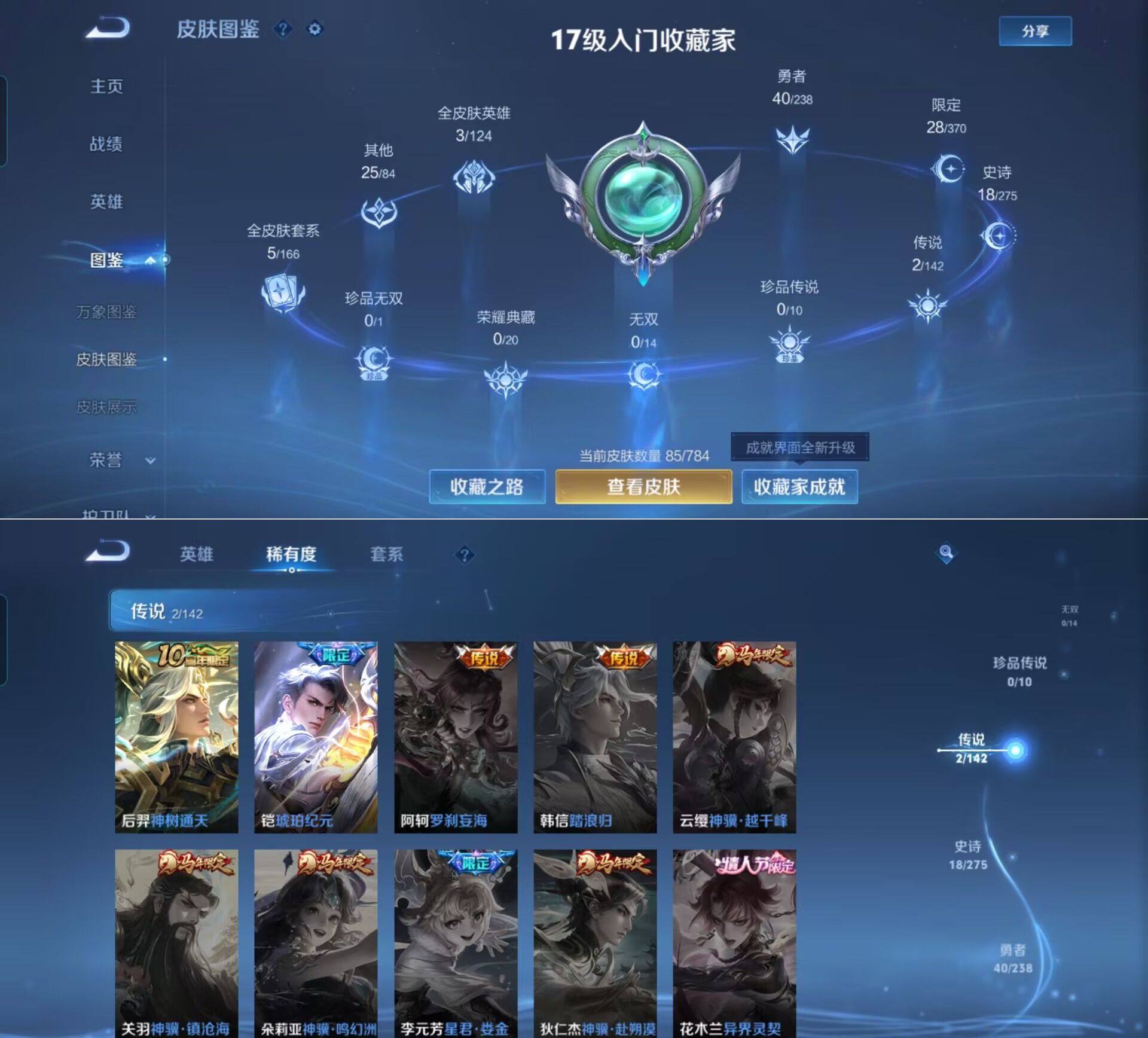 贵族等级:v5皮肤数:85传说品质2 情人节限定1 英雄数:88