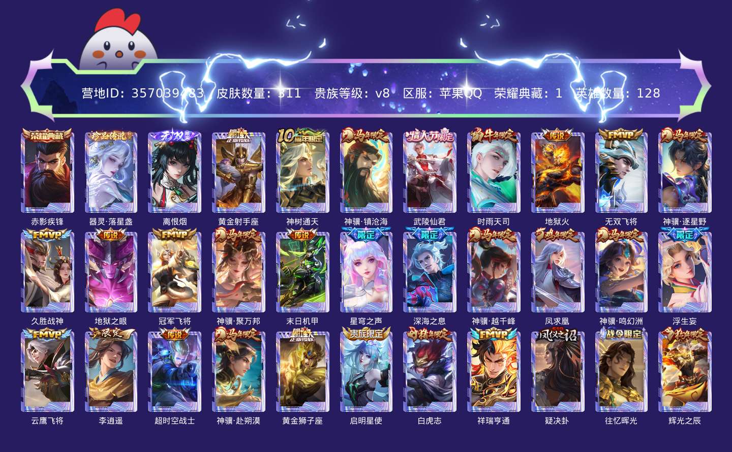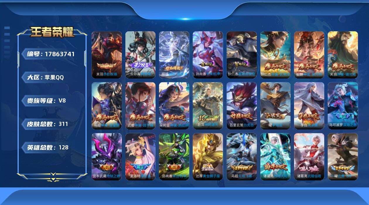 贵族等级:v8皮肤数:311生肖限定13 传说品质27 荣耀典藏1 情人节限定5 珍品传说1 无双1 英雄数:128