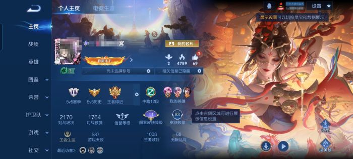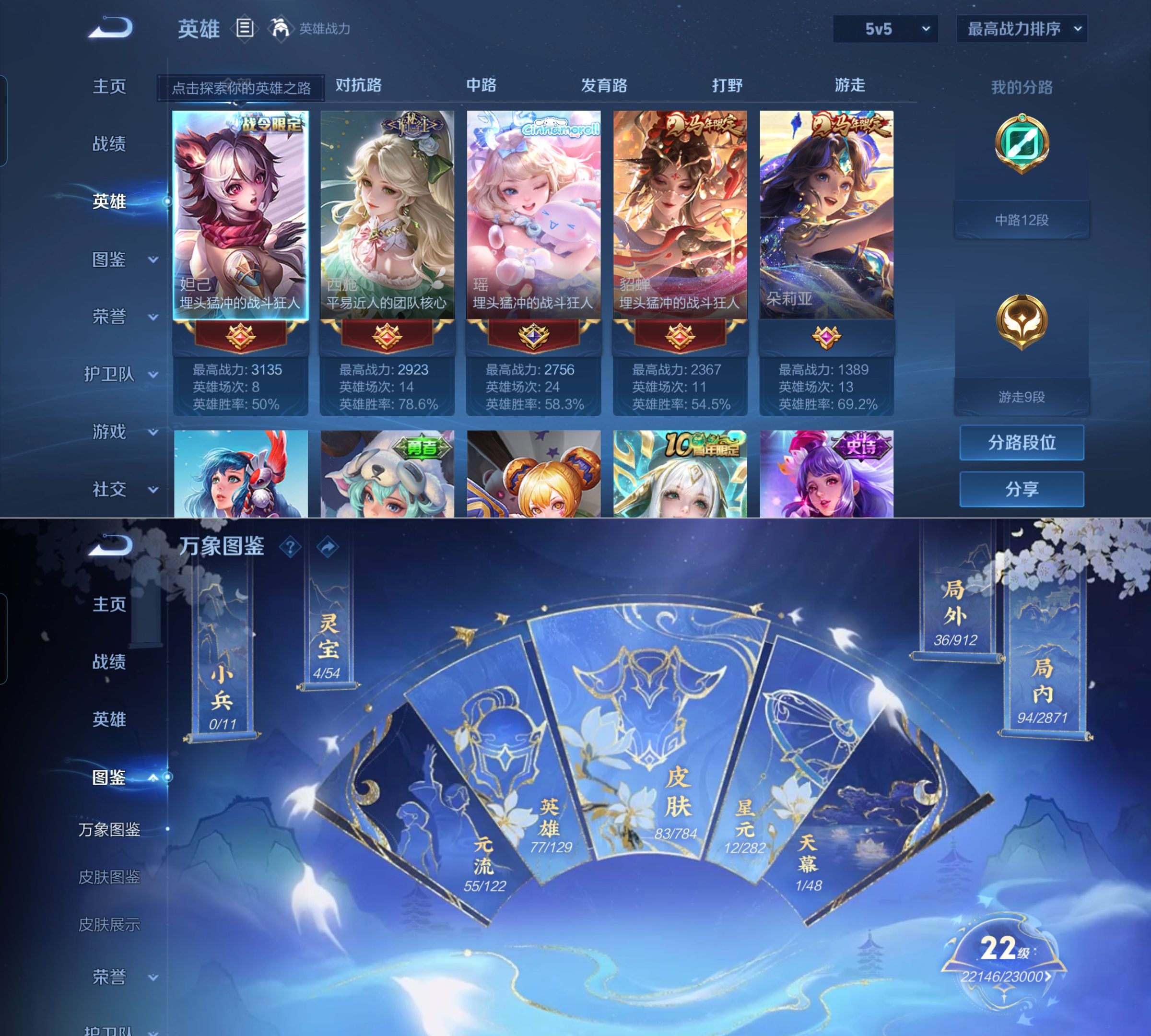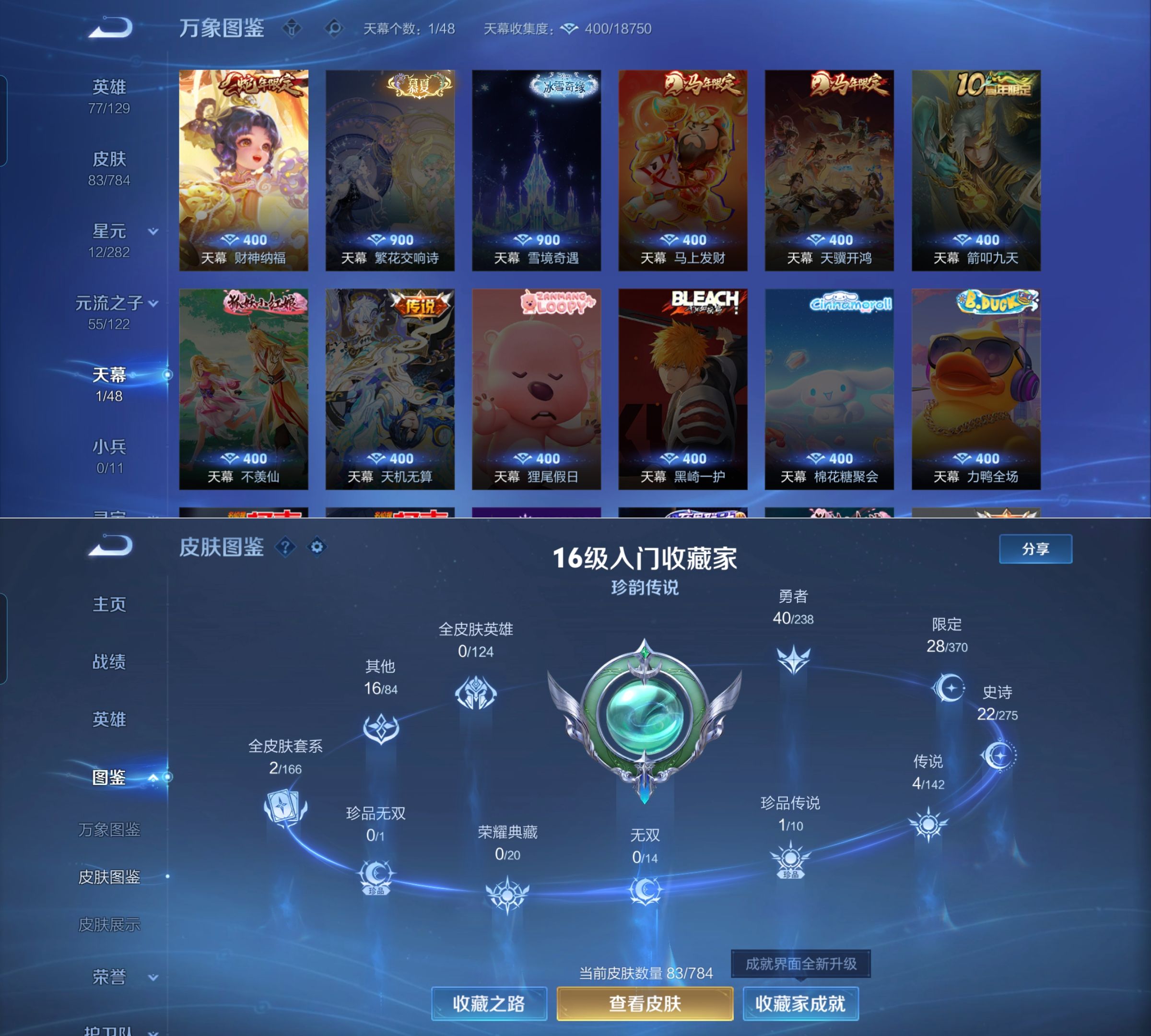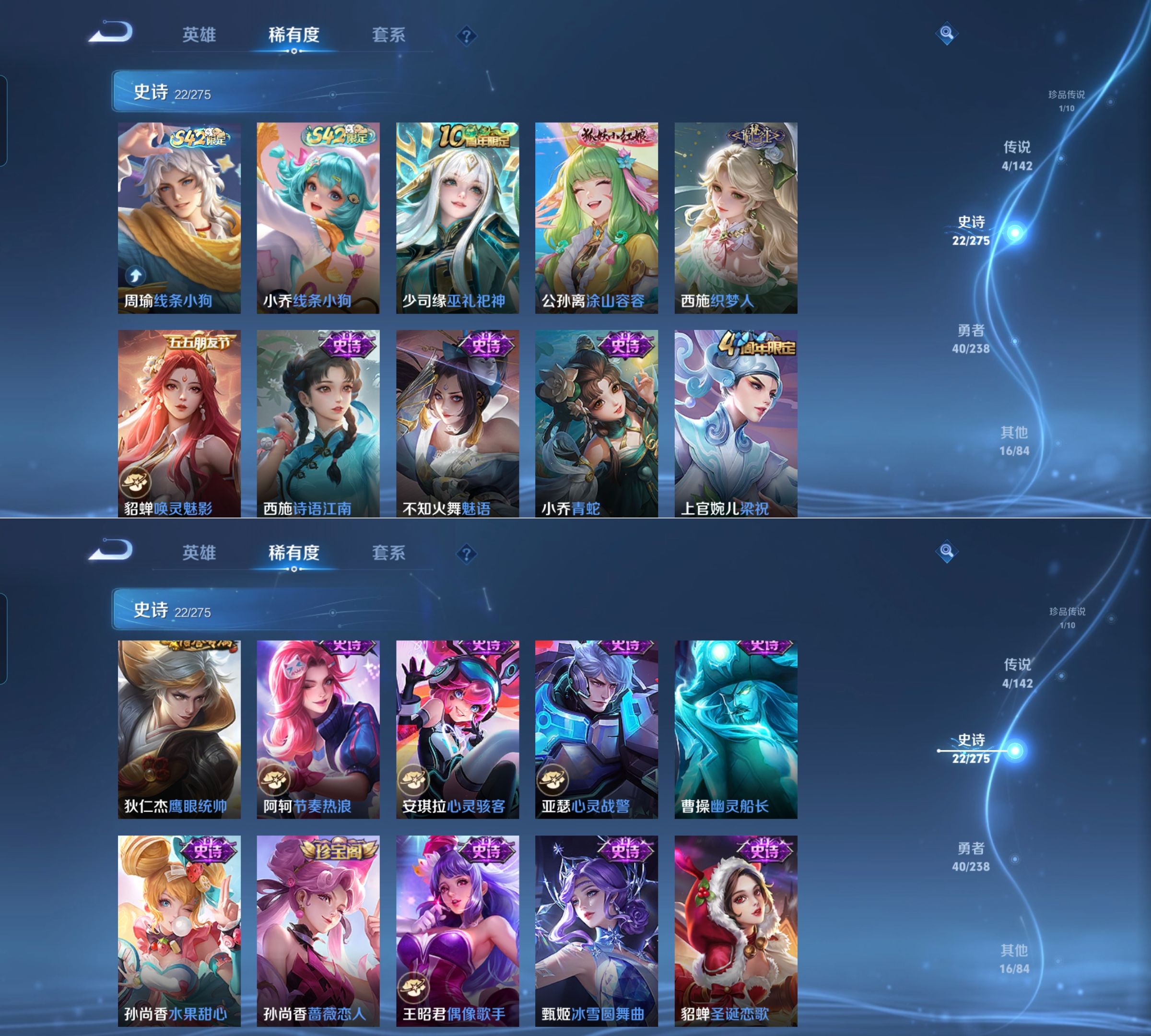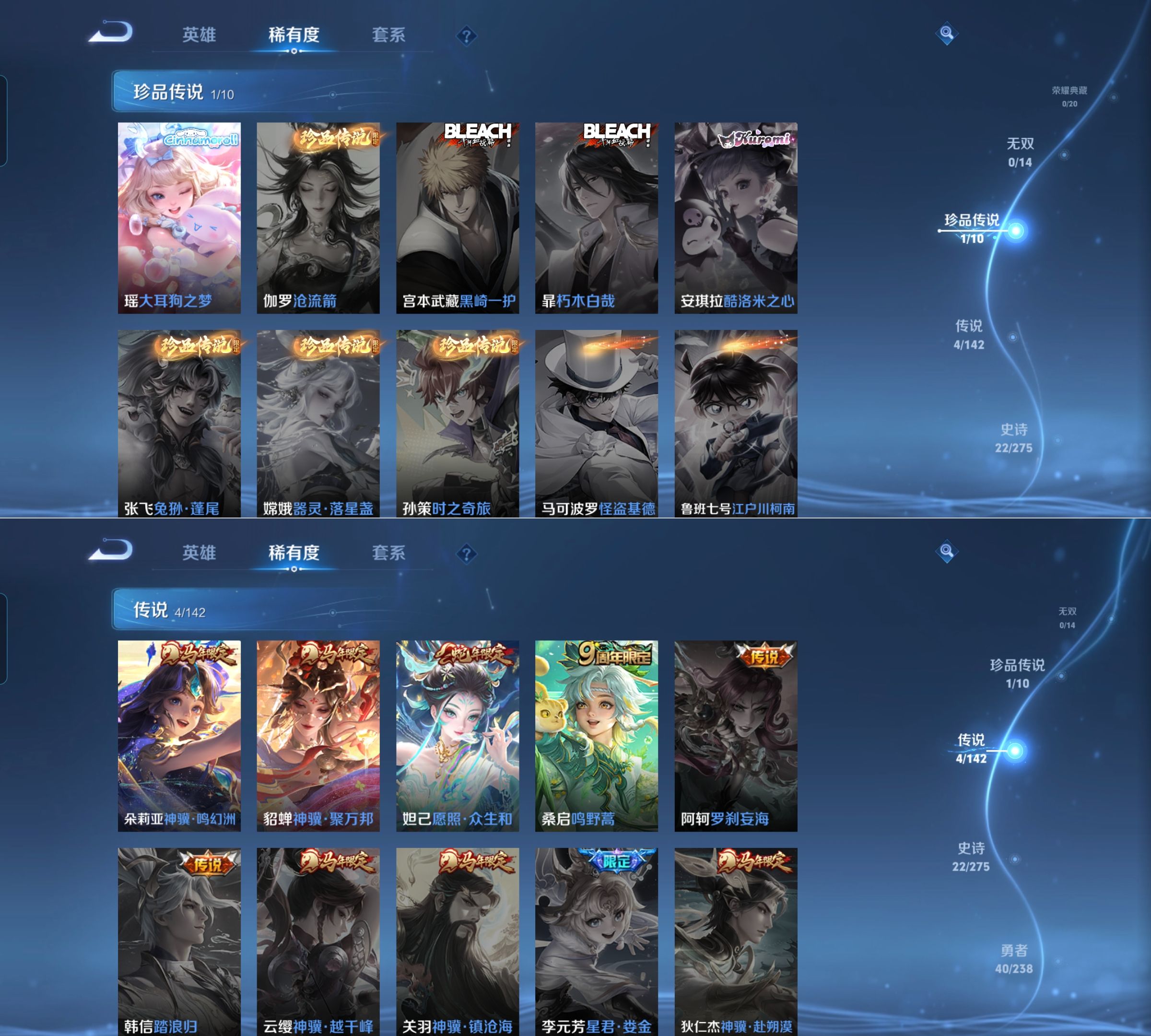 贵族等级:v5皮肤数:83传说品质4 生肖限定3 珍品传说1 英雄数:77