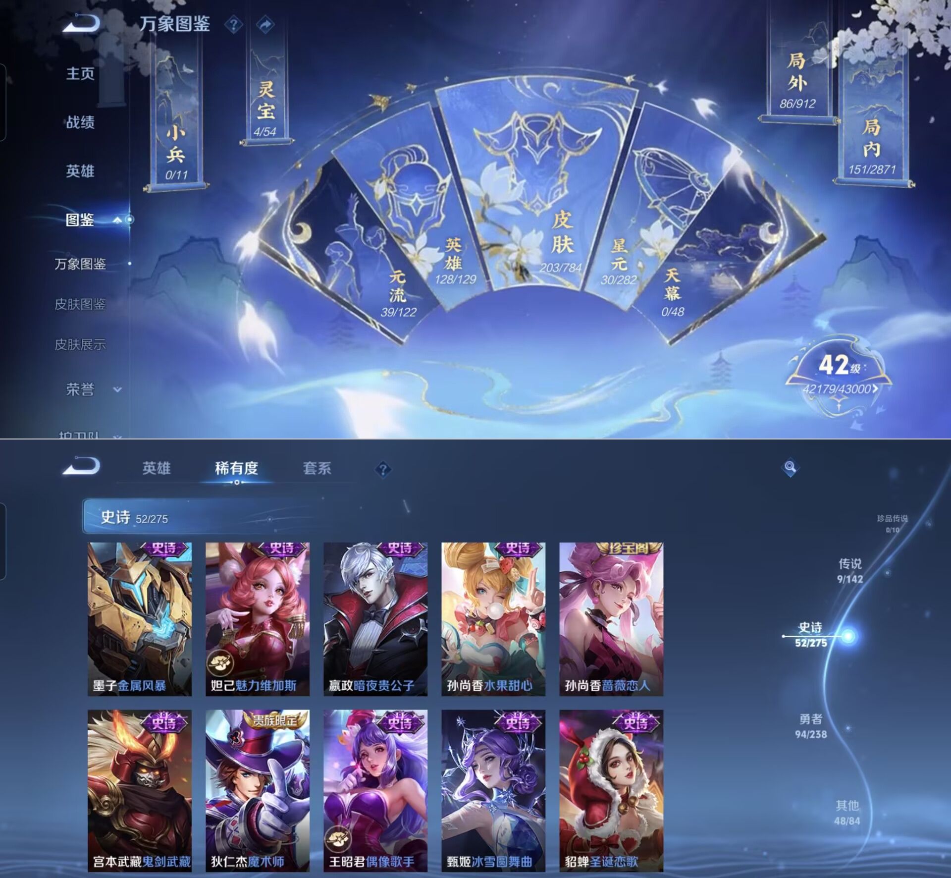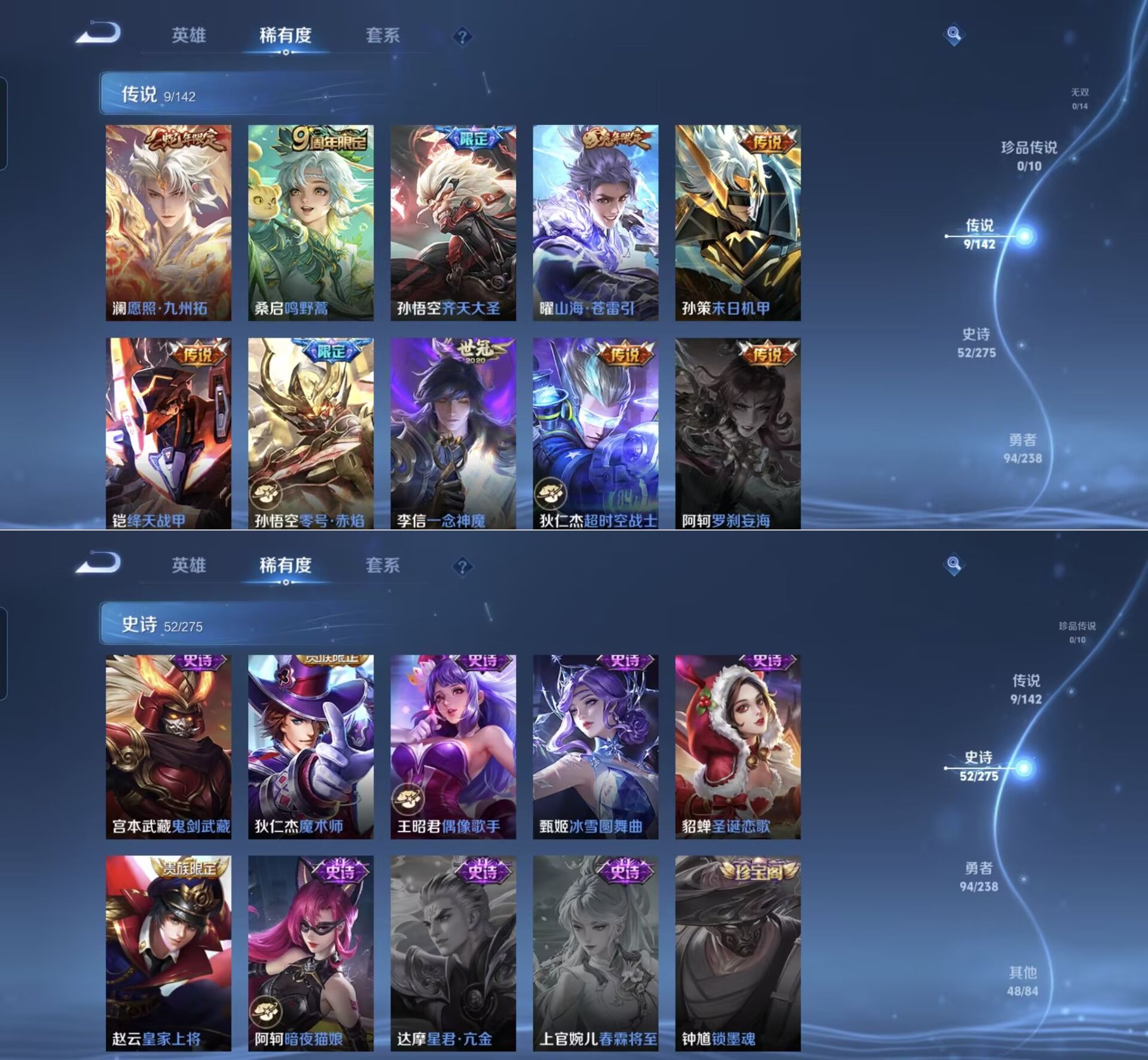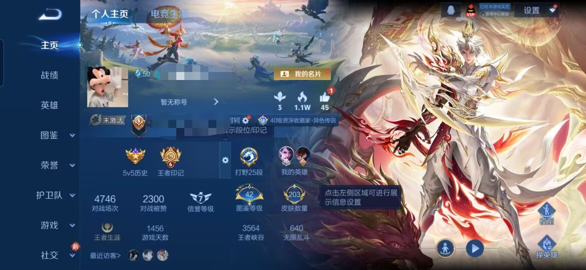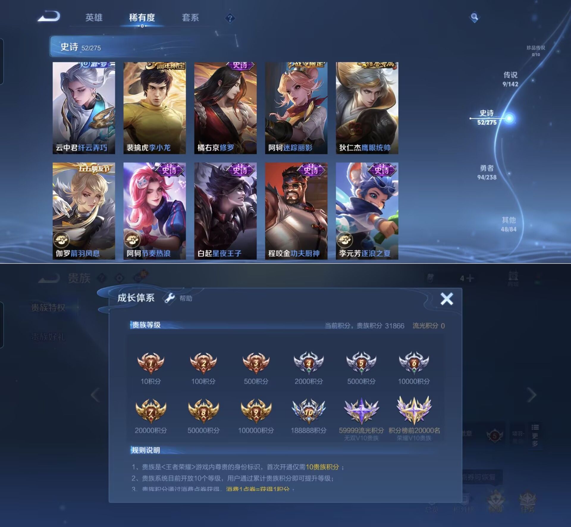 贵族等级:v7皮肤数:203传说品质9 生肖限定3 英雄数:128