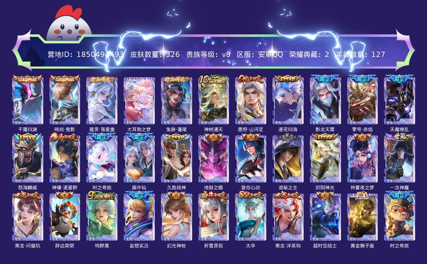 传说品质_后羿_神树通天传说品质_司空震_愿照·山河定传说品质_澜_逐花归海传说品质_兰陵王_影龙天霄传说品质_孙悟空_零号·赤焰传说品质_吕布_天魔缭乱传说品质_吕布_怒海麟威传说品质_马超_神骥·逐星野传说品质_大乔_时之奇旅传说品质_干将莫邪_画中仙传说品质_干将莫邪_久胜战神传说品质_宫本武藏_地狱之眼传说品质_周瑜_音你心动传说品质_元歌_诡秘之主传说品质_镜_炽阳神光传说品质_貂蝉_仲夏夜之梦传说品质_李信_一念神魔传说品质_孙尚香_乘龙·问璇玑传说品质_梦奇_胖达荣荣传说品质_桑启_鸣野蒿传说品质_马可波罗_妄想实况传说品质_云缨_幻光神枪传说品质_公孙离_祈雪灵祝传说品质_伽罗_太华传说品质_孙策_乘龙·淬吴钩传说品质_狄仁杰_超时空战士传说品质_达摩_黄金狮子座传说品质_鲁班七号_时之奇旅传说品质_虞姬_云霓雀翎传说品质_虞姬_启明星使传说品质_赵云_乘龙·铭钟鼎传说品质_裴擒虎_寅虎·赤拳
