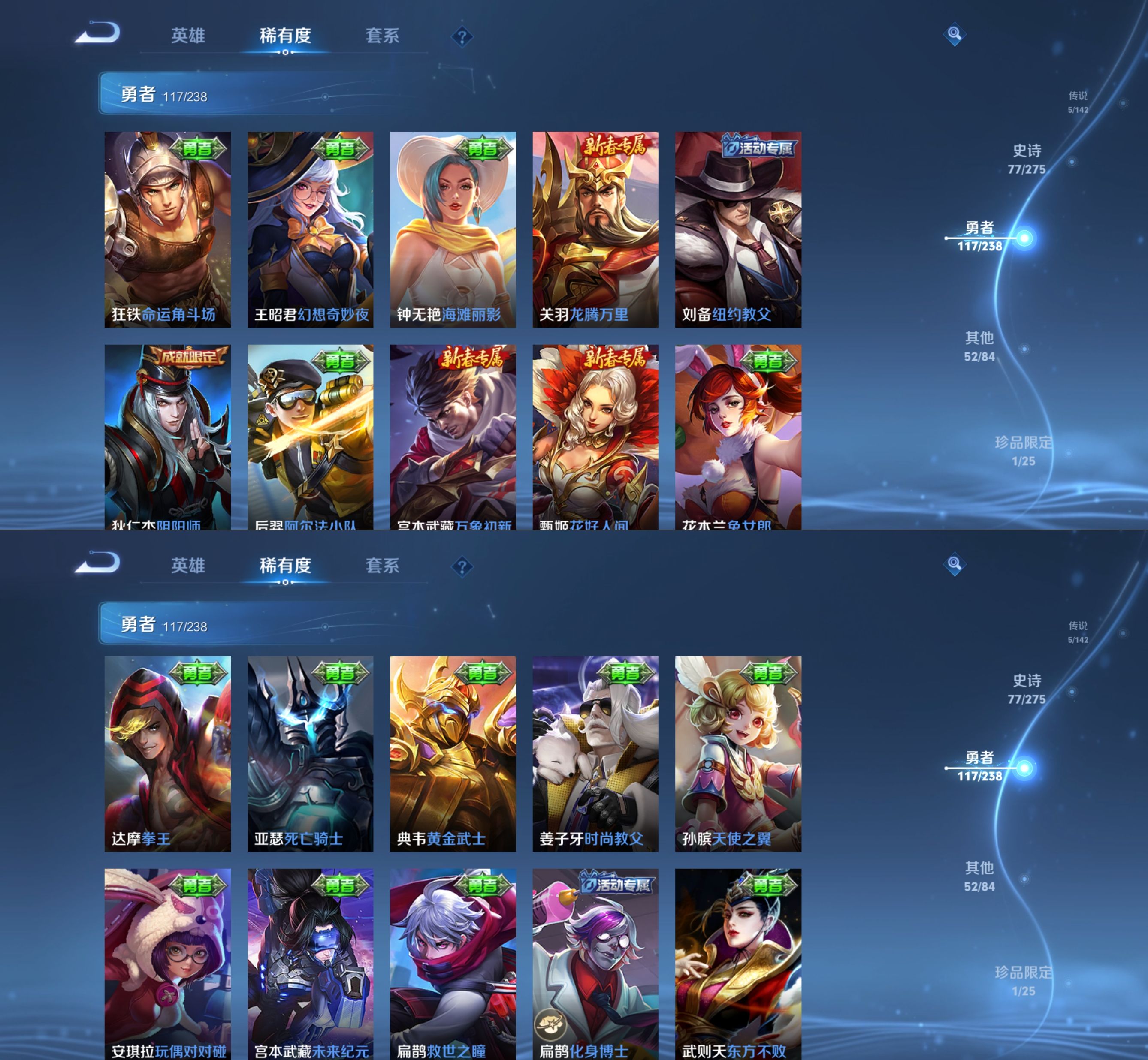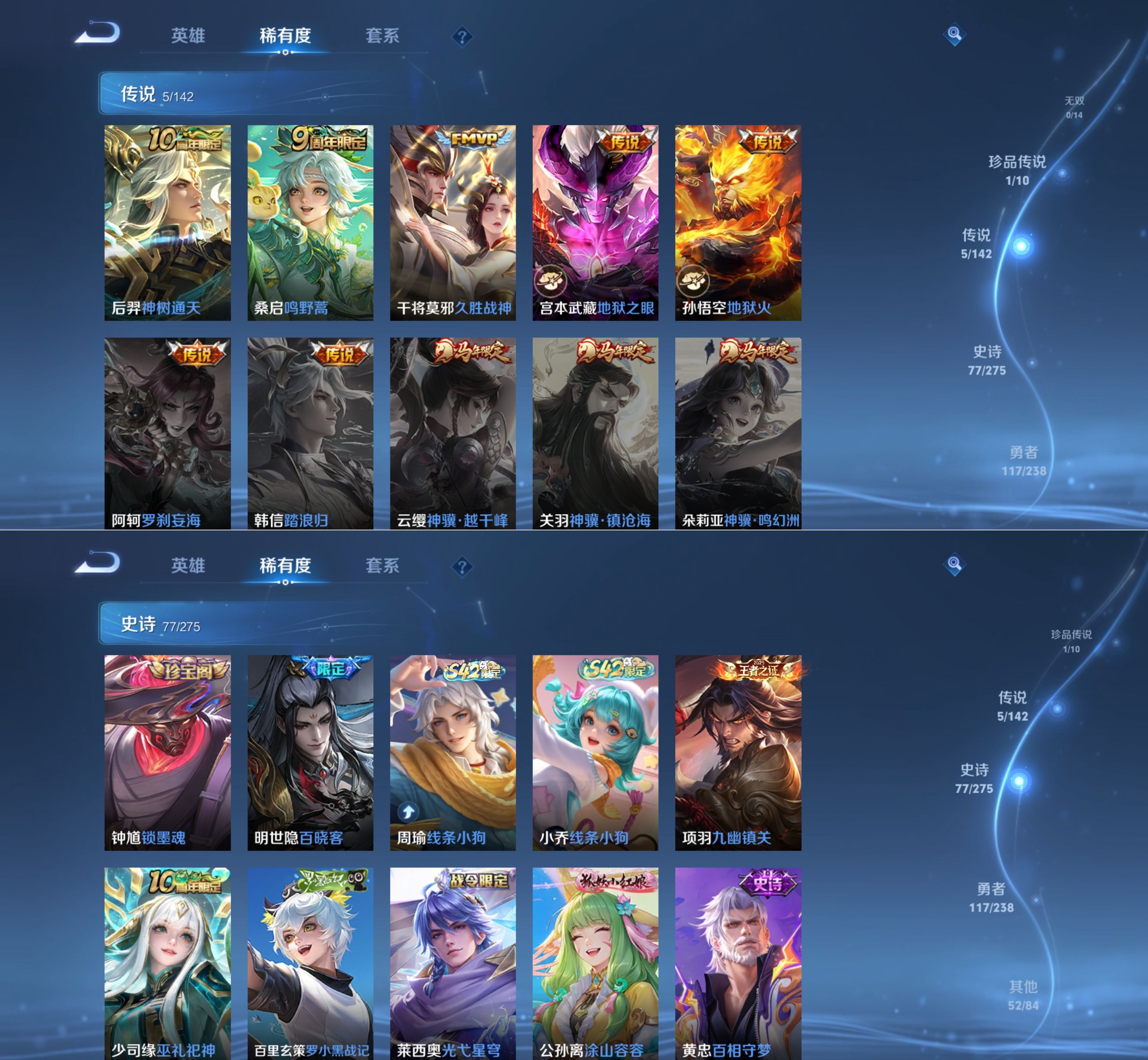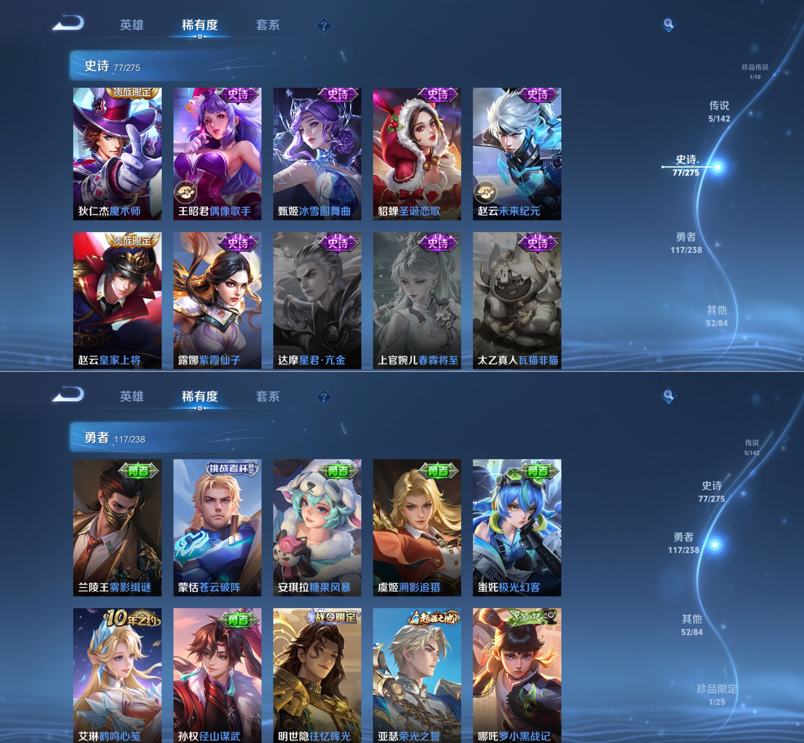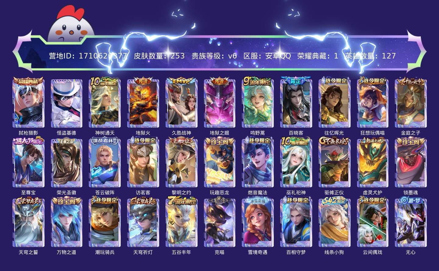 贵族等级:v6皮肤数:253传说品质5 情人节限定1 珍品传说1 荣耀典藏1 英雄数:127