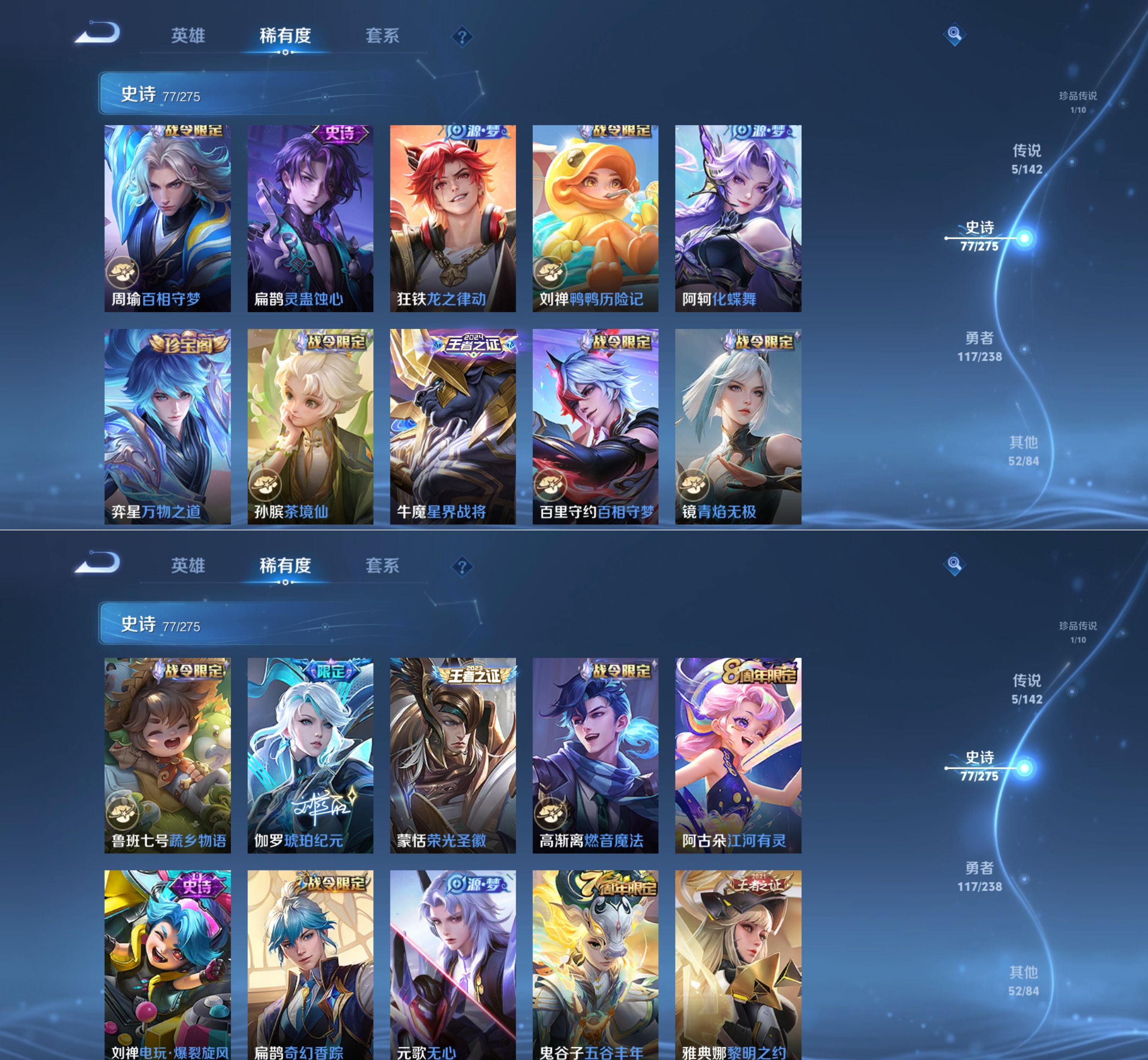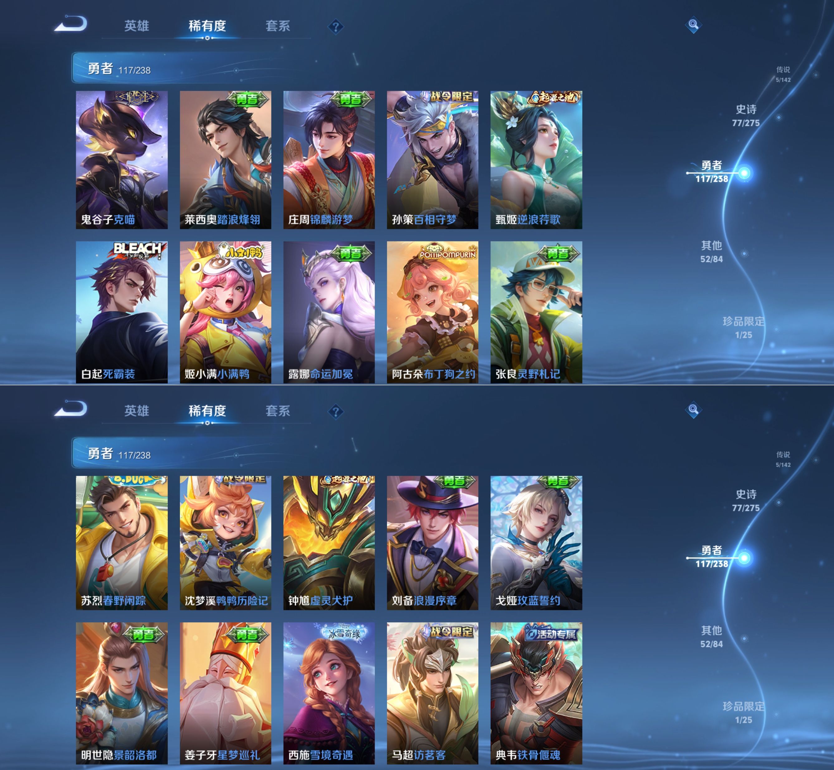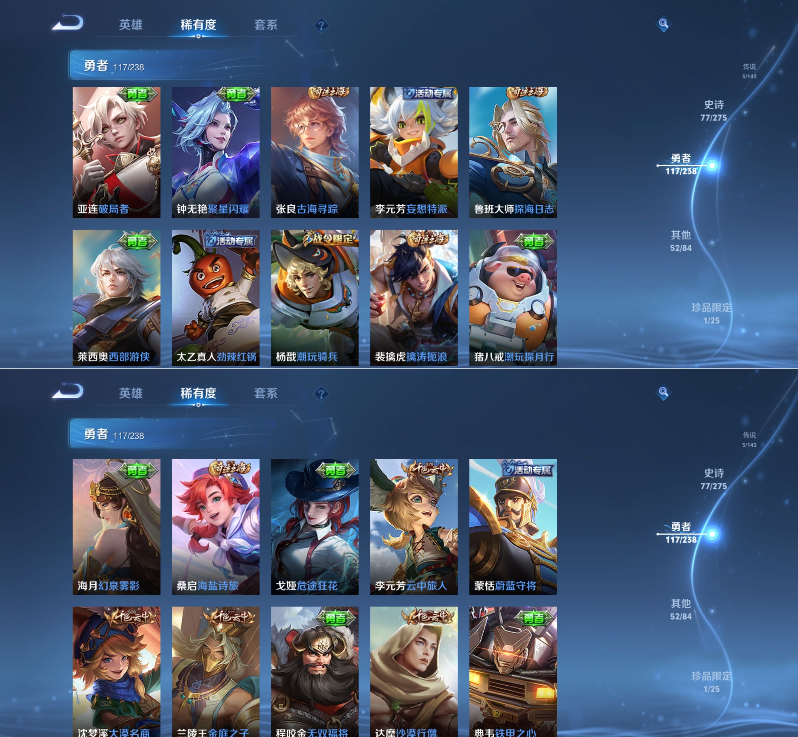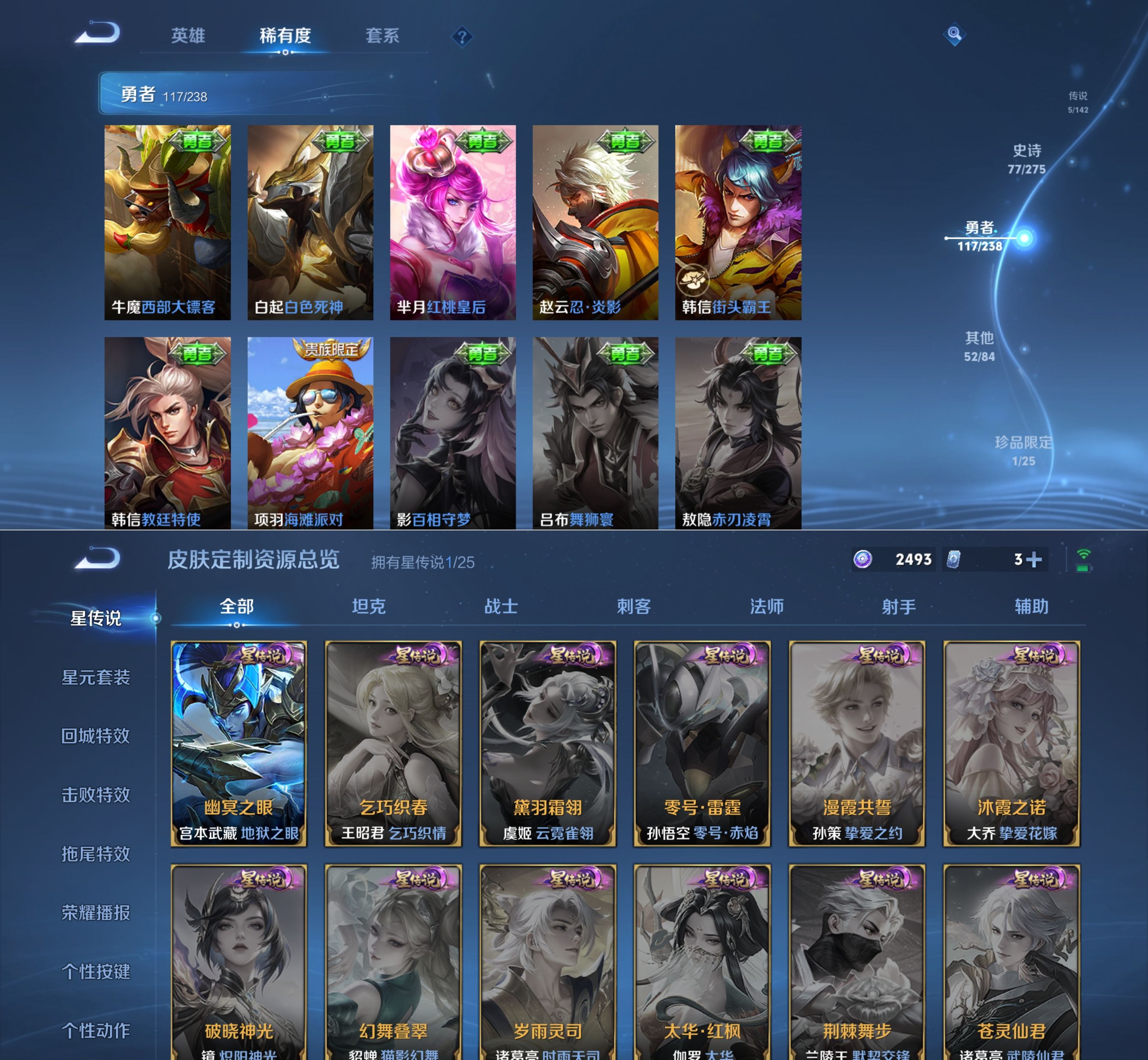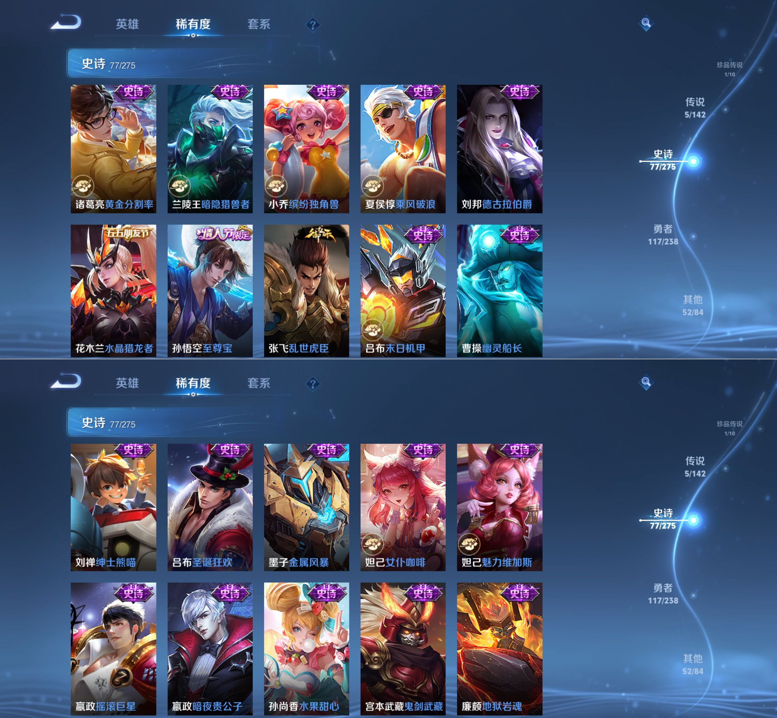 贵族等级:v6皮肤数:253传说品质5 情人节限定1 珍品传说1 荣耀典藏1 英雄数:127