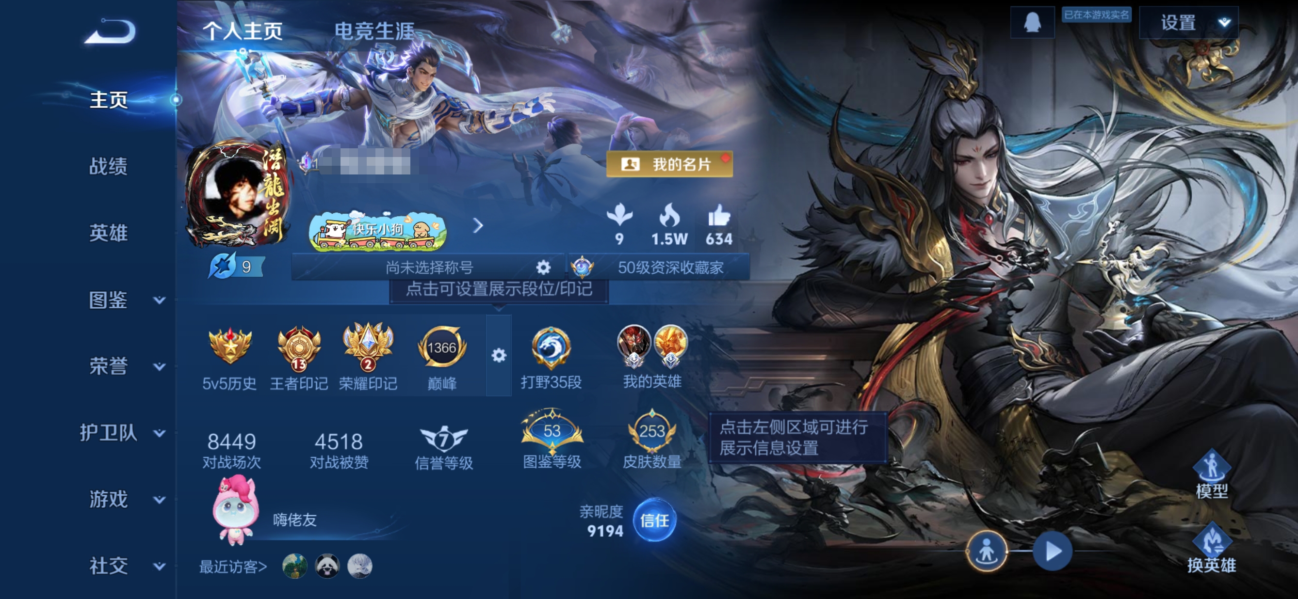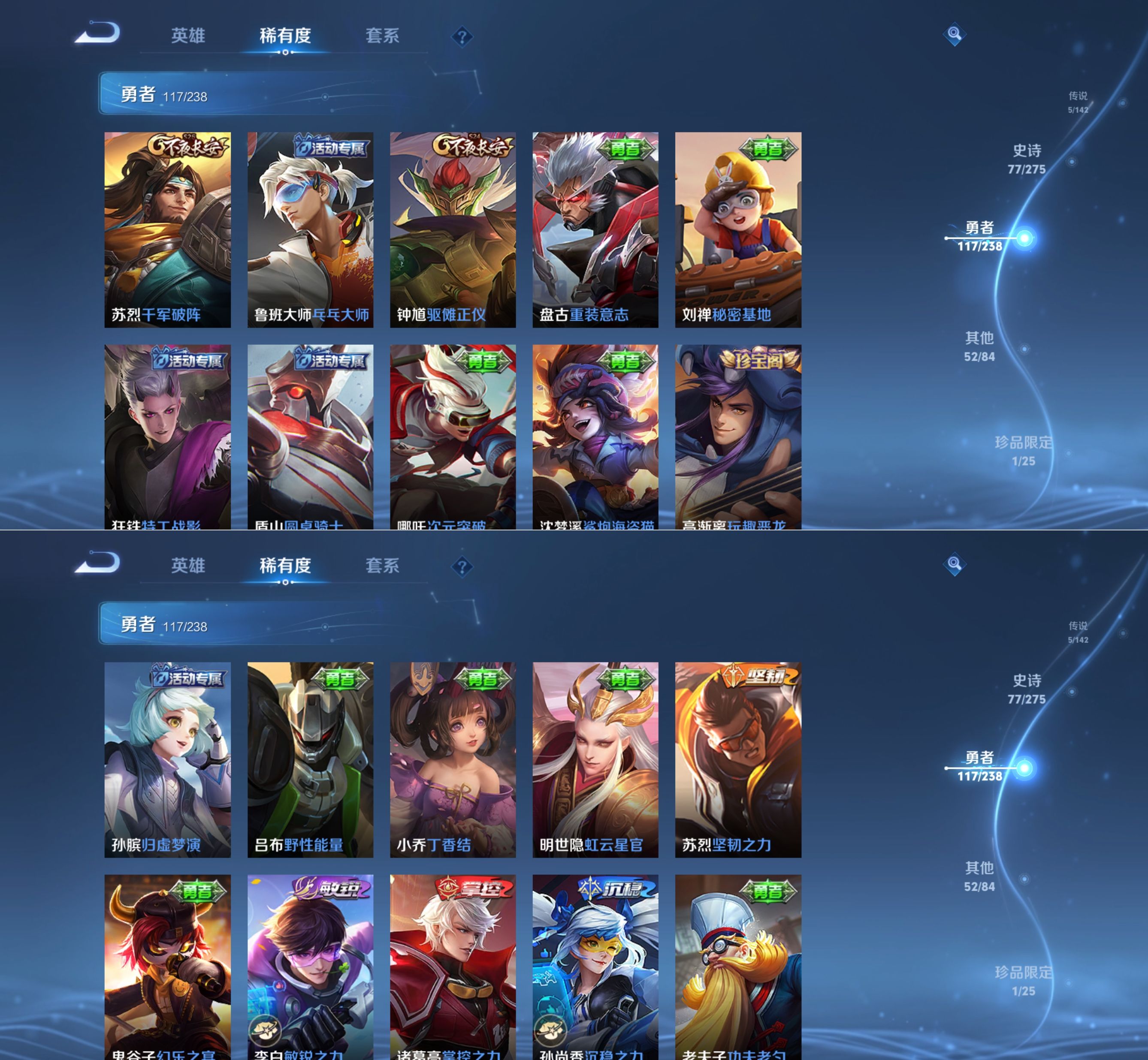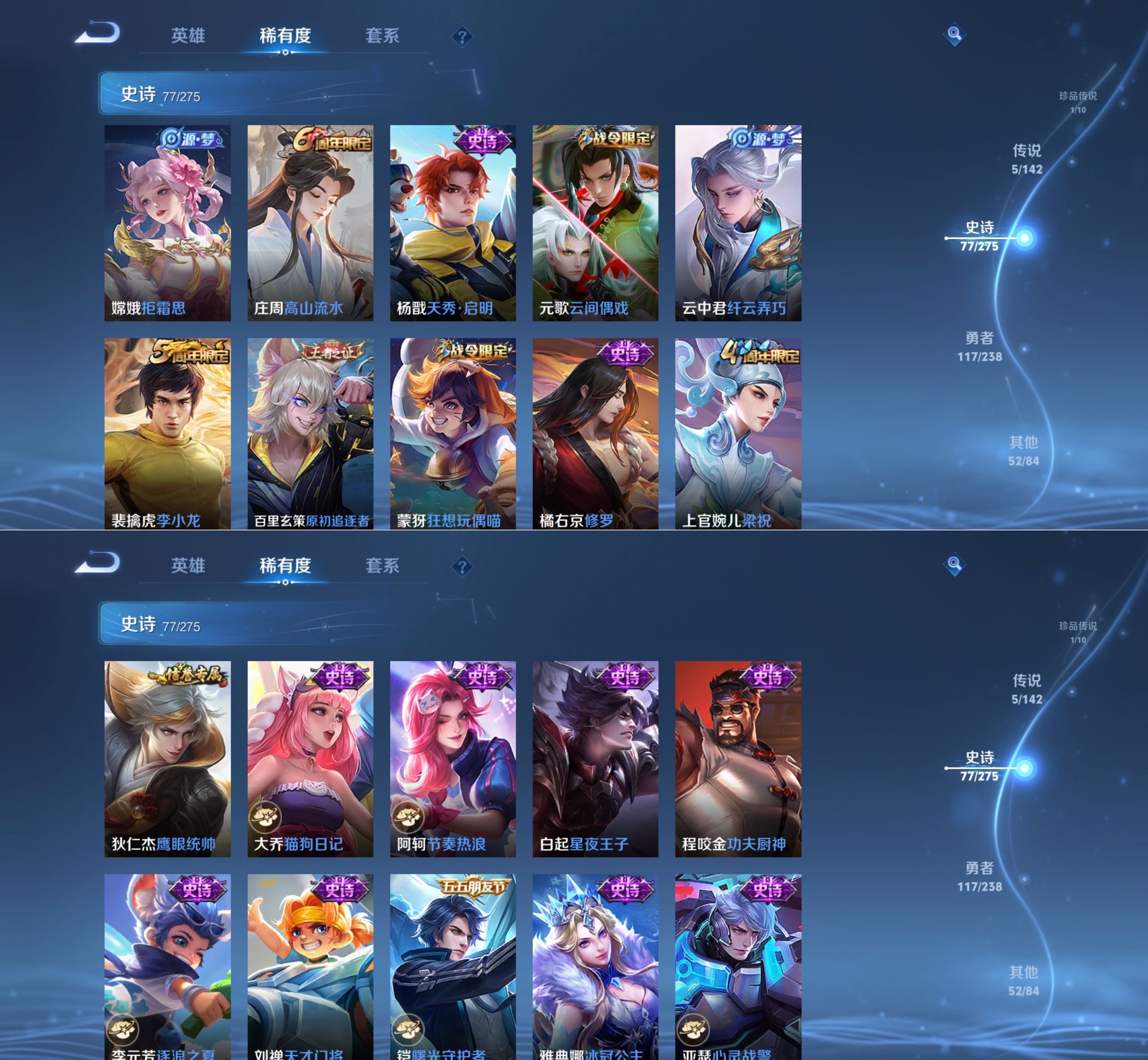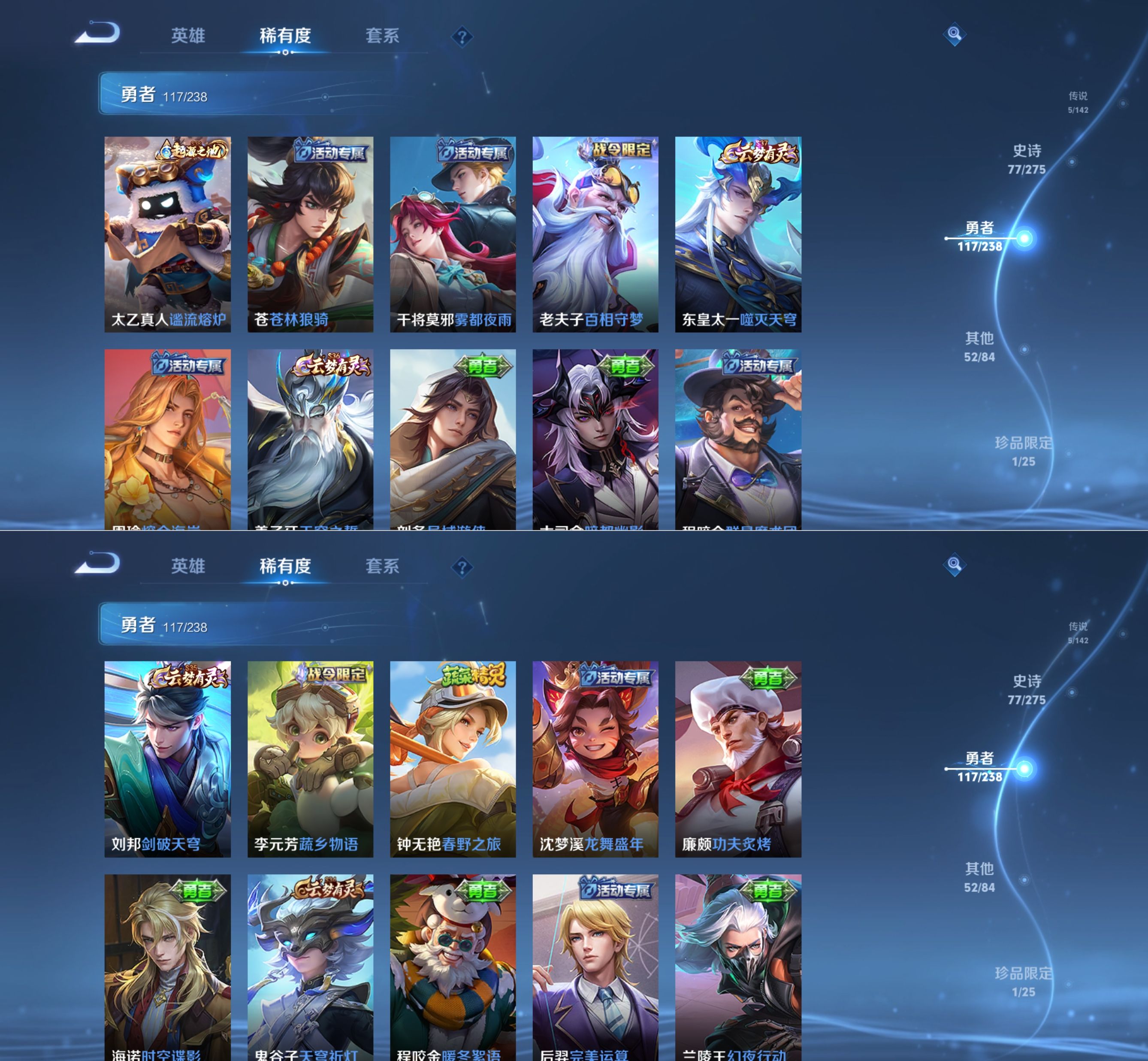 贵族等级:v6皮肤数:253传说品质5 情人节限定1 珍品传说1 荣耀典藏1 英雄数:127