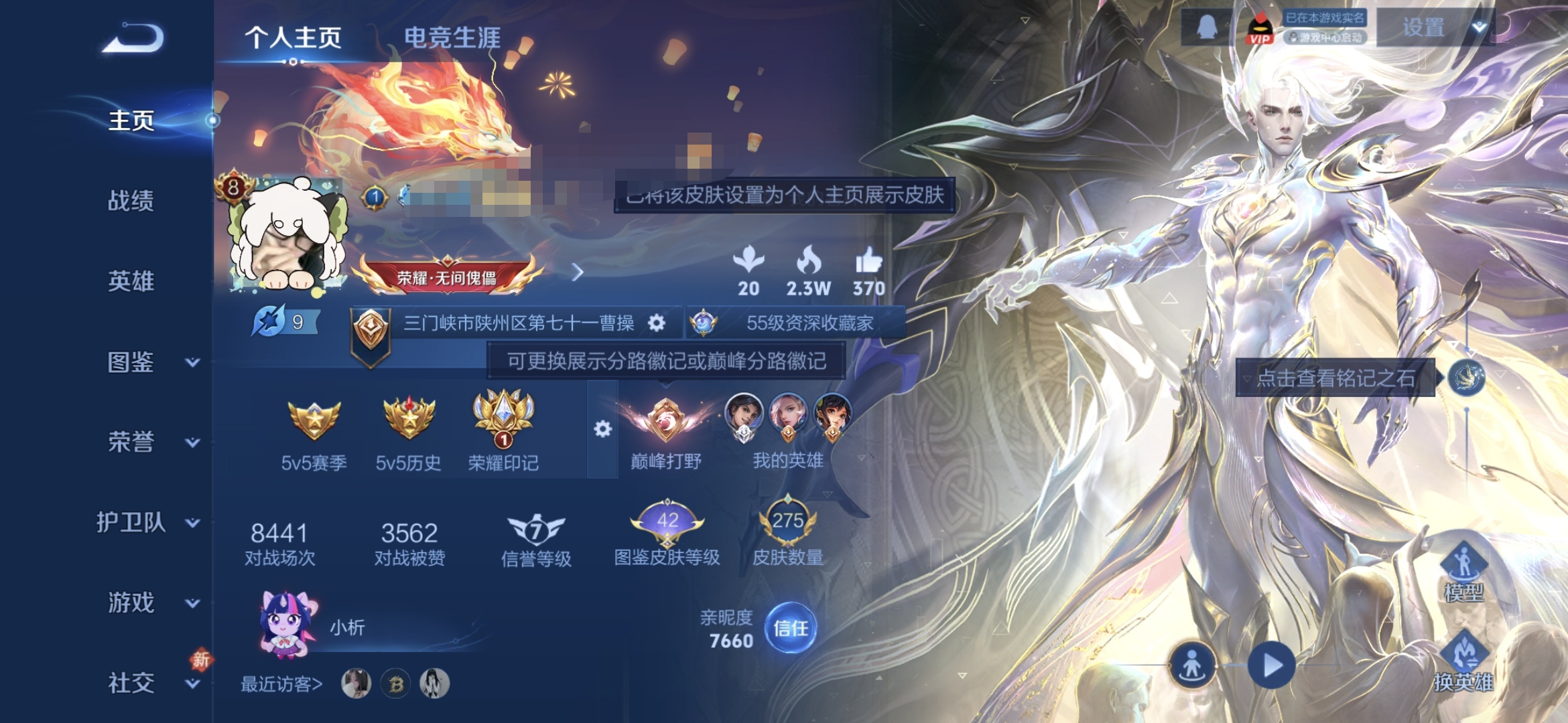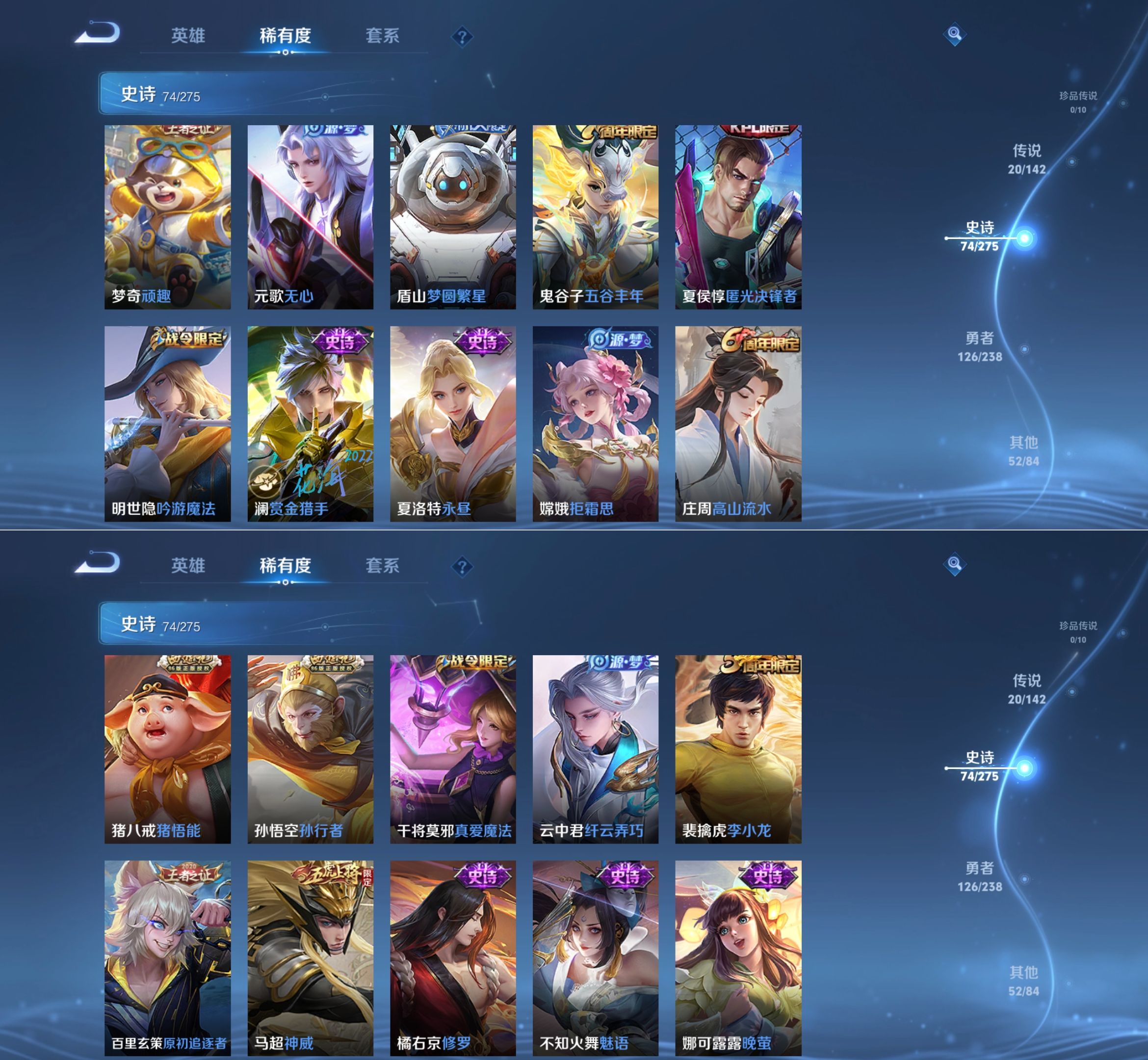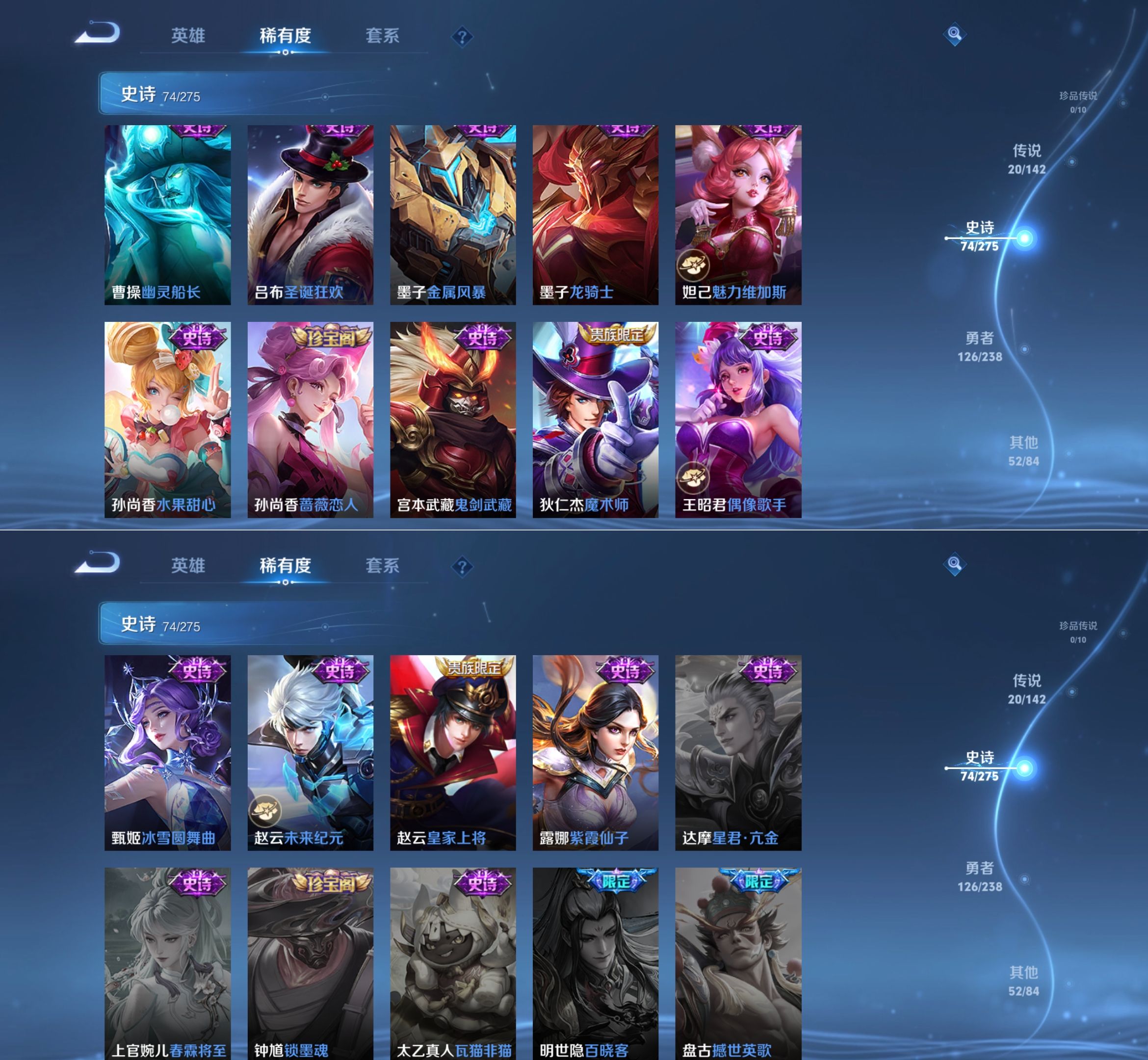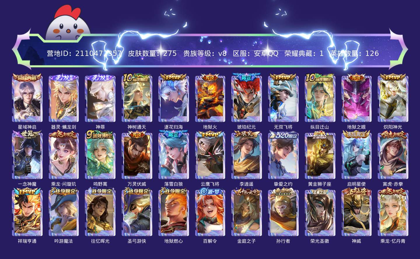 贵族等级:v8皮肤数:275传说品质20 荣耀典藏1 生肖限定5 无双2 英雄数:126