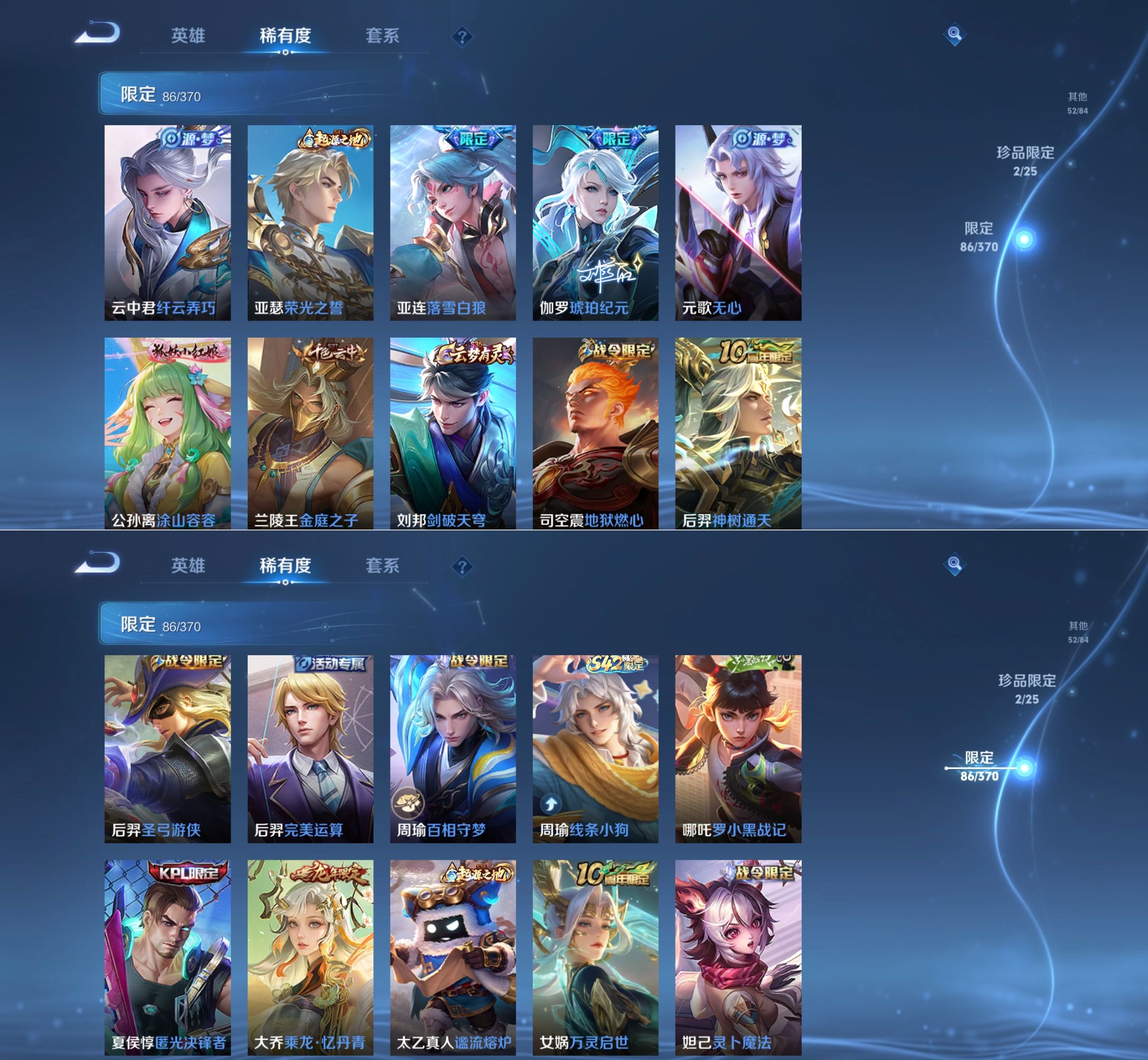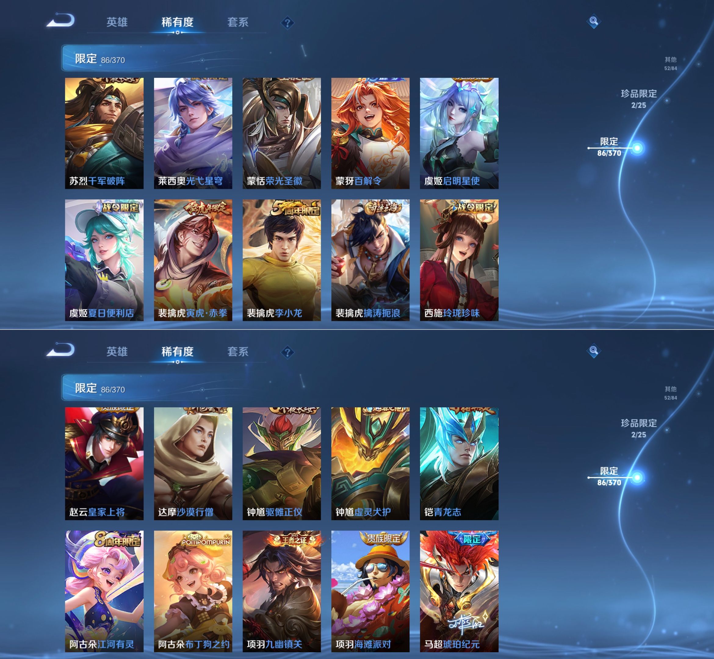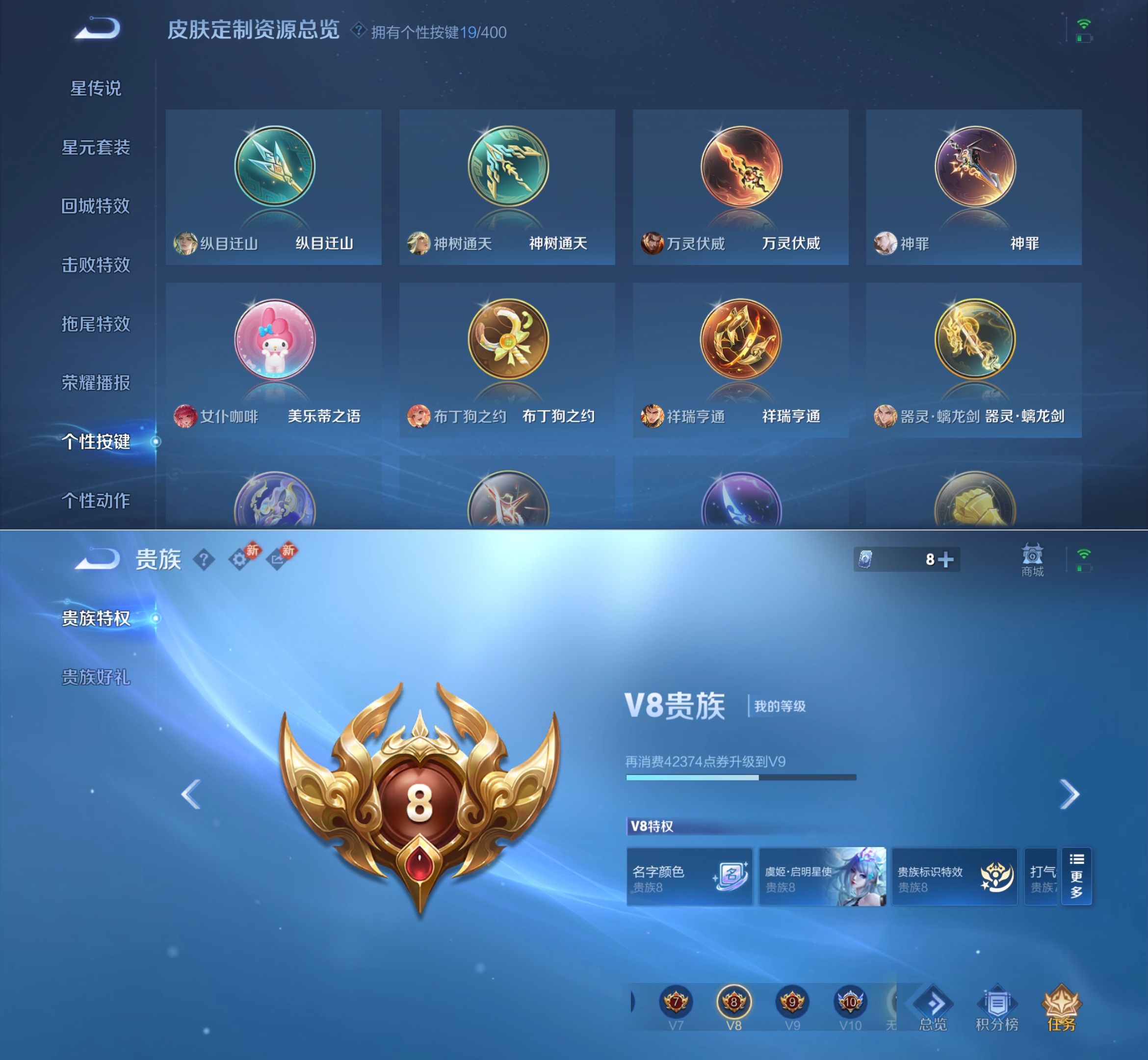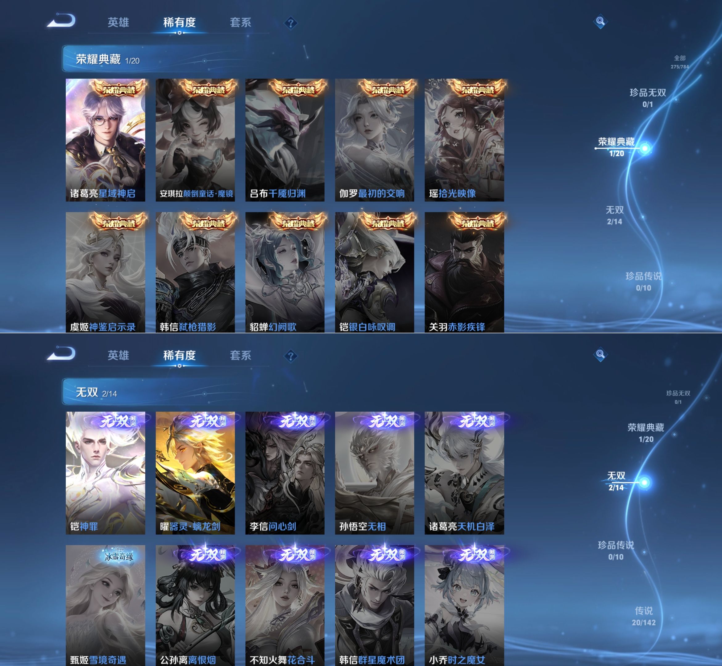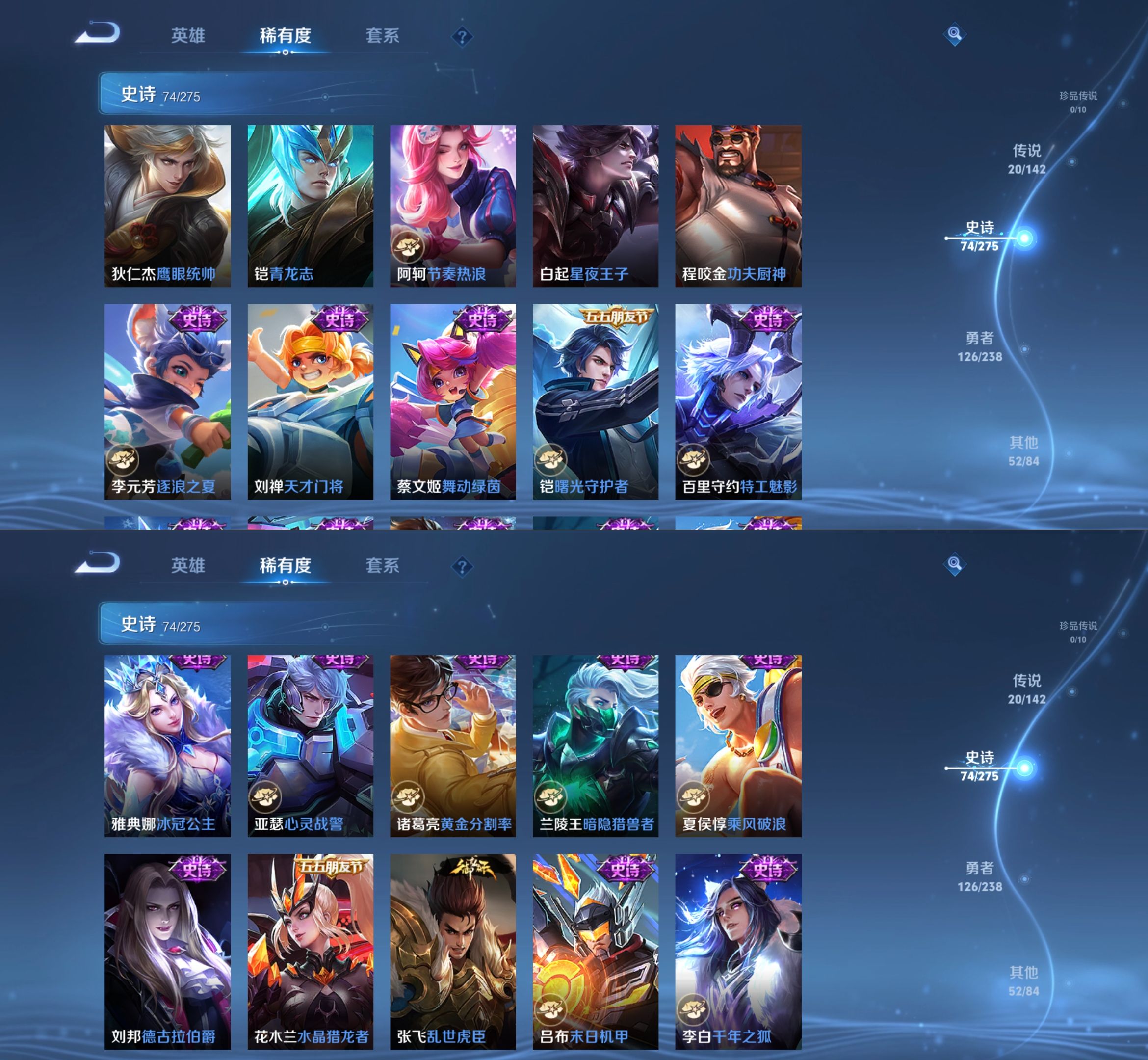 贵族等级:v8皮肤数:275传说品质20 荣耀典藏1 生肖限定5 无双2 英雄数:126