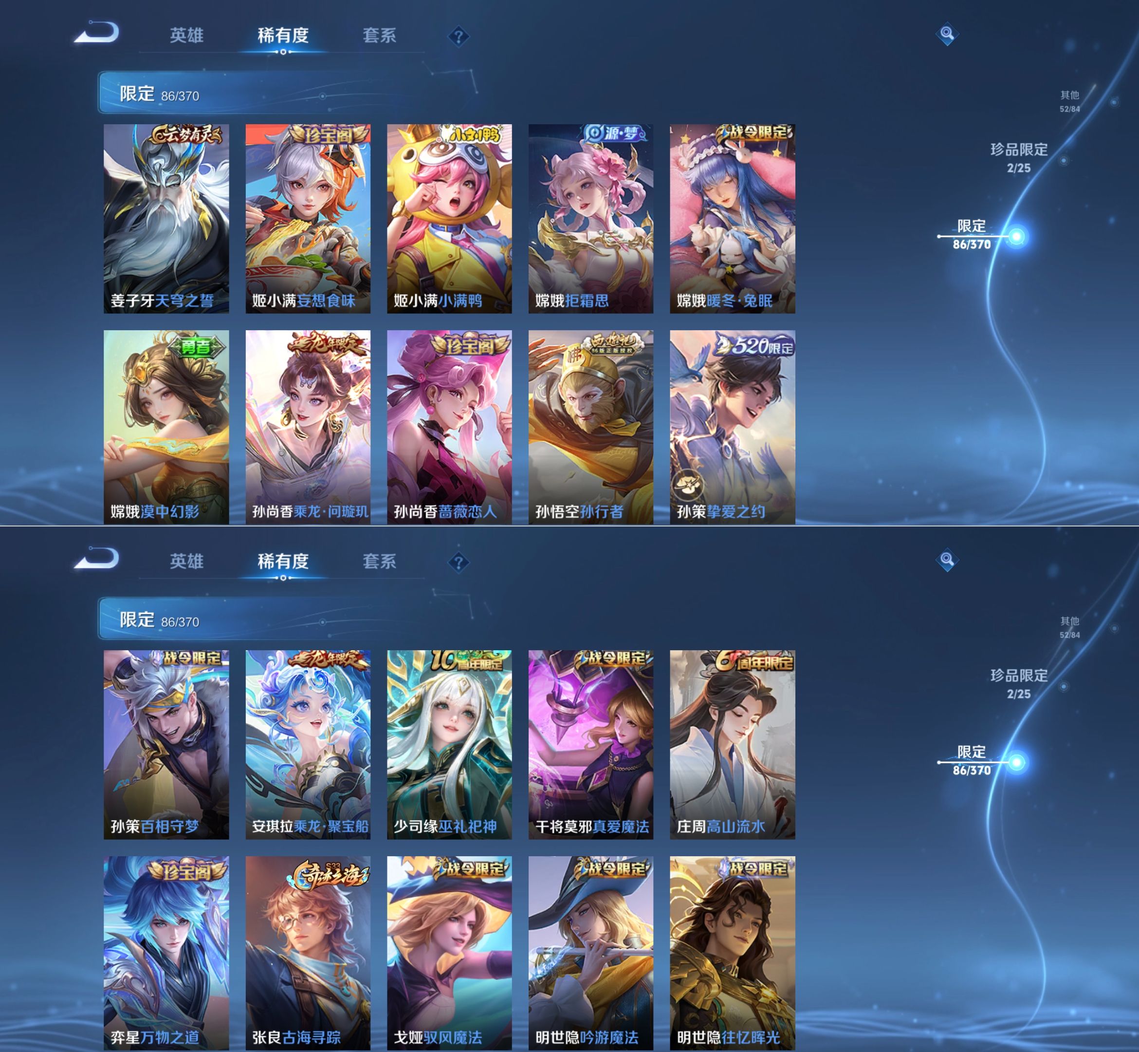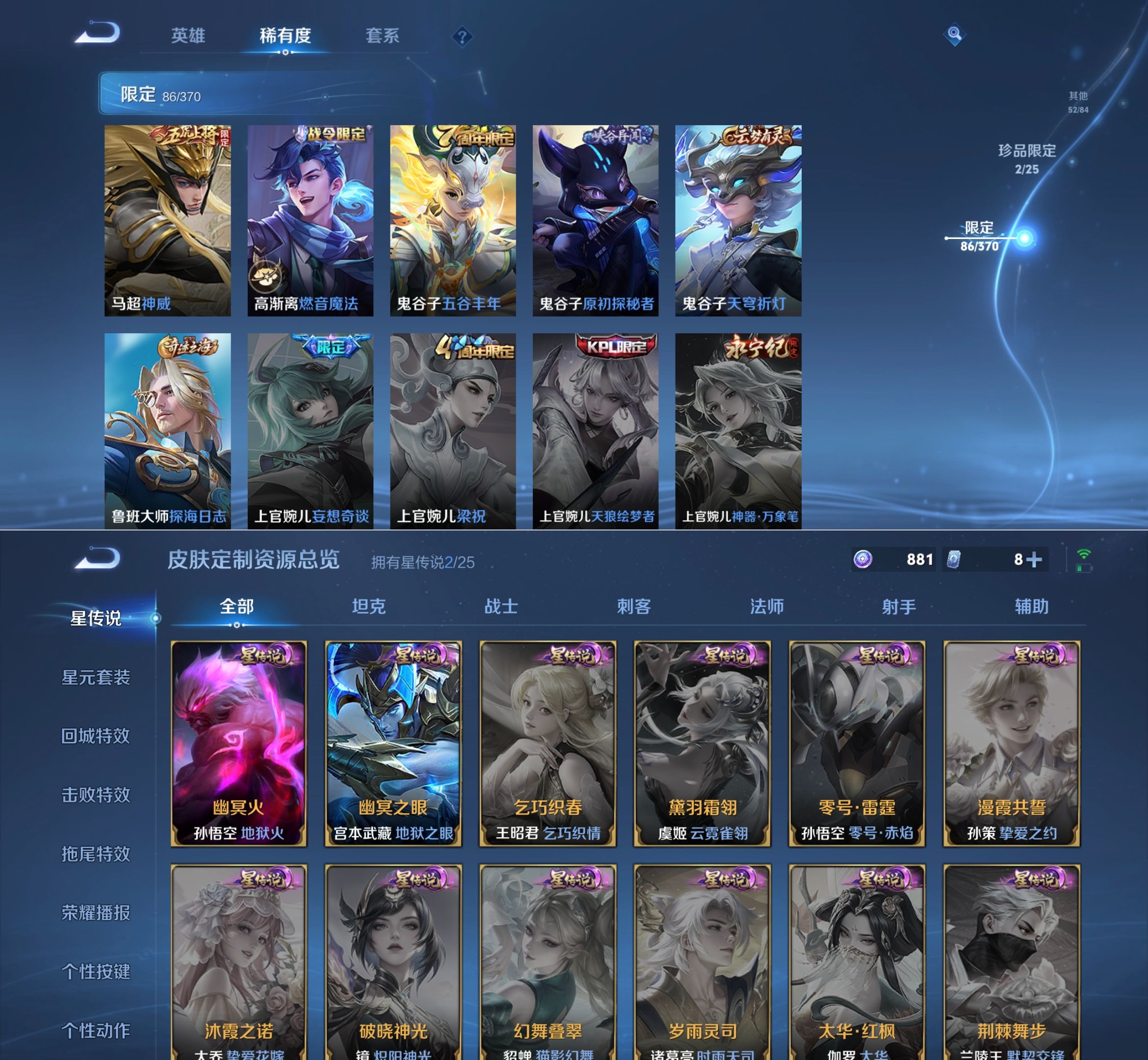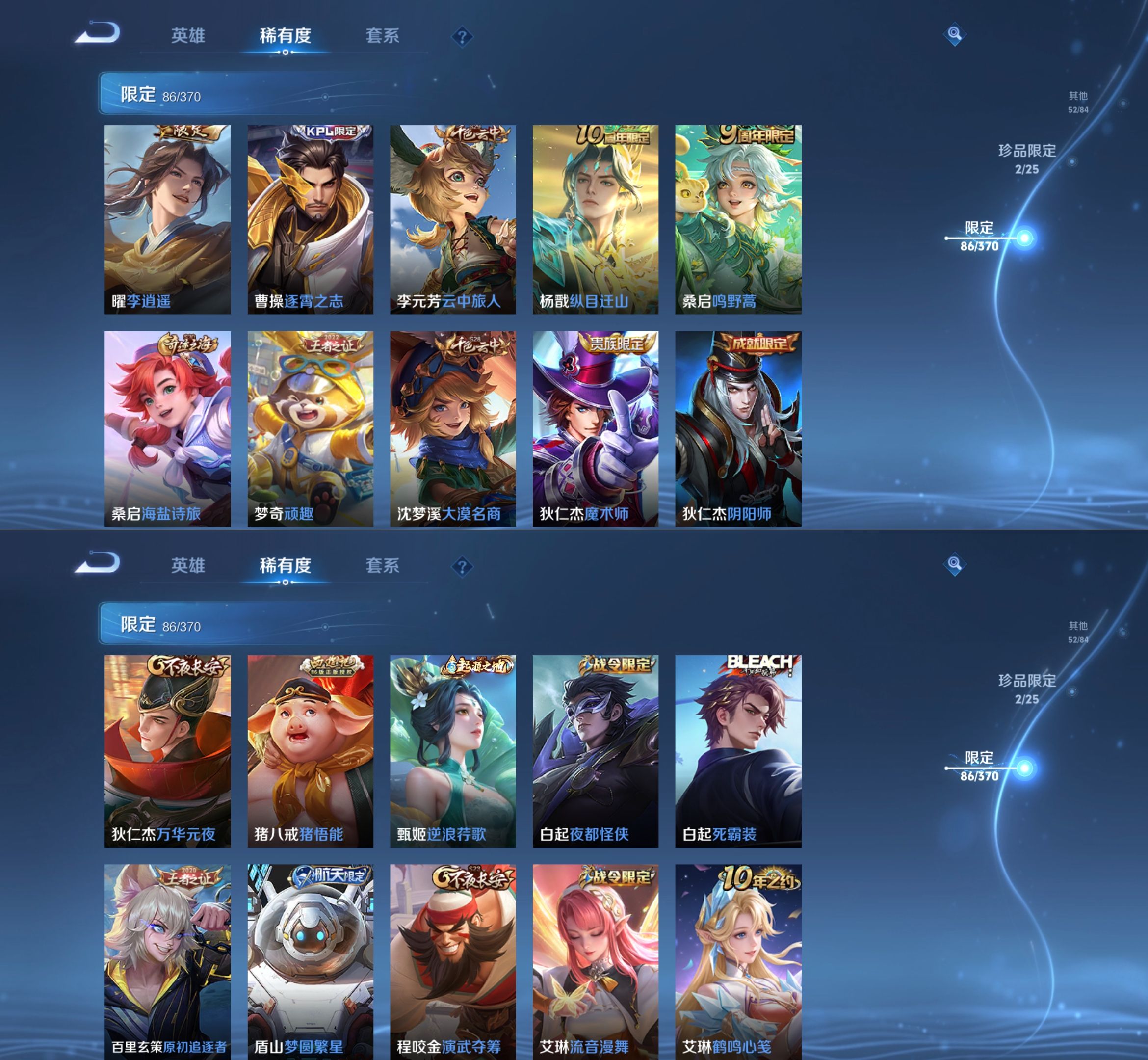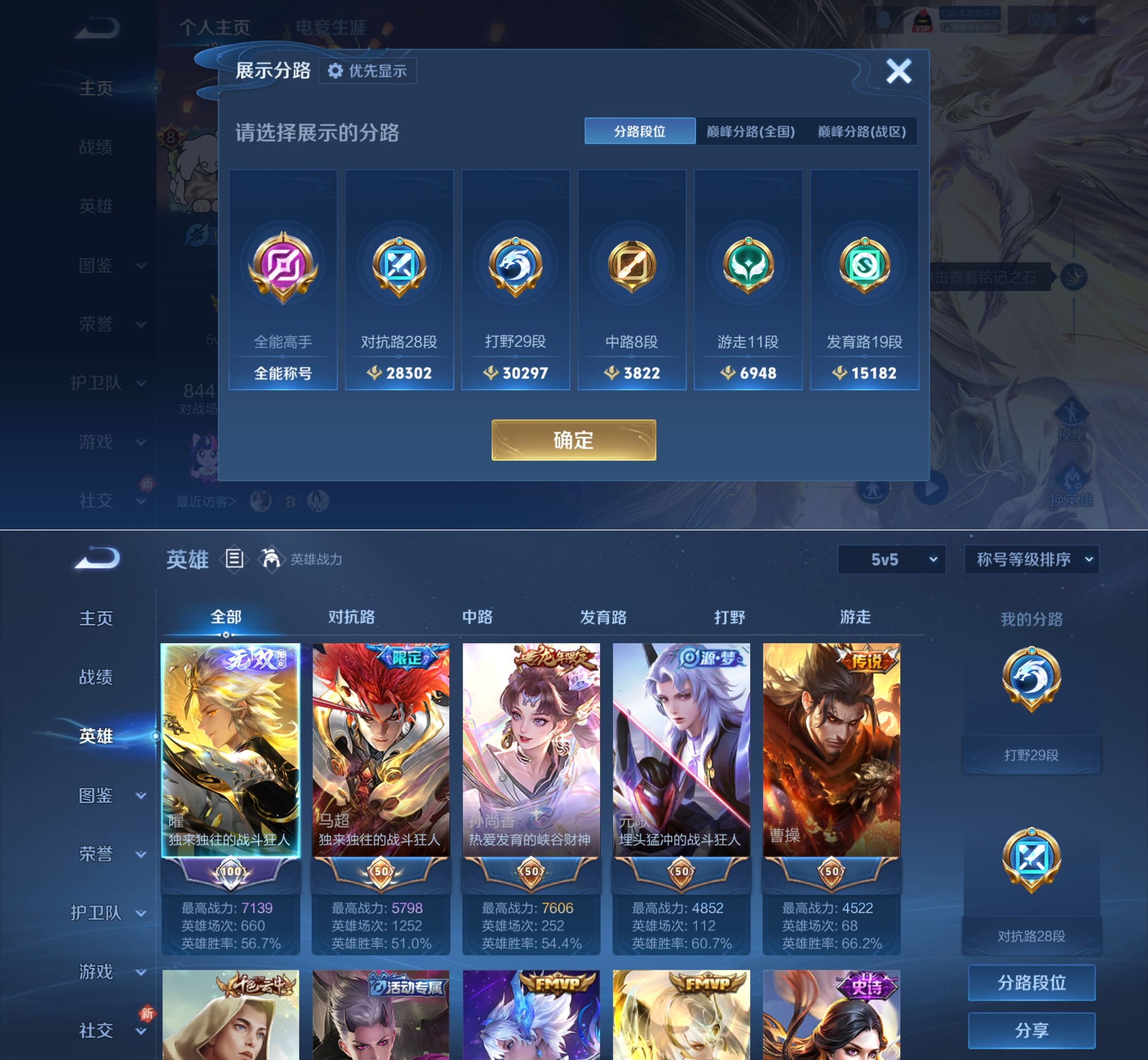 贵族等级:v8皮肤数:275传说品质20 荣耀典藏1 生肖限定5 无双2 英雄数:126