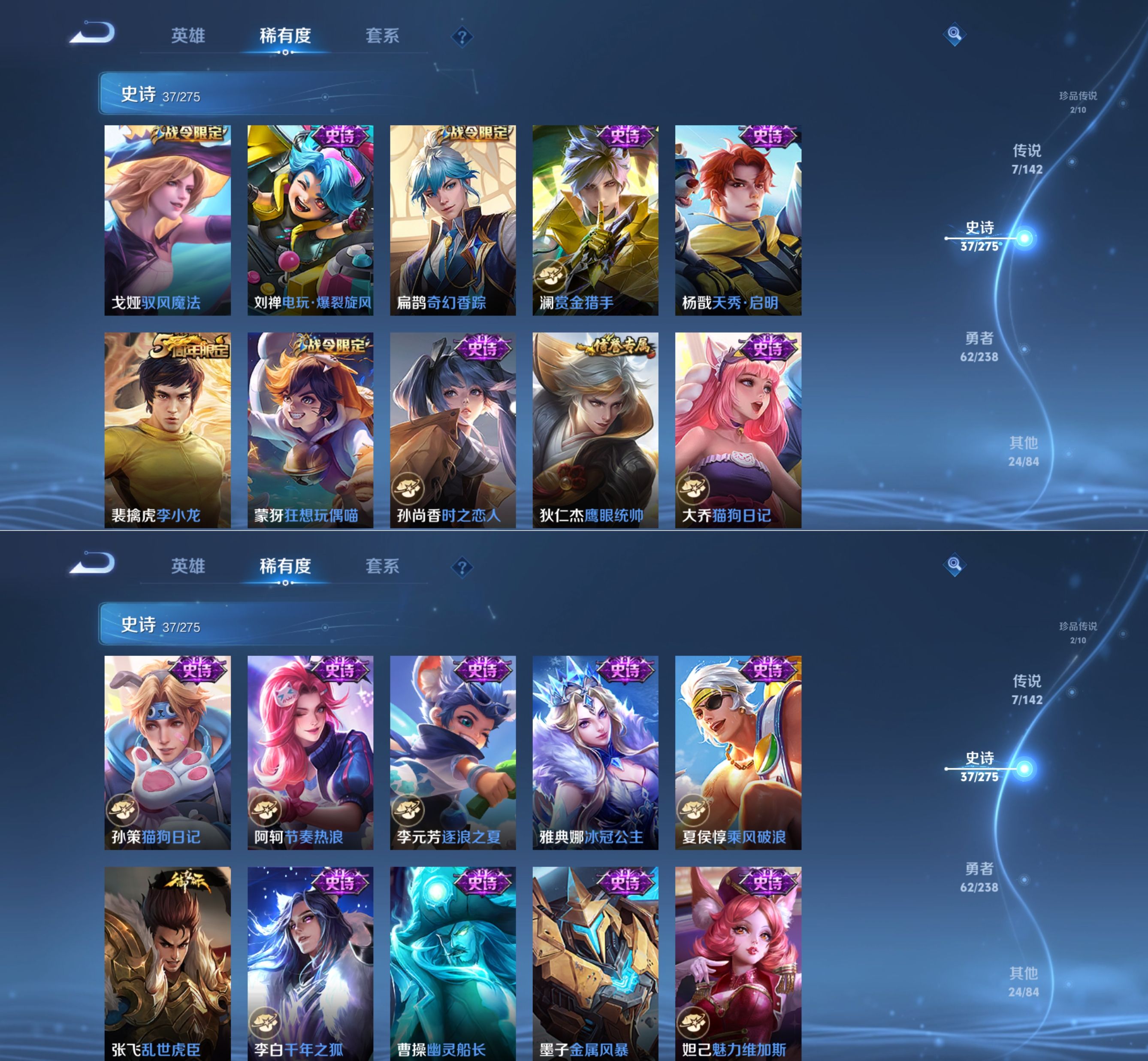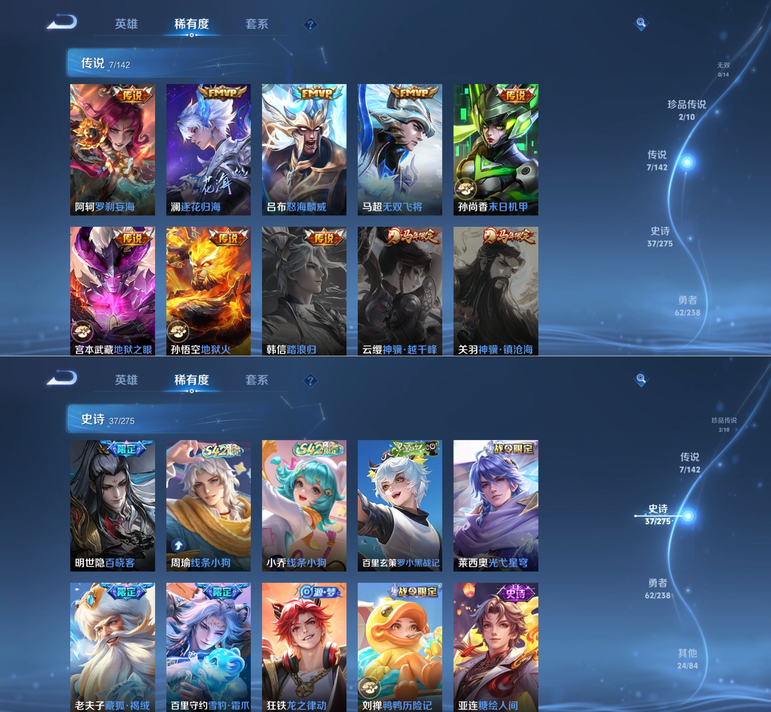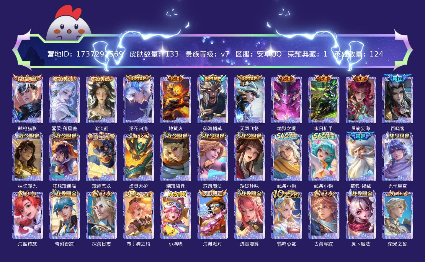 贵族等级:v7皮肤数:141传说品质7 珍品传说2 荣耀典藏1 英雄数:124