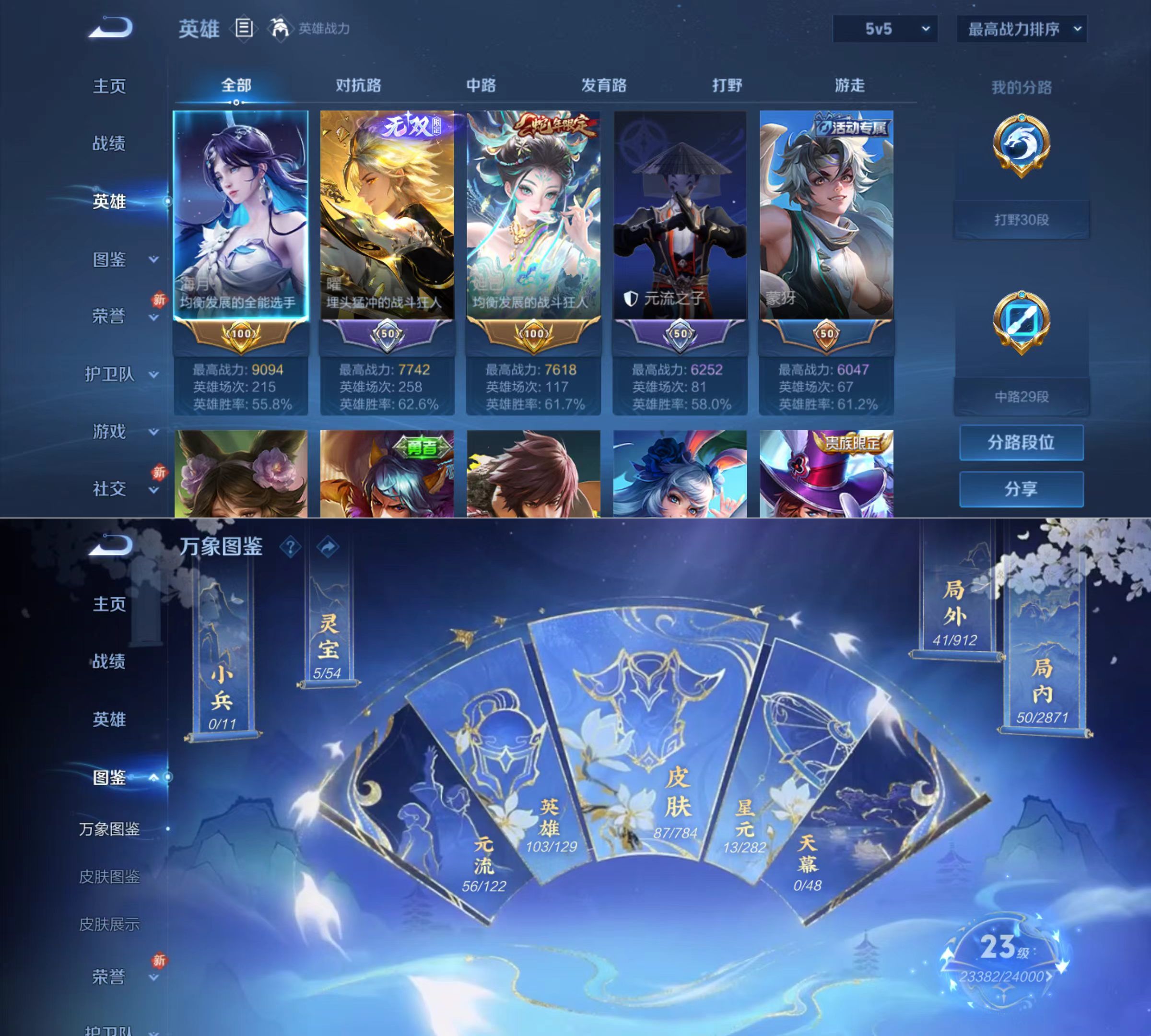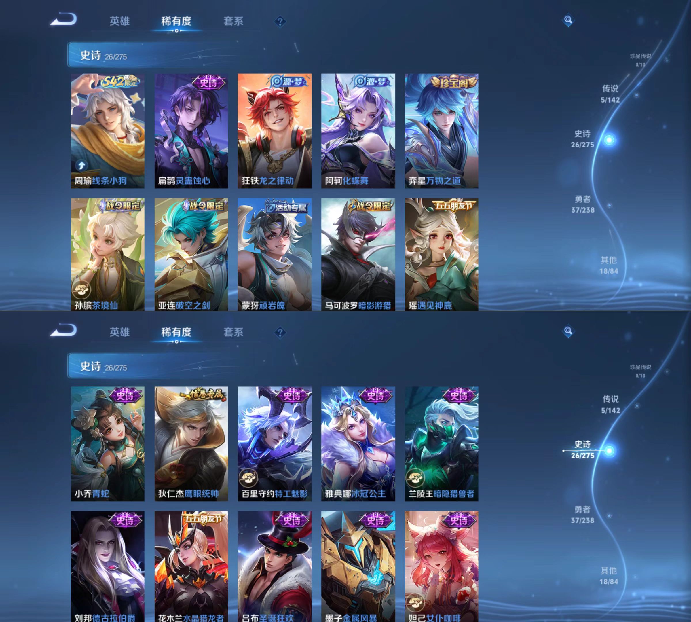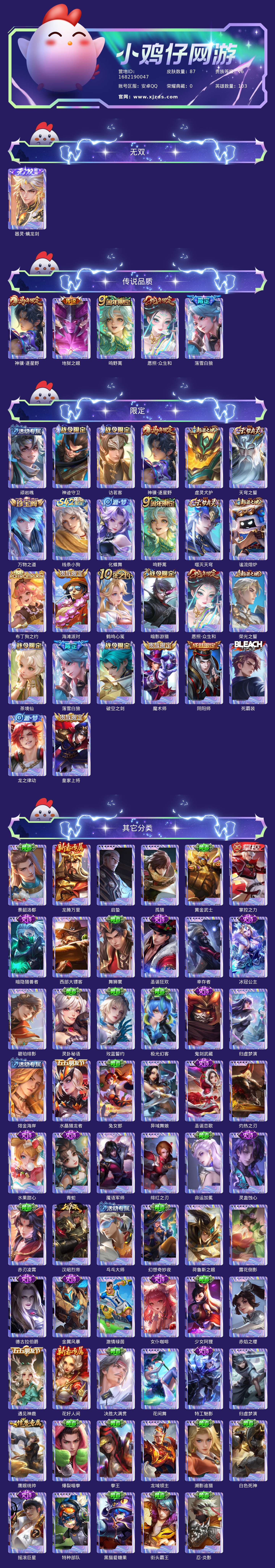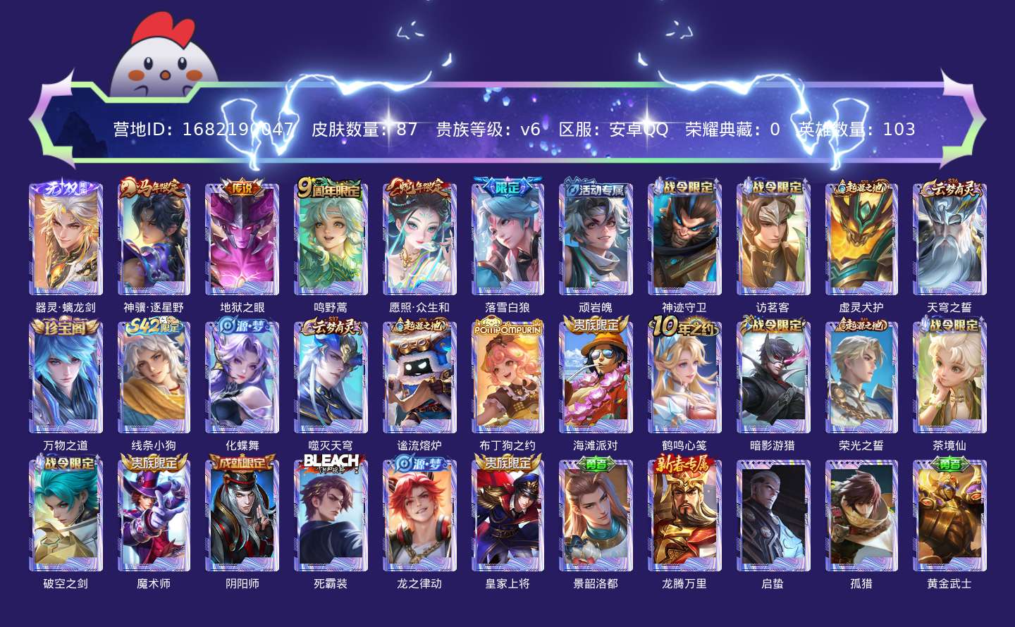 贵族等级:v6皮肤数:87传说品质5 生肖限定2 无双1 英雄数:103