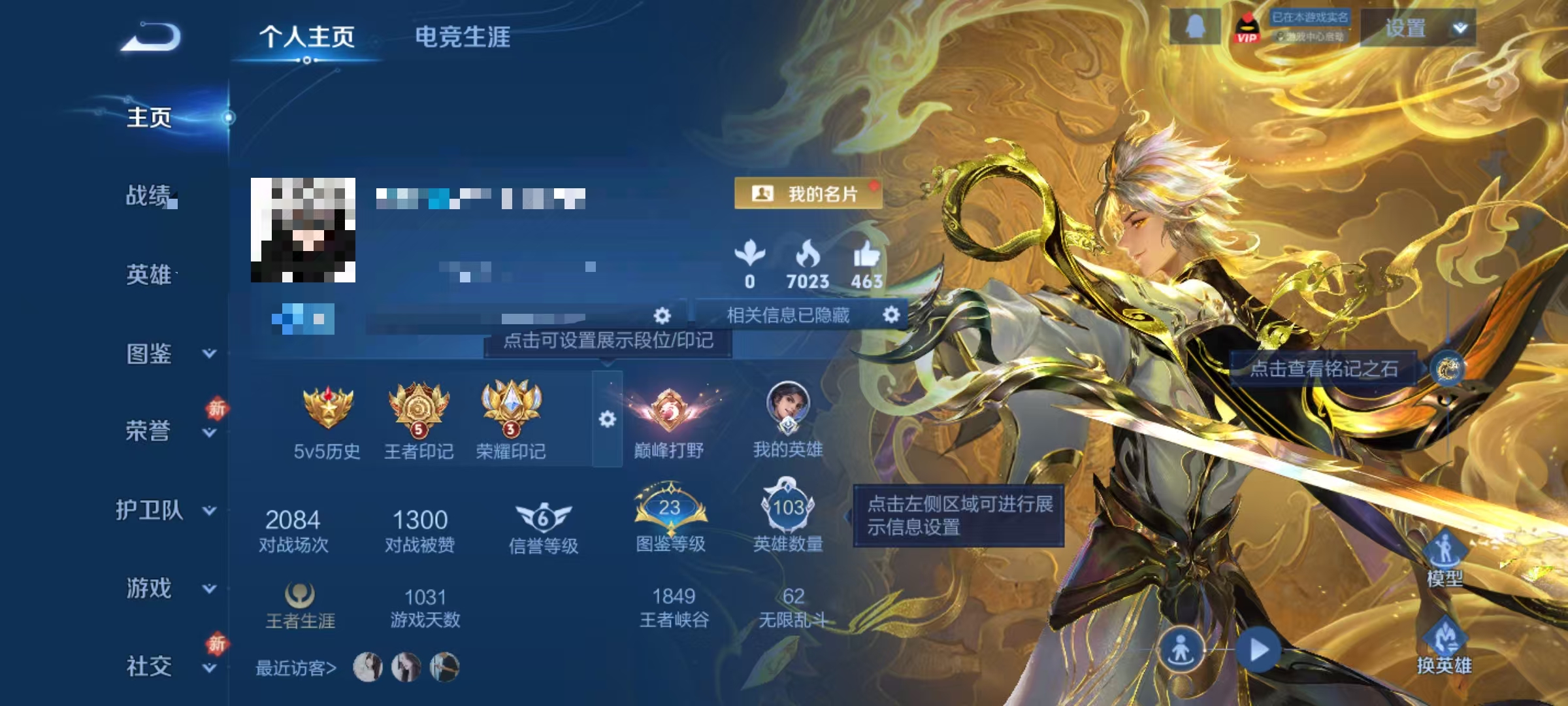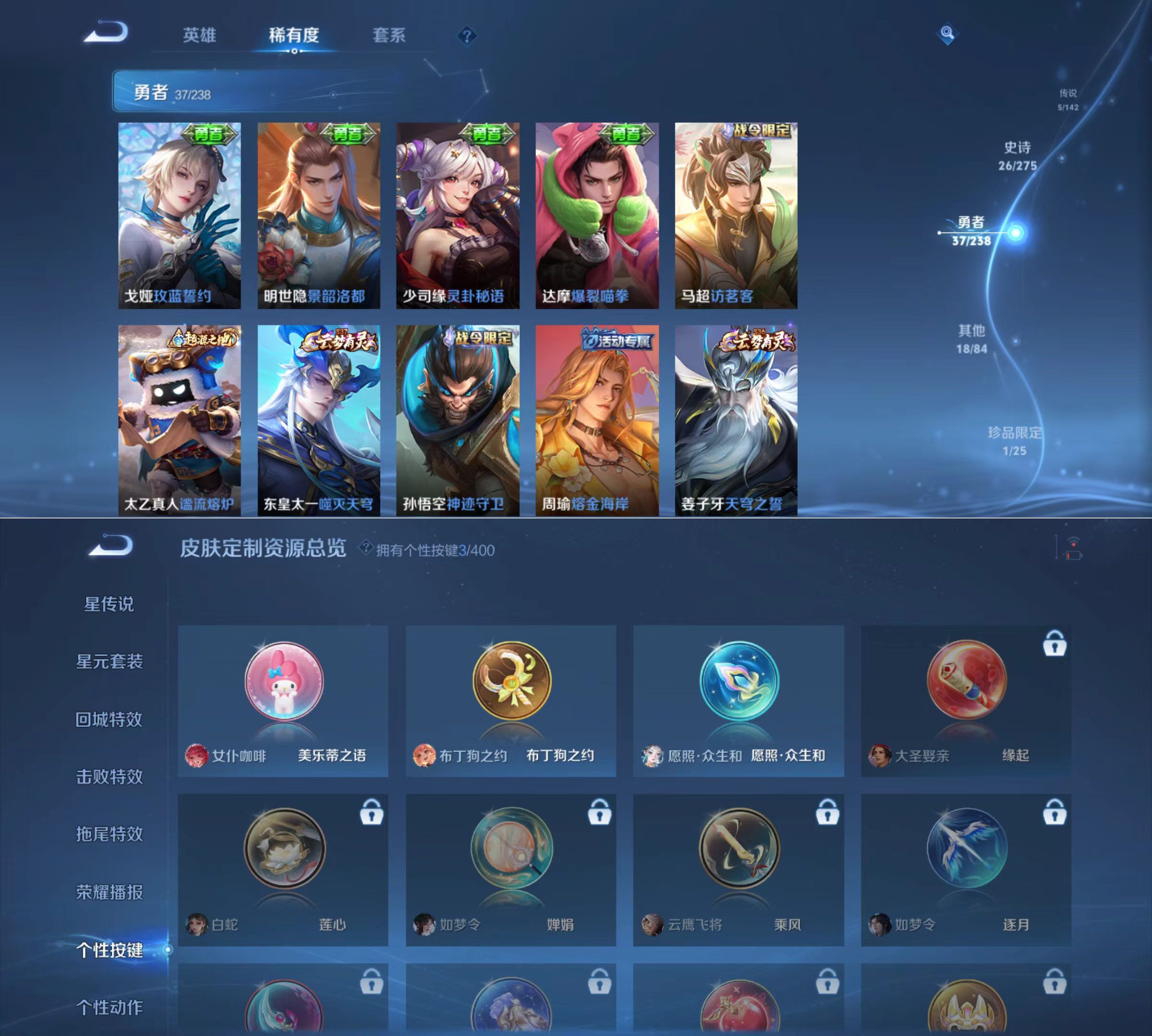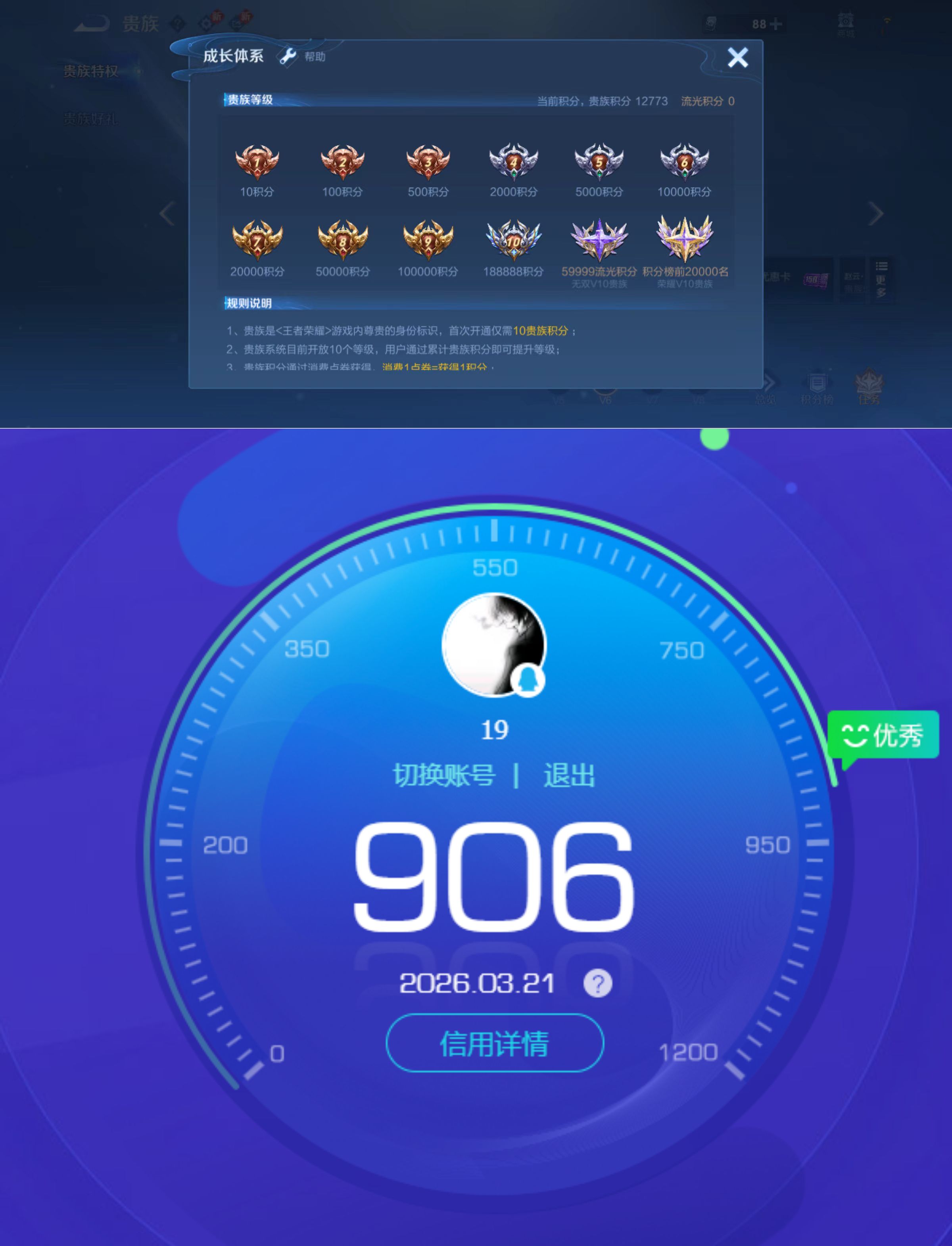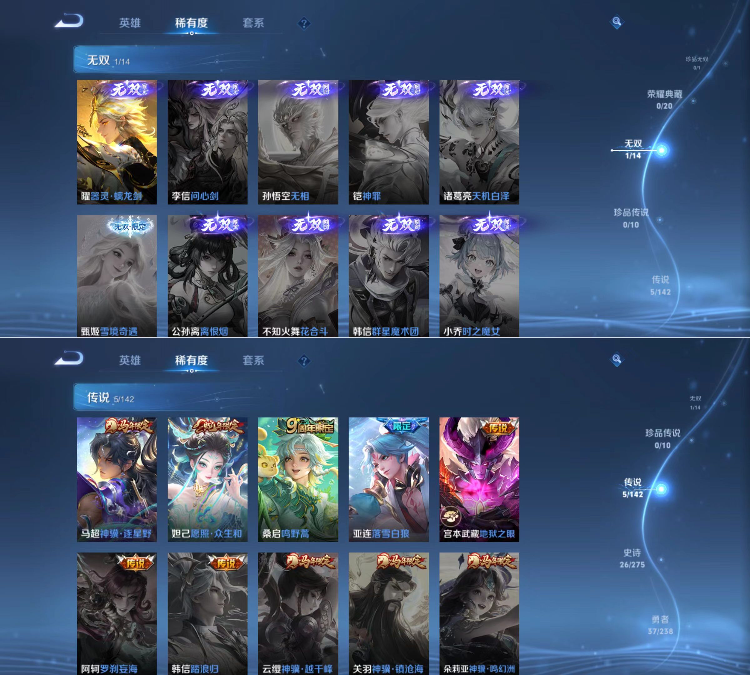 贵族等级:v6皮肤数:87传说品质5 生肖限定2 无双1 英雄数:103