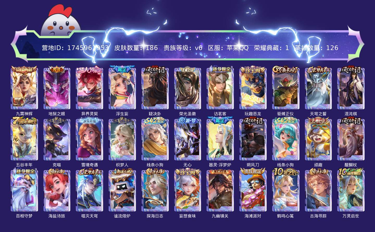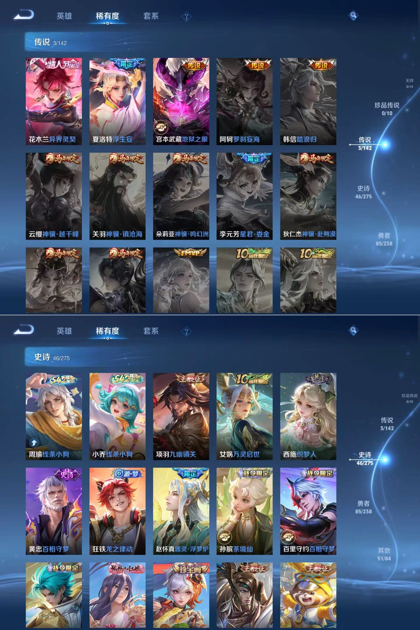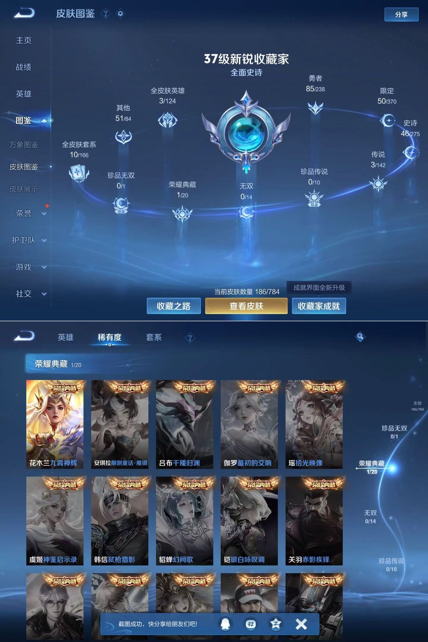 贵族等级:v6皮肤数:186传说品质3 荣耀典藏1 情人节限定1 英雄数:126
