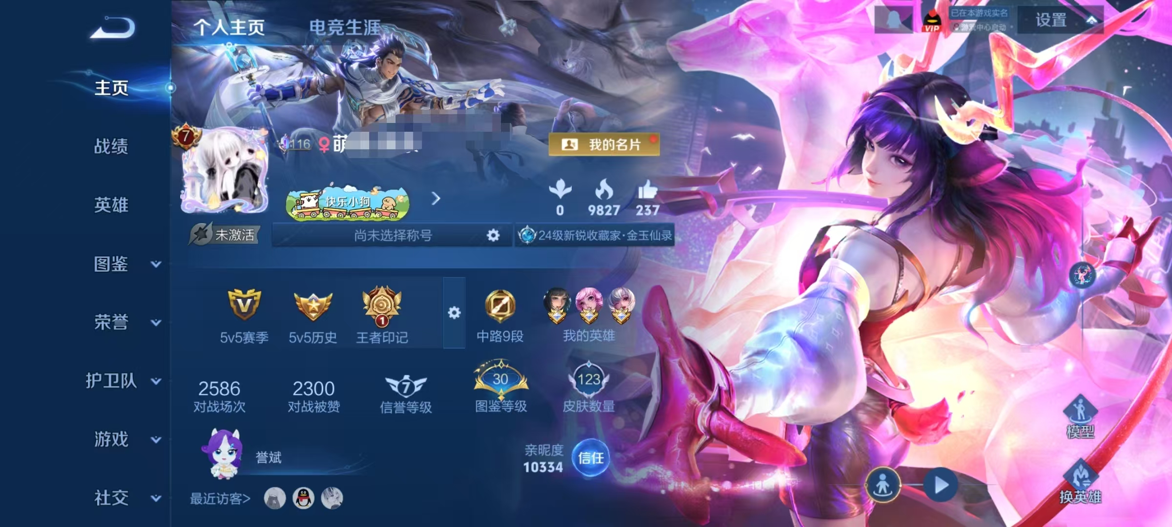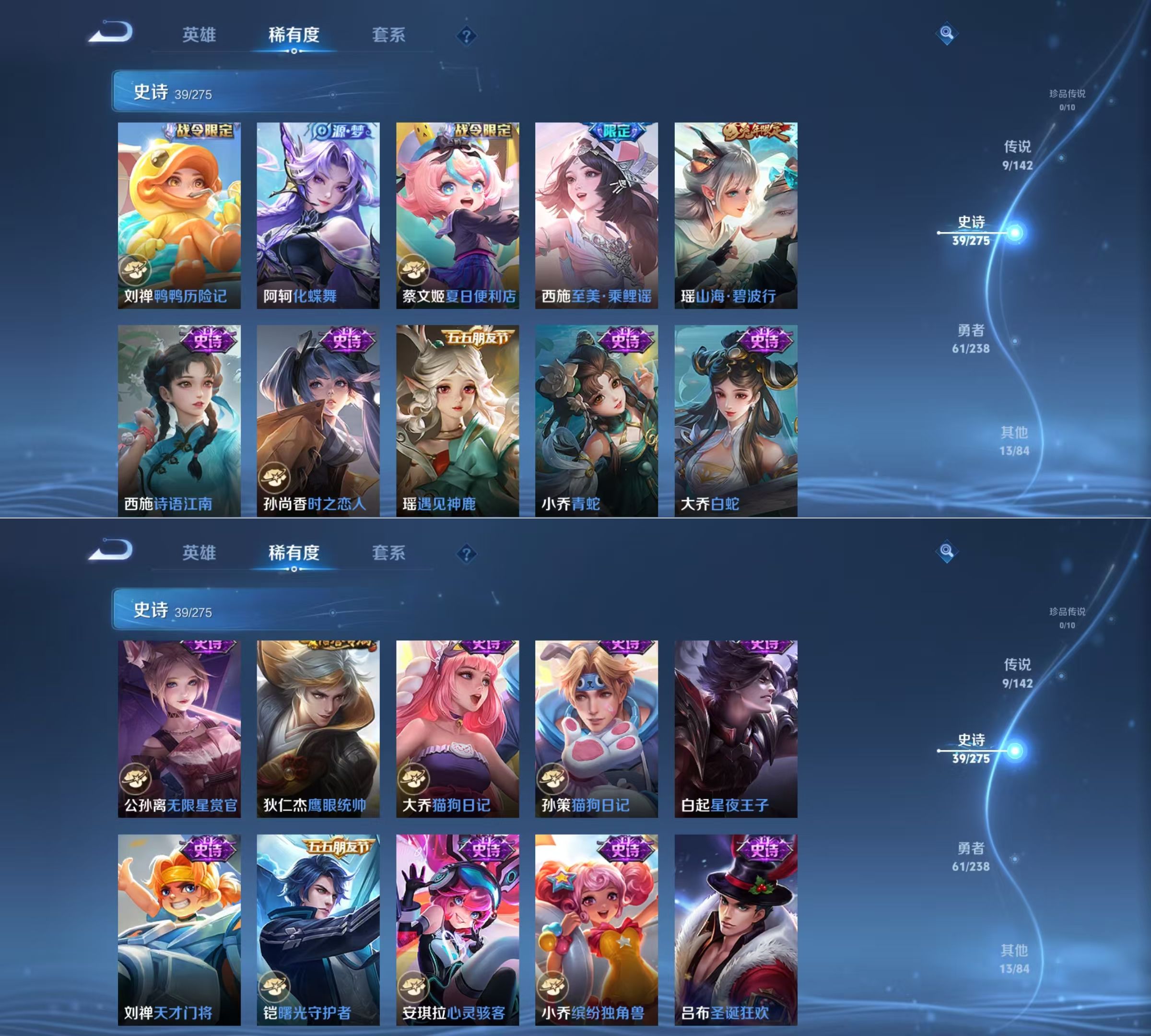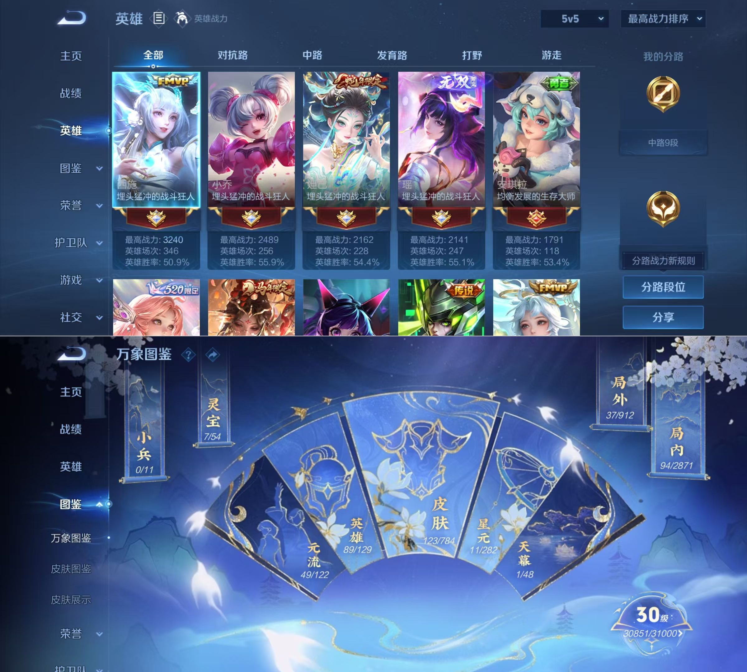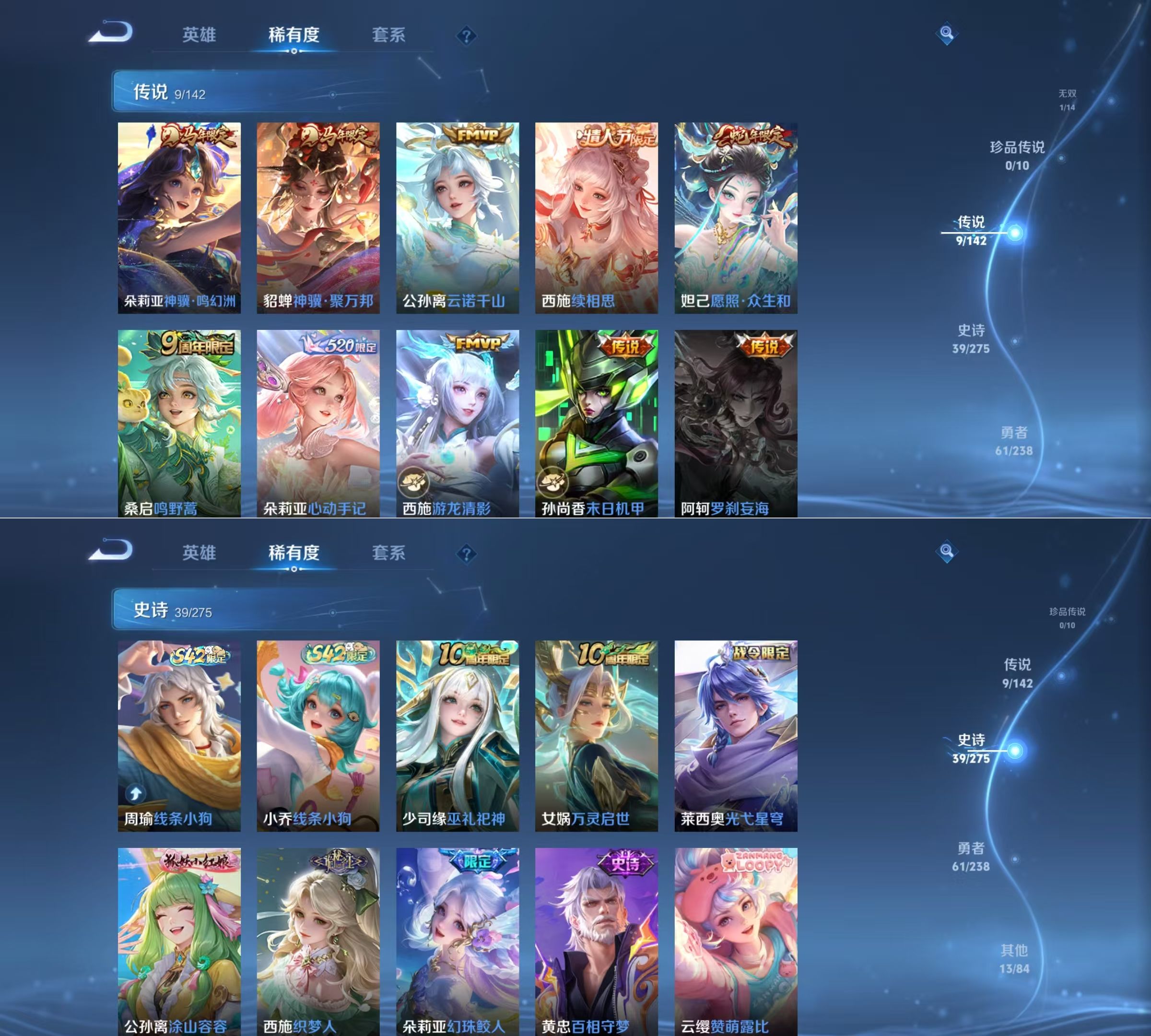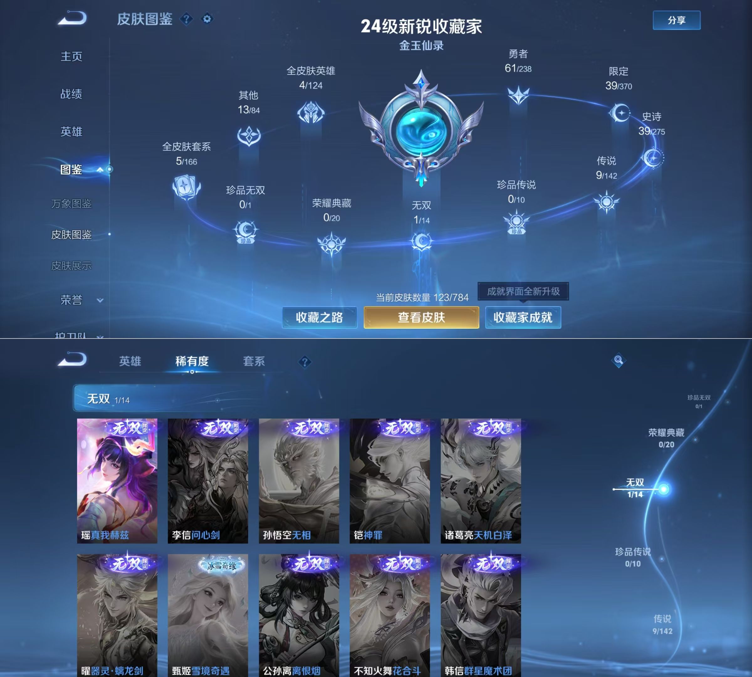 贵族等级:v7皮肤数:123传说品质9 情人节限定1 生肖限定4 无双1 英雄数:89